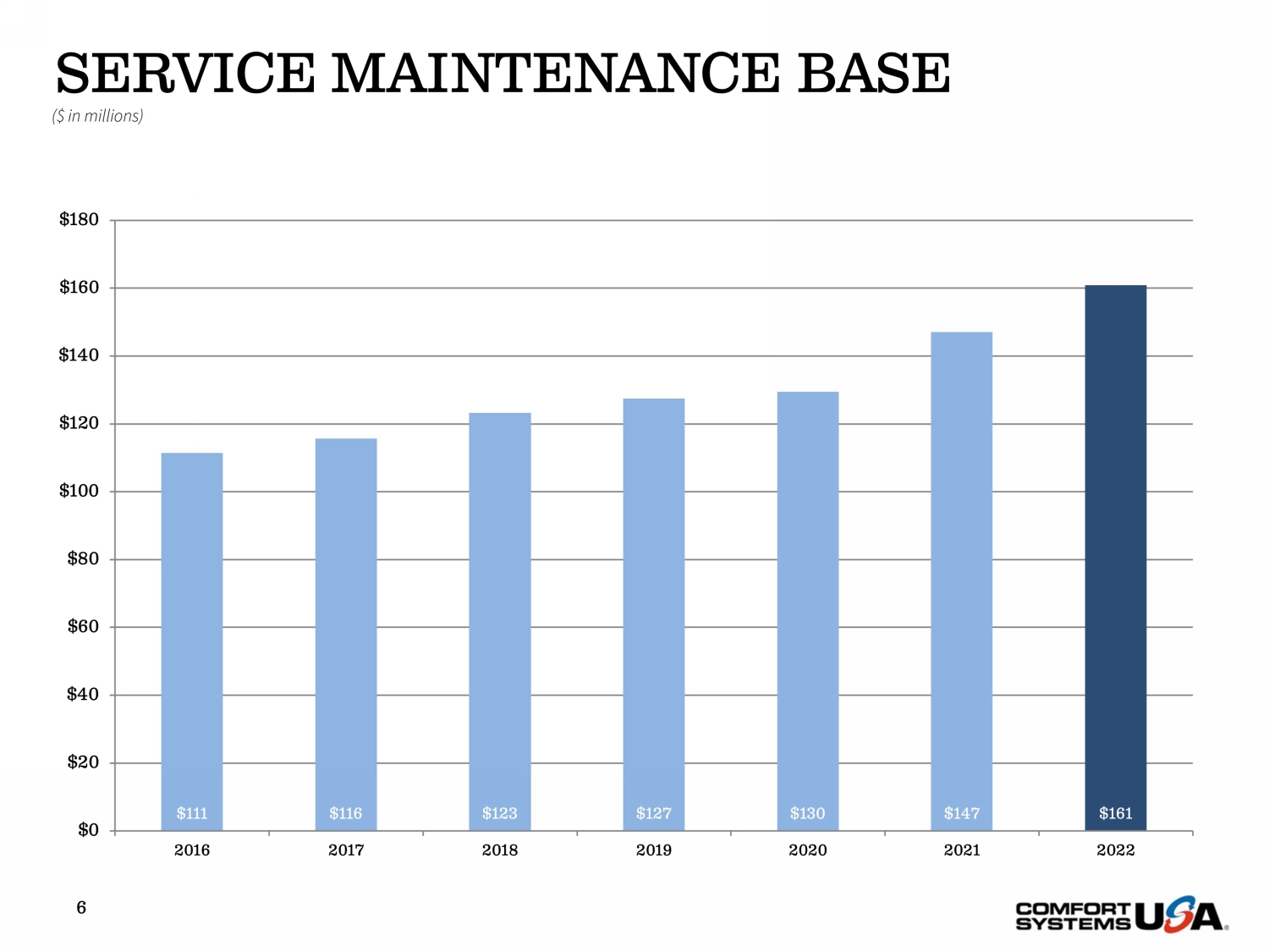 SERVICE MAINTENANCE BASE 6 $111 $116 $123 $127 $130 $147 $161 $0 $20 $40 $60 $80 $100 $120 $140 $160 $180 2016 2017 2018 2019 2020 2021 2022 ($ in millions)