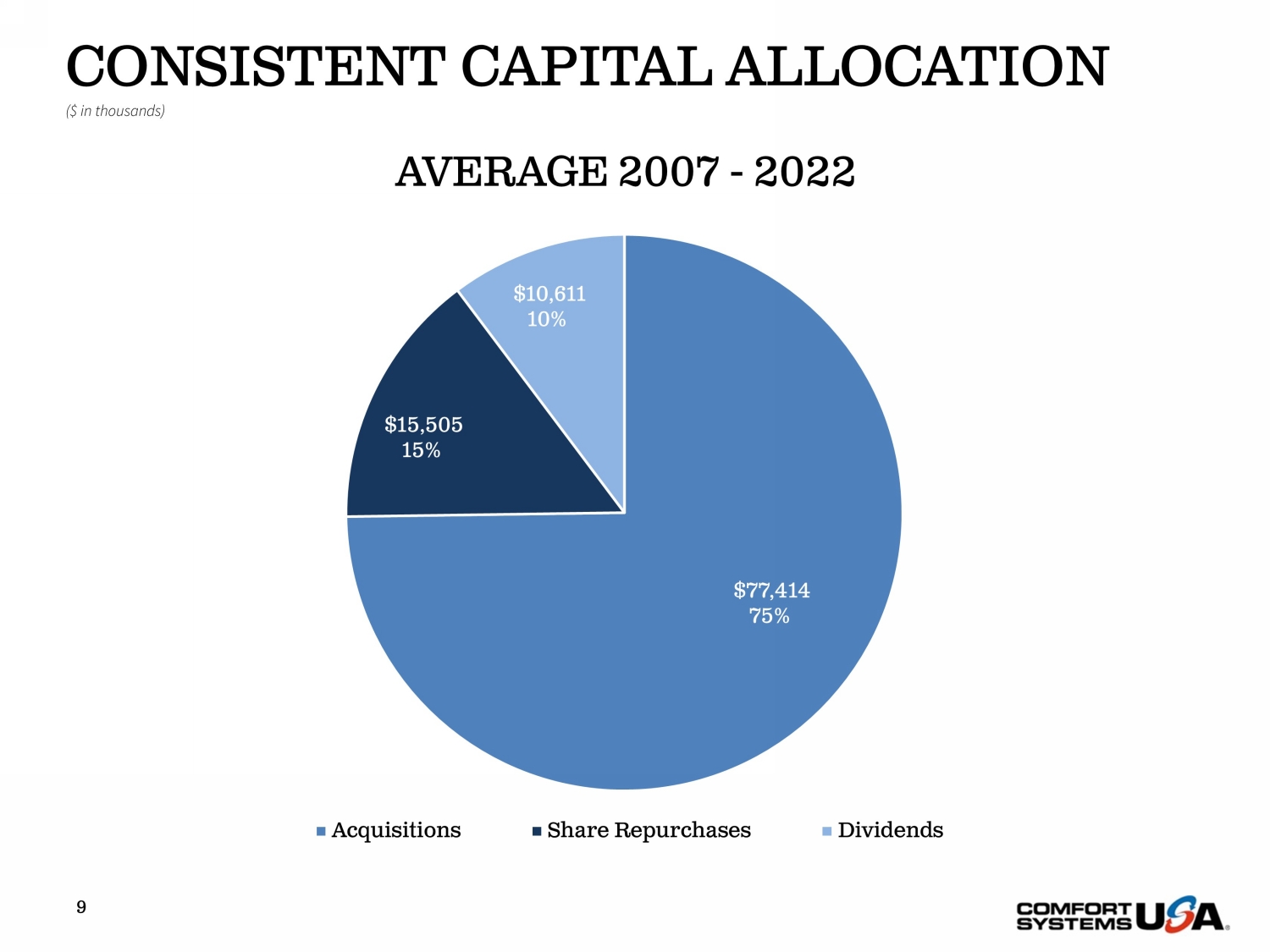9 CONSISTENT CAPITAL ALLOCATION ($ in thousands) $77,414 75% $15,505 15% $10,611 10% AVERAGE 2007 - 2022 Acquisitions Share Repurchases Dividends