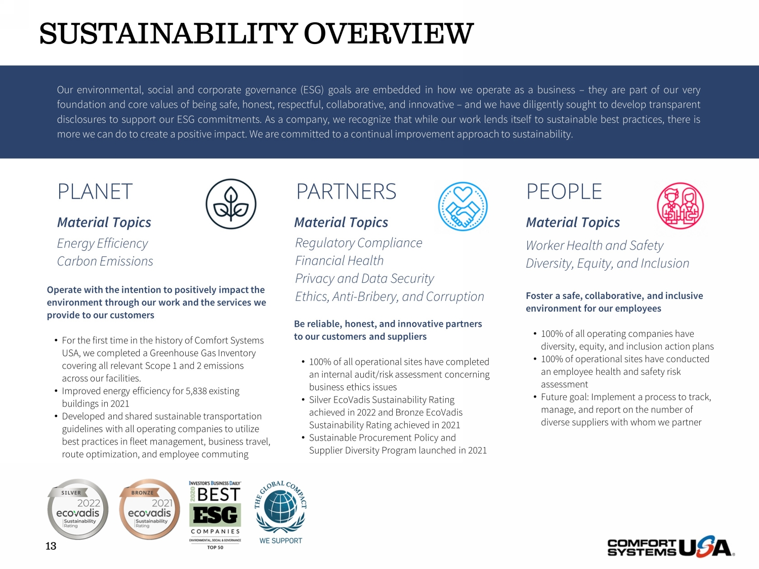 Foster a safe, collaborative, and inclusive environment for our employees • 100% of all operating companies have diversity, equity, and inclusion action plans • 100% of operational sites have conducted an employee health and safety risk assessment • Future goal: Implement a process to track, manage, and report on the number of diverse suppliers with whom we partner Our environmental, social and corporate governance (ESG) goals are embedded in how we operate as a business – they are part of our very foundation and core values of being safe, honest, respectful, collaborative, and innovative – and we have diligently sought to develop transparent disclosures to support our ESG commitments . As a company, we recognize that while our work lends itself to sustainable best practices, there is more we can do to create a positive impact . We are committed to a continual improvement approach to sustainability . PEOPLE PARTNERS PLANET Be reliable, honest, and innovative partners to our customers and suppliers • 100% of all operational sites have completed an internal audit/risk assessment concerning business ethics issues • Silver EcoVadis Sustainability Rating achieved in 2022 and Bronze EcoVadis Sustainability Rating achieved in 2021 • Sustainable Procurement Policy and Supplier Diversity Program launched in 2021 Operate with the intention to positively impact the environment through our work and the services we provide to our customers • For the first time in the history of Comfort Systems USA, we completed a Greenhouse Gas Inventory covering all relevant Scope 1 and 2 emissions across our facilities. • Improved energy efficiency for 5,838 existing buildings in 2021 • Developed and shared sustainable transportation guidelines with all operating companies to utilize best practices in fleet management, business travel, route optimization, and employee commuting Energy Efficiency Carbon Emissions Regulatory Compliance Financial Health Privacy and Data Security Ethics, Anti - Bribery, and Corruption Worker Health and Safety Diversity, Equity, and Inclusion Material Topics Material Topics Material Topics SUSTAINABILITY OVERVIEW 13