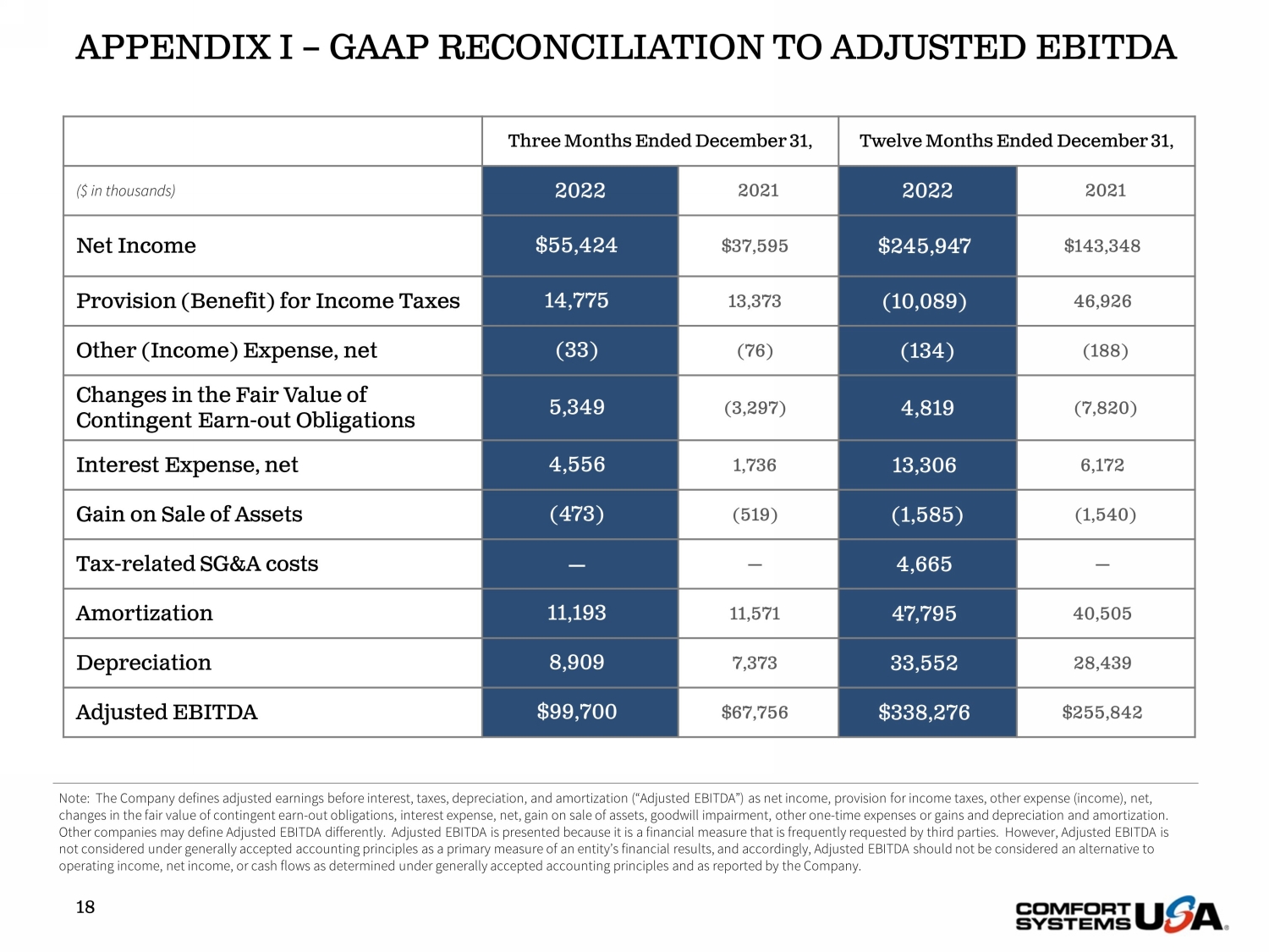 APPENDIX I – GAAP RECONCILIATION TO ADJUSTED EBITDA 18 Three Months Ended December 31, Twelve Months Ended December 31, ($ in thousands) 2022 2021 2022 2021 Net Income $55,424 $37,595 $245,947 $143,348 Provision (Benefit) for Income Taxes 14,775 13,373 (10,089) 46,926 Other (Income) Expense, net (33) (76) (134) (188) Changes in the Fair Value of Contingent Earn - out Obligations 5,349 (3,297) 4,819 (7,820) Interest Expense, net 4,556 1,736 13,306 6,172 Gain on Sale of Assets (473) (519) (1,585) (1,540) Tax - related SG&A costs — — 4,665 — Amortization 11,193 11,571 47,795 40,505 Depreciation 8,909 7,373 33,552 28,439 Adjusted EBITDA $99,700 $67,756 $338,276 $255,842 Note: The Company defines adjusted earnings before interest, taxes, depreciation, and amortization (“Adjusted EBITDA”) as ne t i ncome, provision for income taxes, other expense (income), net, changes in the fair value of contingent earn - out obligations, interest expense, net, gain on sale of assets, goodwill impairment , other one - time expenses or gains and depreciation and amortization. Other companies may define Adjusted EBITDA differently. Adjusted EBITDA is presented because it is a financial measure that is frequently requested by third parties. However, Adjusted EBITDA is not considered under generally accepted accounting principles as a primary measure of an entity’s financial results, and acco rdi ngly, Adjusted EBITDA should not be considered an alternative to operating income, net income, or cash flows as determined under generally accepted accounting principles and as reported by t he Company.