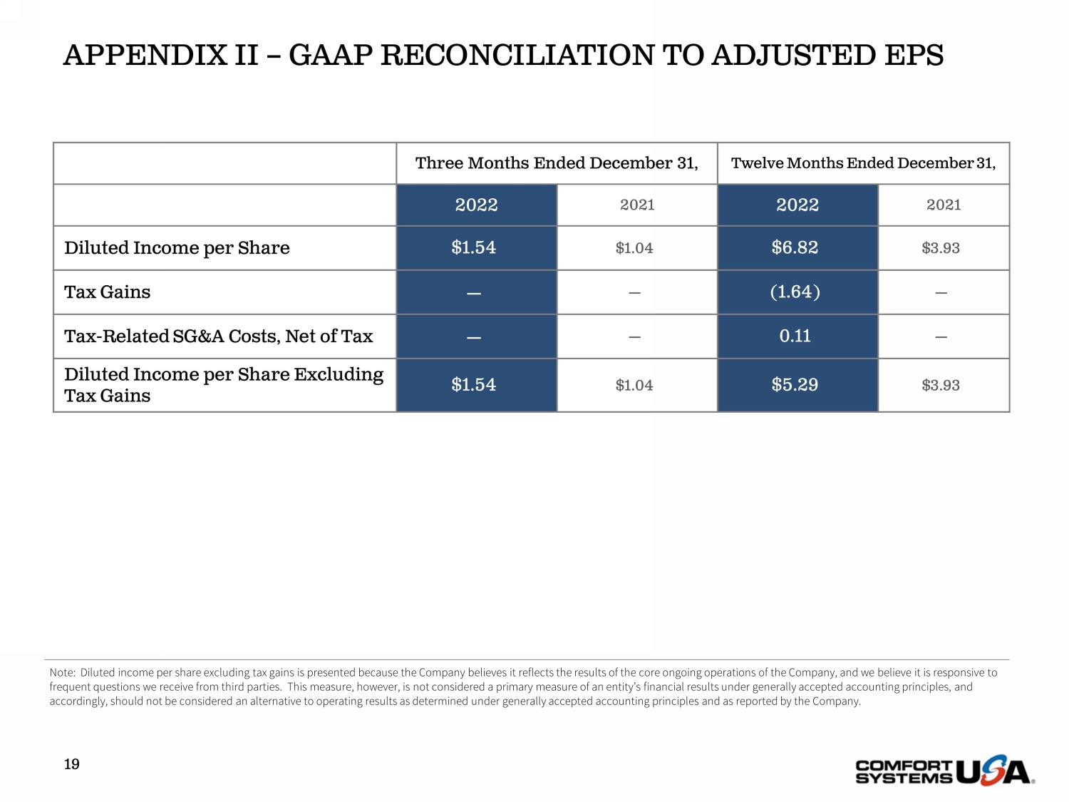APPENDIX II – GAAP RECONCILIATION TO ADJUSTED EPS 19 Three Months Ended December 31, Twelve Months Ended December 31, 2022 2021 2022 2021 Diluted Income per Share $1.54 $1.04 $6.82 $3.93 Tax Gains — — (1.64) — Tax - Related SG&A Costs, Net of Tax — — 0.11 — Diluted Income per Share Excluding Tax Gains $1.54 $1.04 $5.29 $3.93 Note: Diluted income per share excluding tax gains is presented because the Company believes it reflects the results of the cor e ongoing operations of the Company, and we believe it is responsive to frequent questions we receive from third parties. This measure, however, is not considered a primary measure of an entity’s fin ancial results under generally accepted accounting principles, and accordingly, should not be considered an alternative to operating results as determined under generally accepted accounting p rin ciples and as reported by the Company.