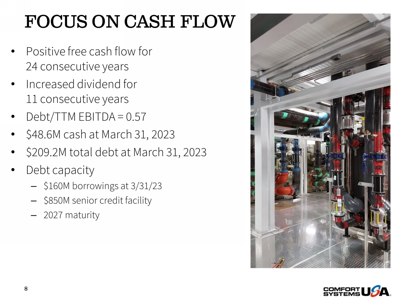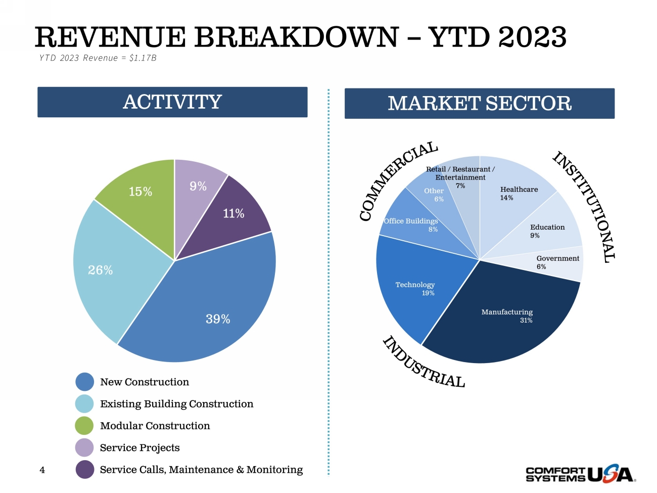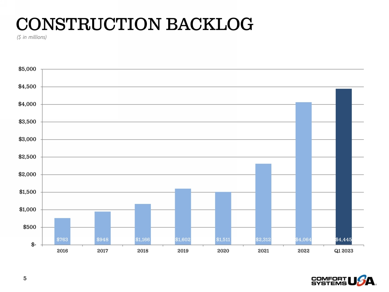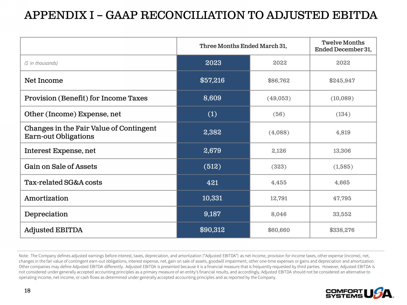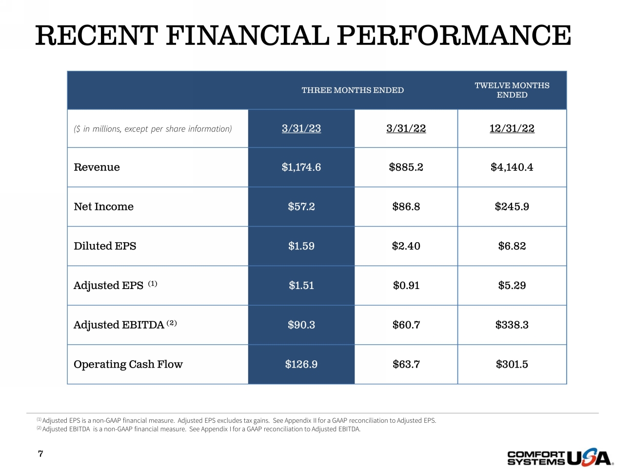SAFE HARBOR Certain statements and information in this presentation may constitute forward - looking statements within the meaning of applicab le securities laws and regulations. The words “believe,” “expect,” “anticipate,” “plan,” “intend,” “foresee,” “should,” “would,” “could,” or oth er similar expressions are intended to identify forward - looking statements, which are generally not historic in nature. These forward - looking statements are based o n the current expectations and beliefs of Comfort Systems USA, Inc. and its subsidiaries (collectively, the “Company”) concerning future developments an d t heir effect on the Company. While the Company’s management believes that these forward - looking statements are reasonable as and when made, there can be no a ssurance that future developments affecting the Company will be those that it anticipates, and the Company’s actual results of operations, financi al condition and liquidity, and the development of the industry in which the Company operates, may differ materially from those made in or suggested by the f orw ard - looking statements contained in this presentation. In addition, even if our results of operations, financial condition and liquidity, and the d eve lopment of the industry in which we operate, are consistent with the forward - looking statements contained in this presentation, those results or developments may not be indicative of our results or developments in subsequent periods. All comments concerning the Company’s expectations for future revenue and ope rat ing results are based on the Company’s forecasts for its existing operations and do not include the potential impact of any future acquisitions. The C omp any’s forward - looking statements involve significant risks and uncertainties (some of which are beyond the Company’s control) and assumptions that cou ld cause actual future results to differ materially from the Company’s historical experience and its present expectations or projections. Important factors that could cause actual results to differ materially from those in the forward - looking statements include, bu t are not limited to: the use of incorrect estimates for bidding a fixed - price contract; undertaking contractual commitments that exceed the Company’s lab or resources; failing to perform contractual obligations efficiently enough to maintain profitability; national or regional weakness in construction a cti vity and economic conditions; rising inflation and fluctuations in interest rates; shortages of labor and specialty building materials or material increase s t o the cost thereof; the Company’s business being negatively affected by health crises or outbreaks of disease, such as epidemics or pandemics (and related impa cts , such as supply chain disruptions); financial difficulties affecting projects, vendors, customers, or subcontractors; the Company’s backlog failing to translate into actual revenue or profits; failure of third party subcontractors and suppliers to complete work as anticipated; difficulty in obtaining, or in cre ased costs associated with, bonding and insurance; impairment to goodwill; errors in the Company’s cost - to - cost input method of accounting; the result of co mpetition in the Company’s markets; the Company’s decentralized management structure; material failure to comply with varying state and local law s, regulations or requirements; debarment from bidding on or performing government contracts; retention of key management; seasonal fluctuation s i n the demand for mechanical and electrical systems; the imposition of past and future liability from environmental, safety, and health regulat ion s including the inherent risk associated with self - insurance; adverse litigation results; an increase in our effective tax rate; a material information techno logy failure or a material cyber security breach; risks associated with acquisitions, such as challenges to our ability to integrate those companies into our int ernal control environment; our ability to manage growth and geographically - dispersed operations; our ability to obtain financing on acceptable terms; extreme w eather conditions (such as storms, droughts, extreme heat or cold, wildfires and floods), including as a result of climate change, and any resulting reg ula tions or restrictions related thereto; and other risks detailed in our reports filed with the Securities and Exchange Commission (the “SEC”). For additional information regarding known material factors that could cause the Company’s results to differ from its project ed results, please see its filings with the SEC, including its Annual Report on Form 10 - K, Quarterly Reports on Form 10 - Q, and Current Reports on Form 8 - K. Readers are cautioned not to place undue reliance on forward - looking statements, which speak only as of the date hereof. The Company undertakes no obligat ion to publicly update or revise any forward - looking statements after the date they are made, whether as a result of new information, future events, or ot herwise. NON - GAAP MEASURES Certain measures in this presentation are not measures calculated in accordance with generally accepted accounting principles (“ GAAP”). They should not be considered a replacement for GAAP results. Non - GAAP financial measures appearing in these slides are identified in the footnote. See the Appendices for a reconciliation of these non - GAAP measures to the most comparable GAAP financial measures.