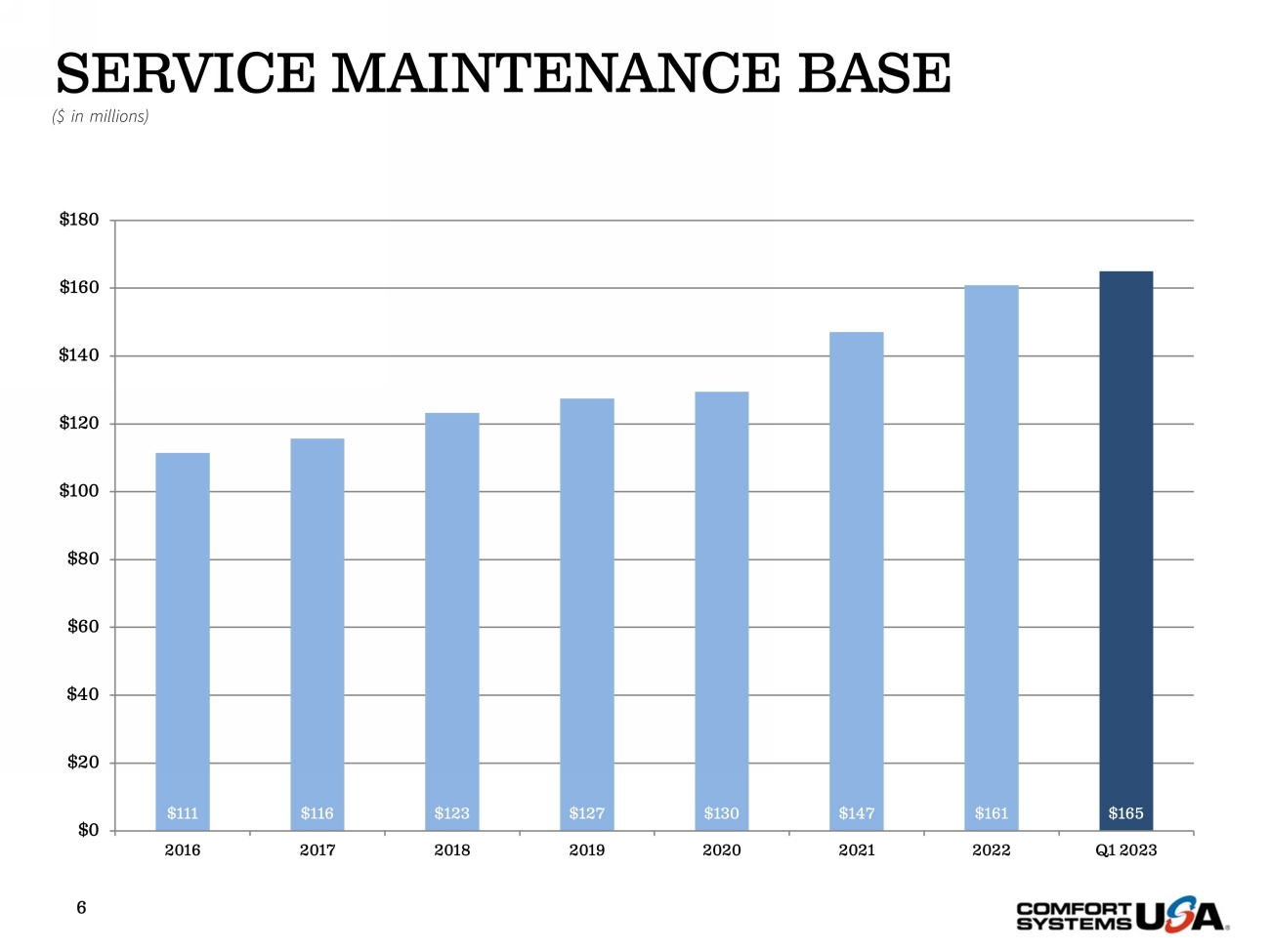 SERVICE MAINTENANCE BASE 6 $111 $116 $123 $127 $130 $147 $161 $165 $0 $20 $40 $60 $80 $100 $120 $140 $160 $180 2016 2017 2018 2019 2020 2021 2022 Q1 2023 ($ in millions)