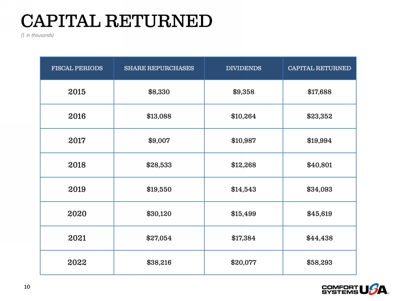 10 CAPITAL RETURNED ($ in thousands) FISCAL PERIODS SHARE REPURCHASES DIVIDENDS CAPITAL RETURNED 2015 $8,330 $9,358 $17,688 2016 $13,088 $10,264 $23,352 2017 $9,007 $10,987 $19,994 2018 $28,533 $12,268 $40,801 2019 $19,550 $14,543 $34,093 2020 $30,120 $15,499 $45,619 2021 $27,054 $17,384 $44,438 2022 $38,216 $20,077 $58,293