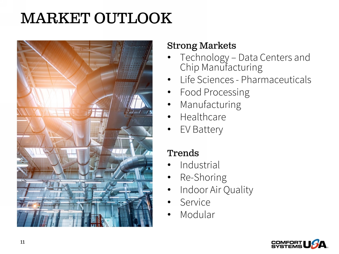 MARKET OUTLOOK 11 Strong Markets • Technology – Data Centers and Chip Manufacturing • Life Sciences - Pharmaceuticals • Food Processing • Manufacturing • Healthcare • EV Battery Trends • Industrial • Re - Shoring • Indoor Air Quality • Service • Modular