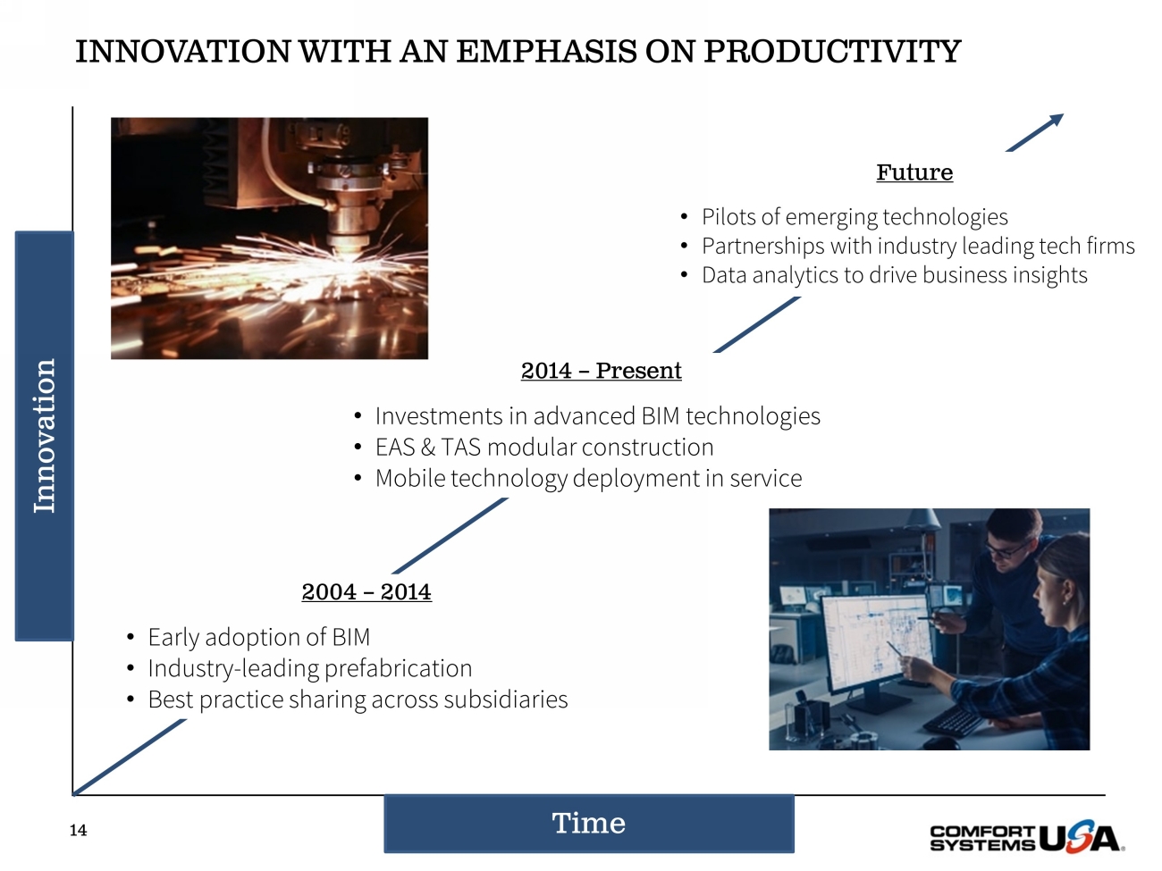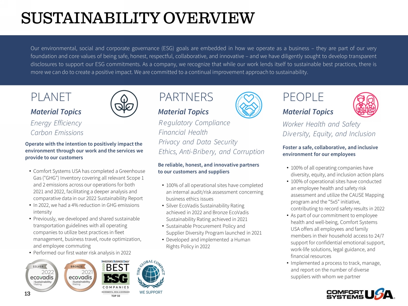 Foster a safe, collaborative, and inclusive environment for our employees • 100% of all operating companies have diversity, equity, and inclusion action plans • 100% of operational sites have conducted an employee health and safety risk assessment and utilize the CAUSE Mapping program and the “5x5” initiative, contributing to record safety results in 2022 • As part of our commitment to employee health and well - being, Comfort Systems USA offers all employees and family members in their household access to 24/7 support for confidential emotional support, work - life solutions, legal guidance, and financial resources • Implemented a process to track, manage, and report on the number of diverse suppliers with whom we partner Our environmental, social and corporate governance (ESG) goals are embedded in how we operate as a business – they are part of our very foundation and core values of being safe, honest, respectful, collaborative, and innovative – and we have diligently sought to develop transparent disclosures to support our ESG commitments . As a company, we recognize that while our work lends itself to sustainable best practices, there is more we can do to create a positive impact . We are committed to a continual improvement approach to sustainability . PEOPLE PARTNERS PLANET Be reliable, honest, and innovative partners to our customers and suppliers • 100% of all operational sites have completed an internal audit/risk assessment concerning business ethics issues • Silver EcoVadis Sustainability Rating achieved in 2022 and Bronze EcoVadis Sustainability Rating achieved in 2021 • Sustainable Procurement Policy and Supplier Diversity Program launched in 2021 • Developed and implemented a Human Rights Policy in 2022 Operate with the intention to positively impact the environment through our work and the services we provide to our customers • Comfort Systems USA has completed a Greenhouse Gas ("GHG") Inventory covering all relevant Scope 1 and 2 emissions across our operations for both 2021 and 2022, facilitating a deeper analysis and comparative data in our 2022 Sustainability Report • In 2022, we had a 4% reduction in GHG emissions intensity • Previously, we developed and shared sustainable transportation guidelines with all operating companies to utilize best practices in fleet management, business travel, route optimization, and employee commuting • Performed our first water risk analysis in 2022 Energy Efficiency Carbon Emissions Regulatory Compliance Financial Health Privacy and Data Security Ethics, Anti - Bribery, and Corruption Worker Health and Safety Diversity, Equity, and Inclusion Material Topics Material Topics Material Topics SUSTAINABILITY OVERVIEW 13