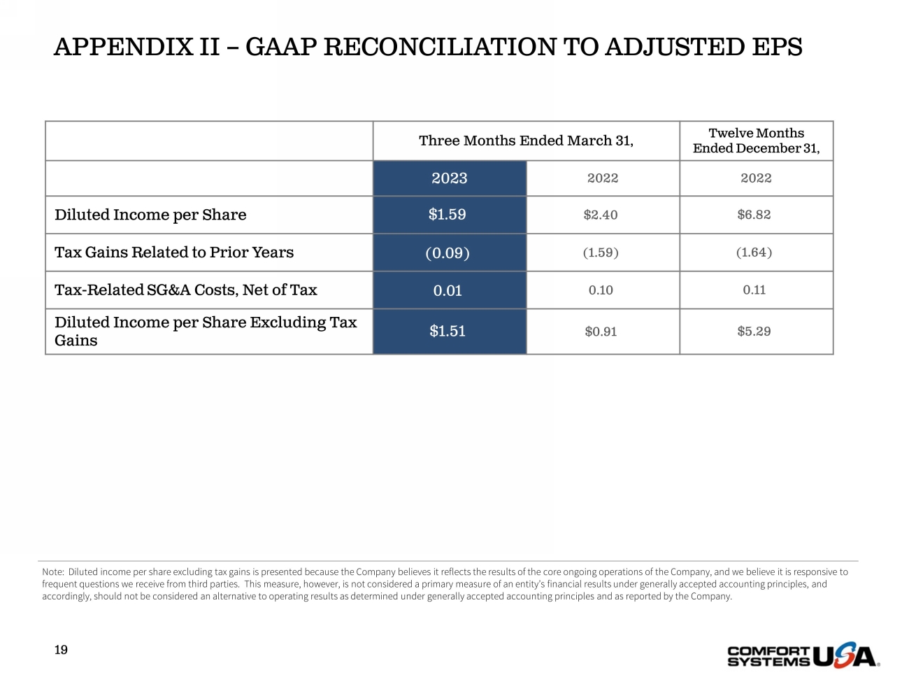APPENDIX II – GAAP RECONCILIATION TO ADJUSTED EPS 19 Three Months Ended March 31, Twelve Months Ended December 31, 2023 2022 2022 Diluted Income per Share $1.59 $2.40 $6.82 Tax Gains Related to Prior Years (0.09) (1.59) (1.64) Tax - Related SG&A Costs, Net of Tax 0.01 0.10 0.11 Diluted Income per Share Excluding Tax Gains $1.51 $0.91 $5.29 Note: Diluted income per share excluding tax gains is presented because the Company believes it reflects the results of the cor e ongoing operations of the Company, and we believe it is responsive to frequent questions we receive from third parties. This measure, however, is not considered a primary measure of an entity’s fin ancial results under generally accepted accounting principles, and accordingly, should not be considered an alternative to operating results as determined under generally accepted accounting p rin ciples and as reported by the Company.