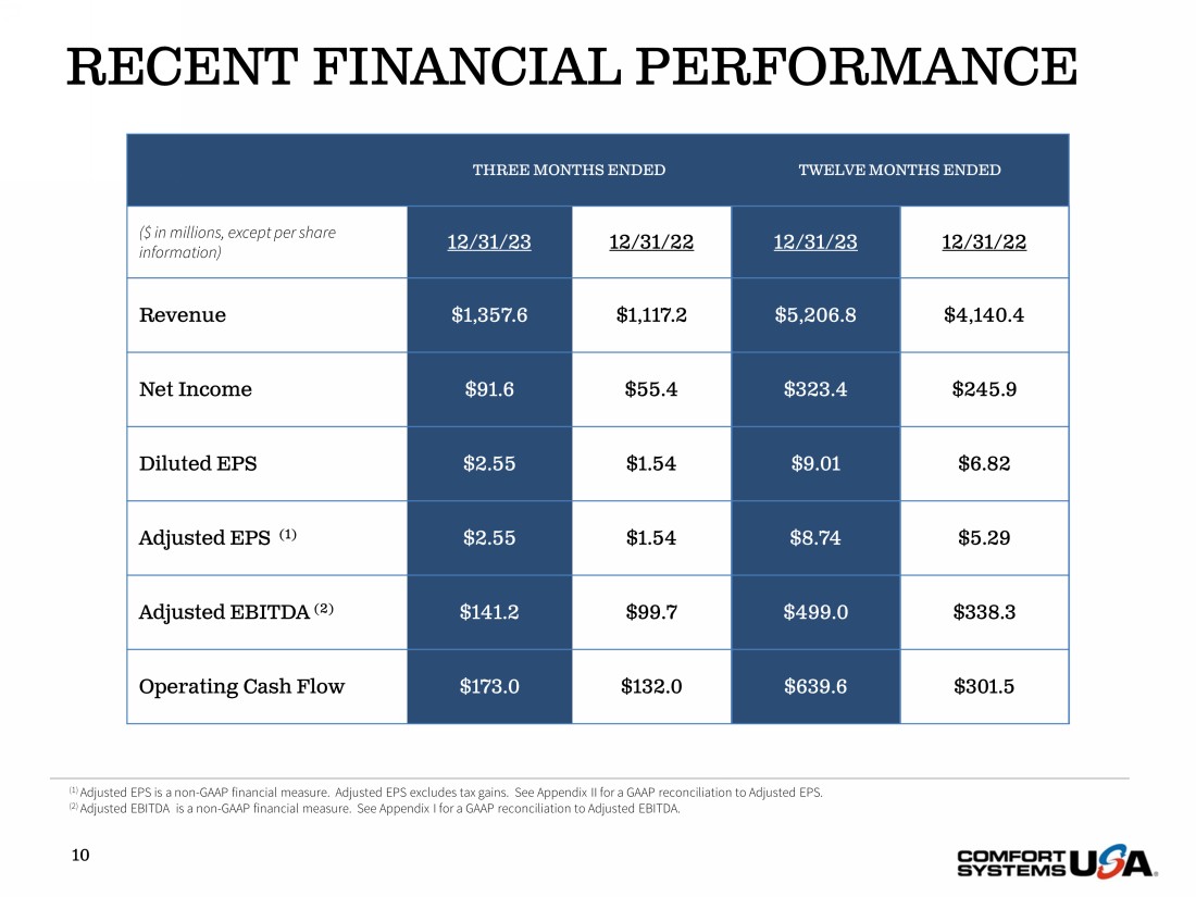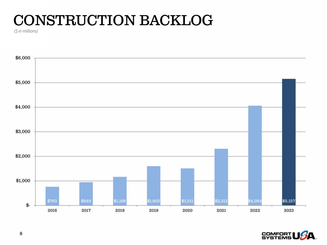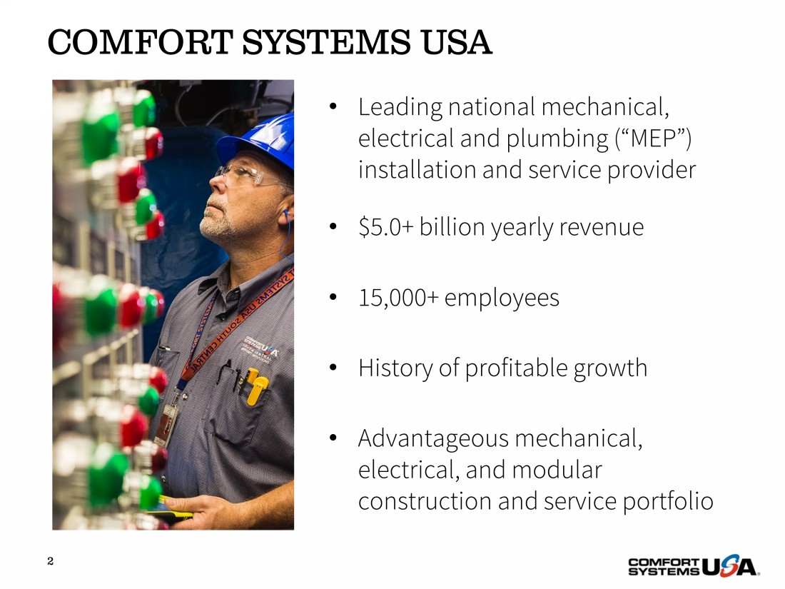 SAFE HARBOR Certain statements and information in this presentation may constitute forward - looking statements within the meaning of applicab le securities laws and regulations. The words “believe,” “expect,” “anticipate,” “plan,” “intend,” “foresee,” “should,” “would,” “could,” or oth er similar expressions are intended to identify forward - looking statements, which are generally not historic in nature. These forward - looking statements are based o n the current expectations and beliefs of Comfort Systems USA, Inc. and its subsidiaries (collectively, the “Company”) concerning future developments an d t heir effect on the Company. While the Company’s management believes that these forward - looking statements are reasonable as and when made, there can be no a ssurance that future developments affecting the Company will be those that it anticipates, and the Company’s actual results of operations, financi al condition and liquidity, and the development of the industry in which the Company operates, may differ materially from those made in or suggested by the f orw ard - looking statements contained in this presentation. In addition, even if our results of operations, financial condition and liquidity, and the d eve lopment of the industry in which we operate, are consistent with the forward - looking statements contained in this presentation, those results or developments may not be indicative of our results or developments in subsequent periods. All comments concerning the Company’s expectations for future revenue and ope rat ing results are based on the Company’s forecasts for its existing operations and do not include the potential impact of any future acquisitions. The C omp any’s forward - looking statements involve significant risks and uncertainties (some of which are beyond the Company’s control) and assumptions that cou ld cause actual future results to differ materially from the Company’s historical experience and its present expectations or projections. Important factors that could cause actual results to differ materially from those in the forward - looking statements include, bu t are not limited to: the use of incorrect estimates for bidding a fixed - price contract; undertaking contractual commitments that exceed the Company’s lab or resources; failing to perform contractual obligations efficiently enough to maintain profitability; national or regional weakness in construction a cti vity and economic conditions; rising inflation and fluctuations in interest rates; shortages of labor and specialty building materials or material increase s t o the cost thereof; the Company’s business being negatively affected by health crises or outbreaks of disease, such as epidemics or pandemics (and related impa cts , such as supply chain disruptions); financial difficulties affecting projects, vendors, customers, or subcontractors; the Company’s backlog failing to translate into actual revenue or profits; failure of third party subcontractors and suppliers to complete work as anticipated; difficulty in obtaining, or in cre ased costs associated with, bonding and insurance; impairment to goodwill; errors in the Company’s cost - to - cost input method of accounting; the result of co mpetition in the Company’s markets; the Company’s decentralized management structure; material failure to comply with varying state and local law s, regulations or requirements; debarment from bidding on or performing government contracts; retention of key management; seasonal fluctuation s i n the demand for mechanical and electrical systems; the imposition of past and future liability from environmental, safety, and health regulat ion s including the inherent risk associated with self - insurance; adverse litigation results; an increase in our effective tax rate; a material information techno logy failure or a material cyber security breach; risks associated with acquisitions, such as challenges to our ability to integrate those companies into our int ernal control environment; our ability to manage growth and geographically - dispersed operations; our ability to obtain financing on acceptable terms; extreme w eather conditions (such as storms, droughts, extreme heat or cold, wildfires and floods), including as a result of climate change, and any resulting reg ula tions or restrictions related thereto; and other risks detailed in our reports filed with the Securities and Exchange Commission (the “SEC”). For additional information regarding known material factors that could cause the Company’s results to differ from its project ed results, please see its filings with the SEC, including its Annual Report on Form 10 - K, Quarterly Reports on Form 10 - Q, and Current Reports on Form 8 - K. Readers are cautioned not to place undue reliance on forward - looking statements, which speak only as of the date hereof. The Company undertakes no obligat ion to publicly update or revise any forward - looking statements after the date they are made, whether because of new information, future events, or otherw ise. NON - GAAP MEASURES Certain measures in this presentation are not measures calculated in accordance with generally accepted accounting principles (“ GAAP”). They should not be considered a replacement for GAAP results. Non - GAAP financial measures appearing in these slides are identified in the footnote. See the Appendices for a reconciliation of these non - GAAP measures to the most comparable GAAP financial measures.