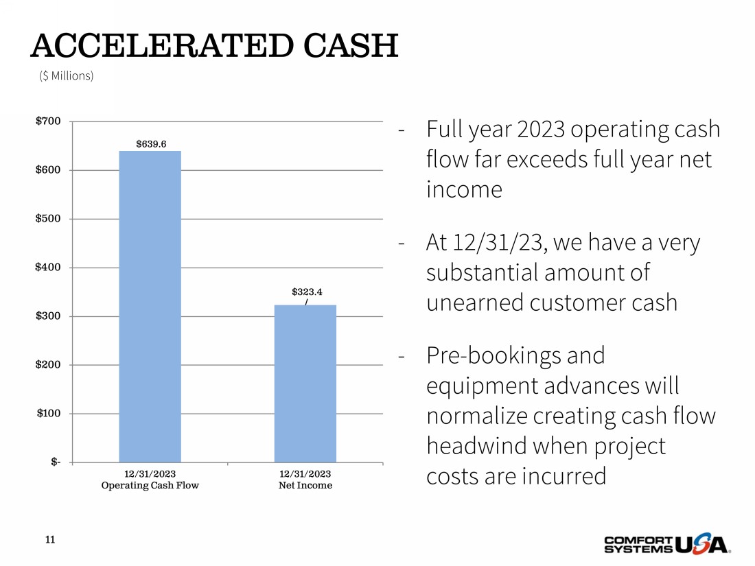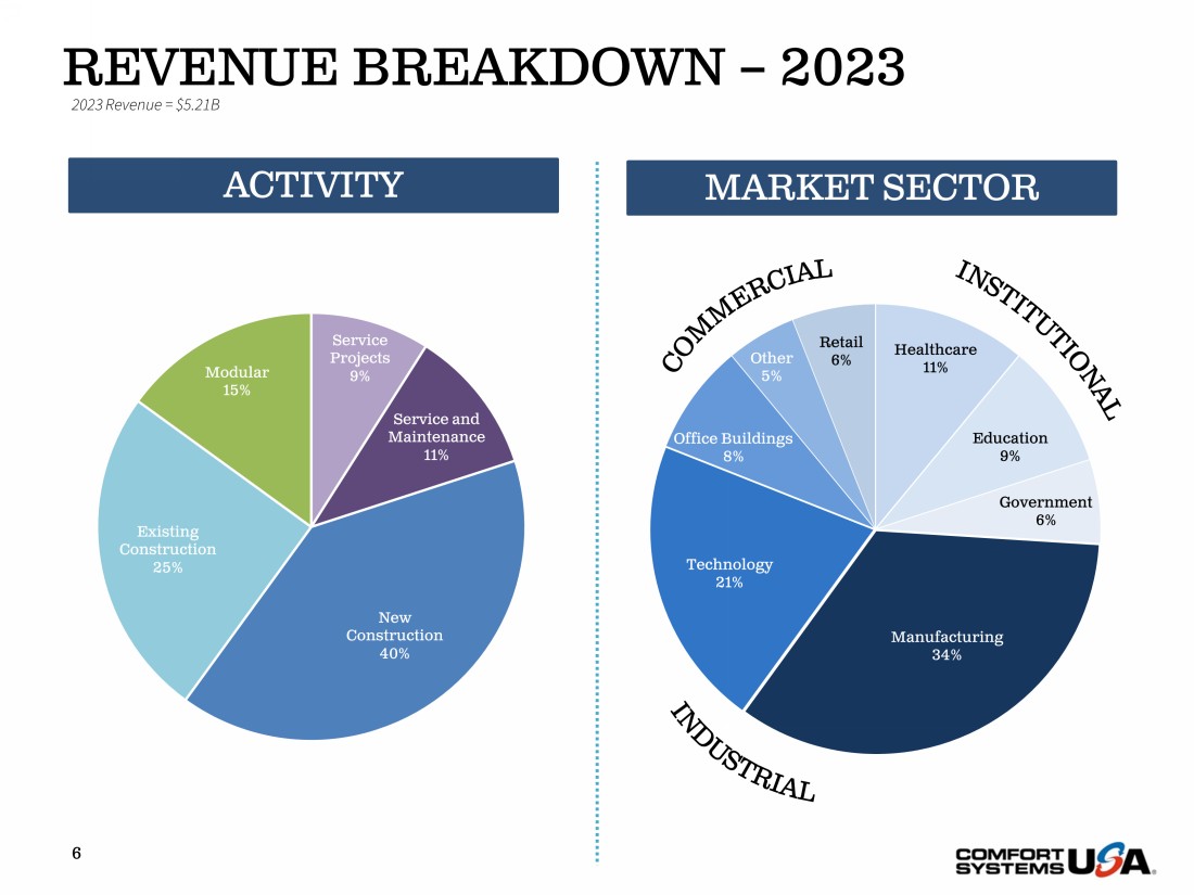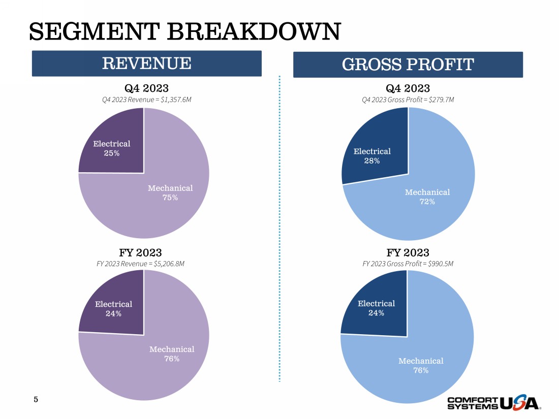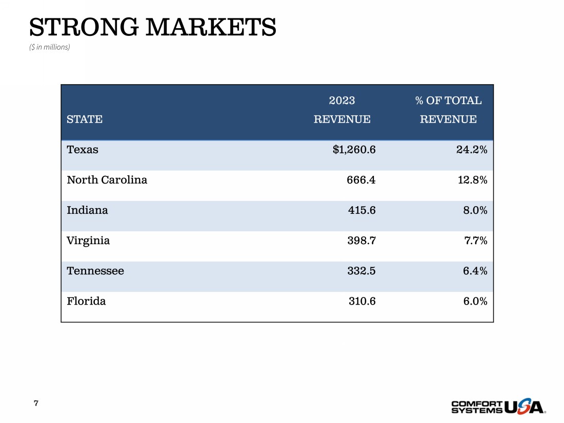 SAFE HARBOR Certain statements and information in this presentation may constitute forward - looking statements within the meaning of applicab le securities laws and regulations. The words “believe,” “expect,” “anticipate,” “plan,” “intend,” “foresee,” “should,” “would,” “could,” or oth er similar expressions are intended to identify forward - looking statements, which are generally not historic in nature. These forward - looking statements are based o n the current expectations and beliefs of Comfort Systems USA, Inc. and its subsidiaries (collectively, the “Company”) concerning future developments an d t heir effect on the Company. While the Company’s management believes that these forward - looking statements are reasonable as and when made, there can be no a ssurance that future developments affecting the Company will be those that it anticipates, and the Company’s actual results of operations, financi al condition and liquidity, and the development of the industry in which the Company operates, may differ materially from those made in or suggested by the f orw ard - looking statements contained in this presentation. In addition, even if our results of operations, financial condition and liquidity, and the d eve lopment of the industry in which we operate, are consistent with the forward - looking statements contained in this presentation, those results or developments may not be indicative of our results or developments in subsequent periods. All comments concerning the Company’s expectations for future revenue and ope rat ing results are based on the Company’s forecasts for its existing operations and do not include the potential impact of any future acquisitions. The C omp any’s forward - looking statements involve significant risks and uncertainties (some of which are beyond the Company’s control) and assumptions that cou ld cause actual future results to differ materially from the Company’s historical experience and its present expectations or projections. Important factors that could cause actual results to differ materially from those in the forward - looking statements include, bu t are not limited to: the use of incorrect estimates for bidding a fixed - price contract; undertaking contractual commitments that exceed the Company’s lab or resources; failing to perform contractual obligations efficiently enough to maintain profitability; national or regional weakness in construction a cti vity and economic conditions; rising inflation and fluctuations in interest rates; shortages of labor and specialty building materials or material increase s t o the cost thereof; the Company’s business being negatively affected by health crises or outbreaks of disease, such as epidemics or pandemics (and related impa cts , such as supply chain disruptions); financial difficulties affecting projects, vendors, customers, or subcontractors; the Company’s backlog failing to translate into actual revenue or profits; failure of third party subcontractors and suppliers to complete work as anticipated; difficulty in obtaining, or in cre ased costs associated with, bonding and insurance; impairment to goodwill; errors in the Company’s cost - to - cost input method of accounting; the result of co mpetition in the Company’s markets; the Company’s decentralized management structure; material failure to comply with varying state and local law s, regulations or requirements; debarment from bidding on or performing government contracts; retention of key management; seasonal fluctuation s i n the demand for mechanical and electrical systems; the imposition of past and future liability from environmental, safety, and health regulat ion s including the inherent risk associated with self - insurance; adverse litigation results; an increase in our effective tax rate; a material information techno logy failure or a material cyber security breach; risks associated with acquisitions, such as challenges to our ability to integrate those companies into our int ernal control environment; our ability to manage growth and geographically - dispersed operations; our ability to obtain financing on acceptable terms; extreme w eather conditions (such as storms, droughts, extreme heat or cold, wildfires and floods), including as a result of climate change, and any resulting reg ula tions or restrictions related thereto; and other risks detailed in our reports filed with the Securities and Exchange Commission (the “SEC”). For additional information regarding known material factors that could cause the Company’s results to differ from its project ed results, please see its filings with the SEC, including its Annual Report on Form 10 - K, Quarterly Reports on Form 10 - Q, and Current Reports on Form 8 - K. Readers are cautioned not to place undue reliance on forward - looking statements, which speak only as of the date hereof. The Company undertakes no obligat ion to publicly update or revise any forward - looking statements after the date they are made, whether because of new information, future events, or otherw ise. NON - GAAP MEASURES Certain measures in this presentation are not measures calculated in accordance with generally accepted accounting principles (“ GAAP”). They should not be considered a replacement for GAAP results. Non - GAAP financial measures appearing in these slides are identified in the footnote. See the Appendices for a reconciliation of these non - GAAP measures to the most comparable GAAP financial measures.