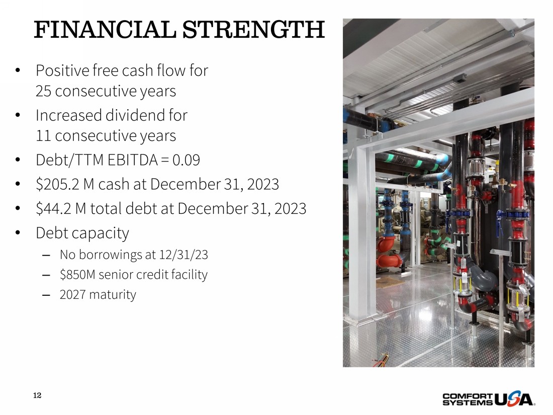 FINANCIAL STRENGTH • Positive free cash flow for 25 consecutive years • Increased dividend for 11 consecutive years • Debt/TTM EBITDA = 0.09 • $205.2 M cash at December 31, 2023 • $44.2 M total debt at December 31, 2023 • Debt capacity – No borrowings at 12/31/23 – $850M senior credit facility – 2027 maturity 12