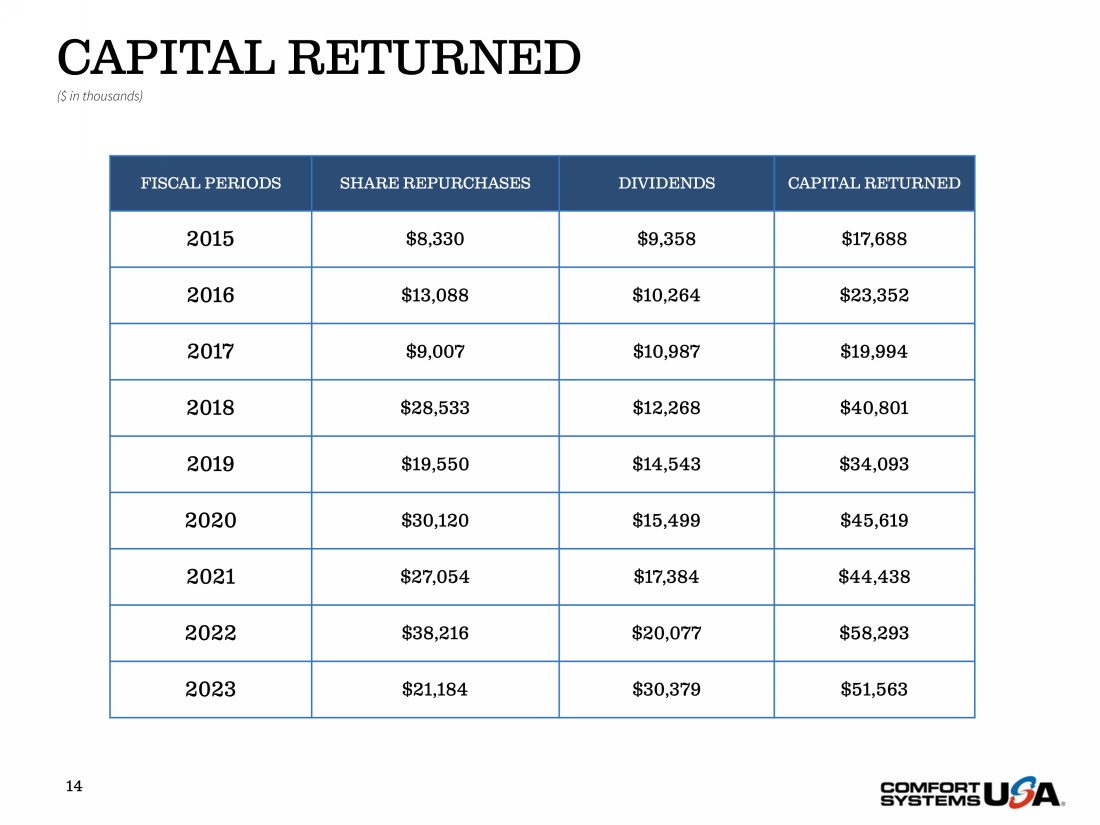 14 CAPITAL RETURNED ($ in thousands) FISCAL PERIODS SHARE REPURCHASES DIVIDENDS CAPITAL RETURNED 2015 $8,330 $9,358 $17,688 2016 $13,088 $10,264 $23,352 2017 $9,007 $10,987 $19,994 2018 $28,533 $12,268 $40,801 2019 $19,550 $14,543 $34,093 2020 $30,120 $15,499 $45,619 2021 $27,054 $17,384 $44,438 2022 $38,216 $20,077 $58,293 2023 $21,184 $30,379 $51,563