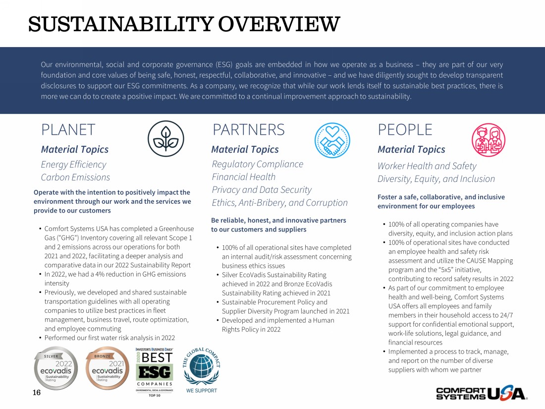 Foster a safe, collaborative, and inclusive environment for our employees • 100% of all operating companies have diversity, equity, and inclusion action plans • 100% of operational sites have conducted an employee health and safety risk assessment and utilize the CAUSE Mapping program and the “5x5” initiative, contributing to record safety results in 2022 • As part of our commitment to employee health and well - being, Comfort Systems USA offers all employees and family members in their household access to 24/7 support for confidential emotional support, work - life solutions, legal guidance, and financial resources • Implemented a process to track, manage, and report on the number of diverse suppliers with whom we partner Our environmental, social and corporate governance (ESG) goals are embedded in how we operate as a business – they are part of our very foundation and core values of being safe, honest, respectful, collaborative, and innovative – and we have diligently sought to develop transparent disclosures to support our ESG commitments . As a company, we recognize that while our work lends itself to sustainable best practices, there is more we can do to create a positive impact . We are committed to a continual improvement approach to sustainability . PEOPLE PARTNERS PLANET Be reliable, honest, and innovative partners to our customers and suppliers • 100% of all operational sites have completed an internal audit/risk assessment concerning business ethics issues • Silver EcoVadis Sustainability Rating achieved in 2022 and Bronze EcoVadis Sustainability Rating achieved in 2021 • Sustainable Procurement Policy and Supplier Diversity Program launched in 2021 • Developed and implemented a Human Rights Policy in 2022 Operate with the intention to positively impact the environment through our work and the services we provide to our customers • Comfort Systems USA has completed a Greenhouse Gas ("GHG") Inventory covering all relevant Scope 1 and 2 emissions across our operations for both 2021 and 2022, facilitating a deeper analysis and comparative data in our 2022 Sustainability Report • In 2022, we had a 4% reduction in GHG emissions intensity • Previously, we developed and shared sustainable transportation guidelines with all operating companies to utilize best practices in fleet management, business travel, route optimization, and employee commuting • Performed our first water risk analysis in 2022 Energy Efficiency Carbon Emissions Regulatory Compliance Financial Health Privacy and Data Security Ethics, Anti - Bribery, and Corruption Worker Health and Safety Diversity, Equity, and Inclusion Material Topics Material Topics Material Topics SUSTAINABILITY OVERVIEW 16
