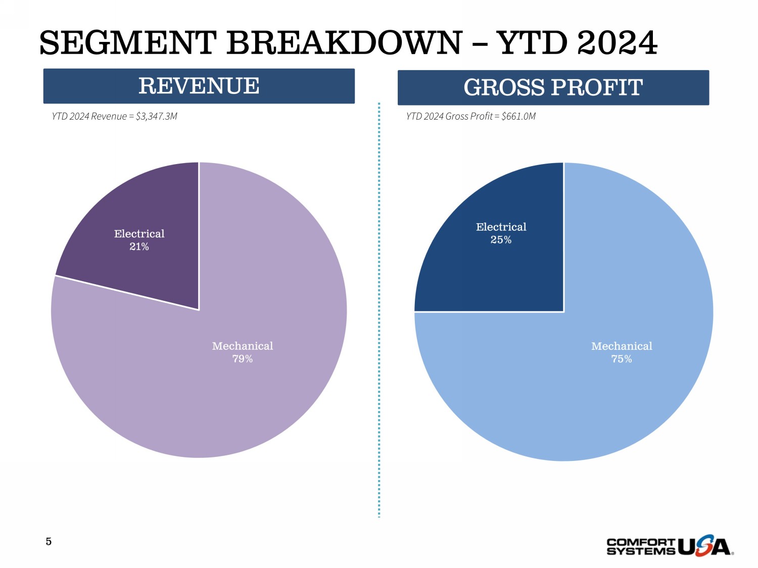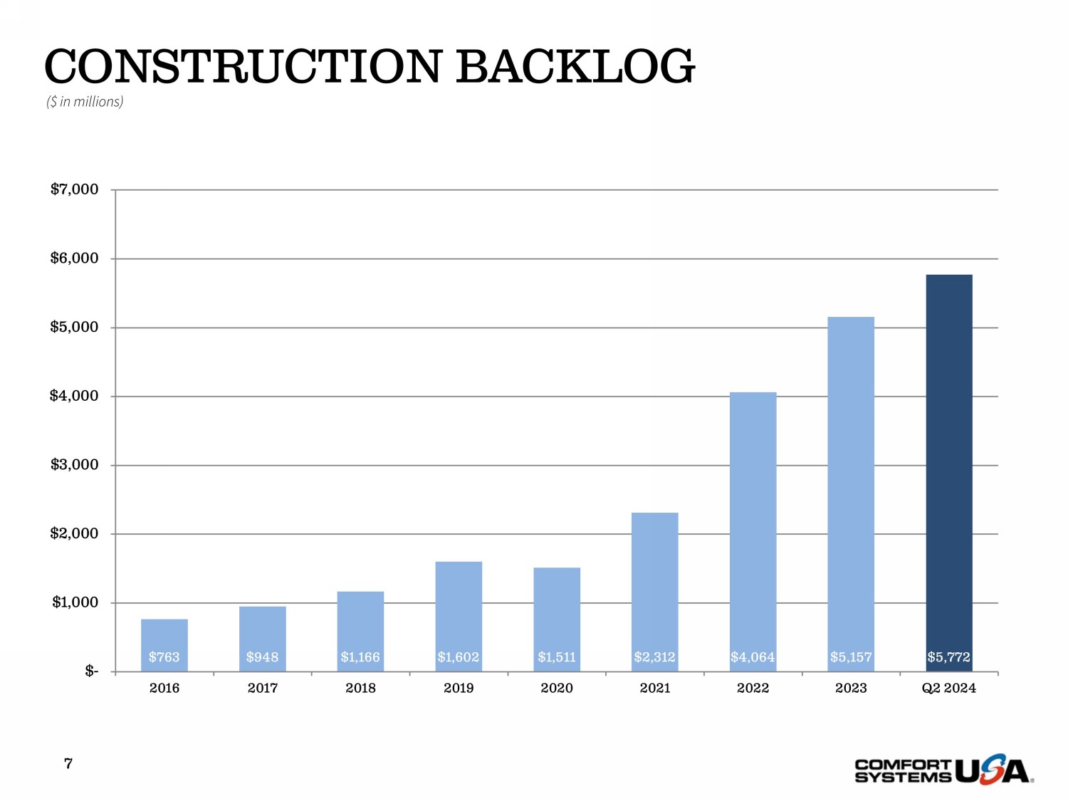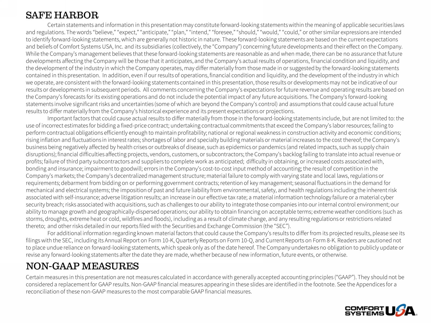 SAFE HARBOR Certain statements and information in this presentation may constitute forward - looking statements within the meaning of applicab le securities laws securities laws and regulations. The words “believe,” “expect,” “anticipate,” “plan,” “intend,” “foresee,” “should,” “would,” “c ould,” or other similar expressions are intended to identify forward - looking statements, which are generally not historic in nature. These forward - looki ng statements are based on are based on the current expectations and beliefs of Comfort Systems USA, Inc. and its subsidiaries (collectively, the “Compa ny” ) concerning future future developments and their effect on the Company. While the Company’s management believes that these forward - looking statemen ts are reasonable as reasonable as and when made, there can be no assurance that future developments affecting the Company will be those that it a nti cipates, and the the Company’s actual results of operations, financial condition and liquidity, and the development of the industry in which t he Company operates, may differ operates, may differ materially from those made in or suggested by the forward - looking statements contained in this presentation . In addition, even if our even if our results of operations, financial condition and liquidity, and the development of the industry in which we operate , a re consistent with the forward - the forward - looking statements contained in this presentation, those results or developments may not be indicative of our result s or developments in developments in subsequent periods. All comments concerning the Company’s expectations for future revenue and operating resu lts are based on the on the Company’s forecasts for its existing operations and do not include the potential impact of any future acquisitions. Th e C ompany’s forward - looking forward - looking statements involve significant risks and uncertainties (some of which are beyond the Company’s control) and assu mptions that could cause could cause actual future results to differ materially from the Company’s historical experience and its present expectations or projections. Important factors that could cause actual results to differ materially from those in the forward - looking statements include, bu t are not limited to: the limited to: the use of incorrect estimates for bidding a fixed - price contract; undertaking contractual commitments that exceed t he Company’s labor labor resources; failing to perform contractual obligations efficiently enough to maintain profitability; national or regiona l w eakness in construction activity construction activity and economic conditions; rising inflation and fluctuations in interest rates; shortages of labor and sp eci alty building materials or materials or material increases to the cost thereof; the Company’s business being negatively affected by health crises or out bre aks of disease, such as such as epidemics or pandemics (and related impacts, such as supply chain disruptions); financial difficulties affecting proj ect s, vendors, customers, or customers, or subcontractors; the Company’s backlog failing to translate into actual revenue or profits; failure of third par ty subcontractors and suppliers to suppliers to complete work as anticipated; difficulty in obtaining, or increased costs associated with, bonding and insuranc e; impairment to goodwill; errors goodwill; errors in the Company’s cost - to - cost input method of accounting; the result of competition in the Company’s markets; t he Company’s decentralized management structure; material failure to comply with varying state and local laws, regulations or requirements ; d ebarment from bidding on bidding on or performing government contracts; retention of key management; seasonal fluctuations in the demand for mechanica l a nd electrical systems; systems; the imposition of past and future liability from environmental, safety, and health regulations including the inheren t r isk associated with self - self - insurance; adverse litigation results; an increase in our effective tax rate; a material information technology failure or a material cyber security breach; security breach; risks associated with acquisitions, such as challenges to our ability to integrate those companies into our int ernal control environment; our environment; our ability to manage growth and geographically - dispersed operations; our ability to obtain financing on acceptable terms; extreme weather weather conditions (such as storms, droughts, extreme heat or cold, wildfires and floods), including as a result of climate c han ge, and any resulting resulting regulations or restrictions related thereto; and other risks detailed in our reports filed with the Securities and Ex change Commission (the “SEC”). (the “SEC”). For additional information regarding known material factors that could cause the Company’s results to differ from its project ed results, please see its please see its filings with the SEC, including its Annual Report on Form 10 - K, Quarterly Reports on Form 10 - Q, and Current Repor ts on Form 8 - K. Readers are K. Readers are cautioned not to place undue reliance on forward - looking statements, which speak only as of the date hereof. The Company undertakes no undertakes no obligation to publicly update or revise any forward - looking statements after the date they are made, whether becau se of new information, information, future events, or otherwise. NON - GAAP MEASURES Certain measures in this presentation are not measures calculated in accordance with generally accepted accounting principles (“ GAAP”). They should not be should not be considered a replacement for GAAP results. Non - GAAP financial measures appearing in these slides are identified in the footnote. See the See the Appendices for a reconciliation of these non - GAAP measures to the most comparable GAAP financ