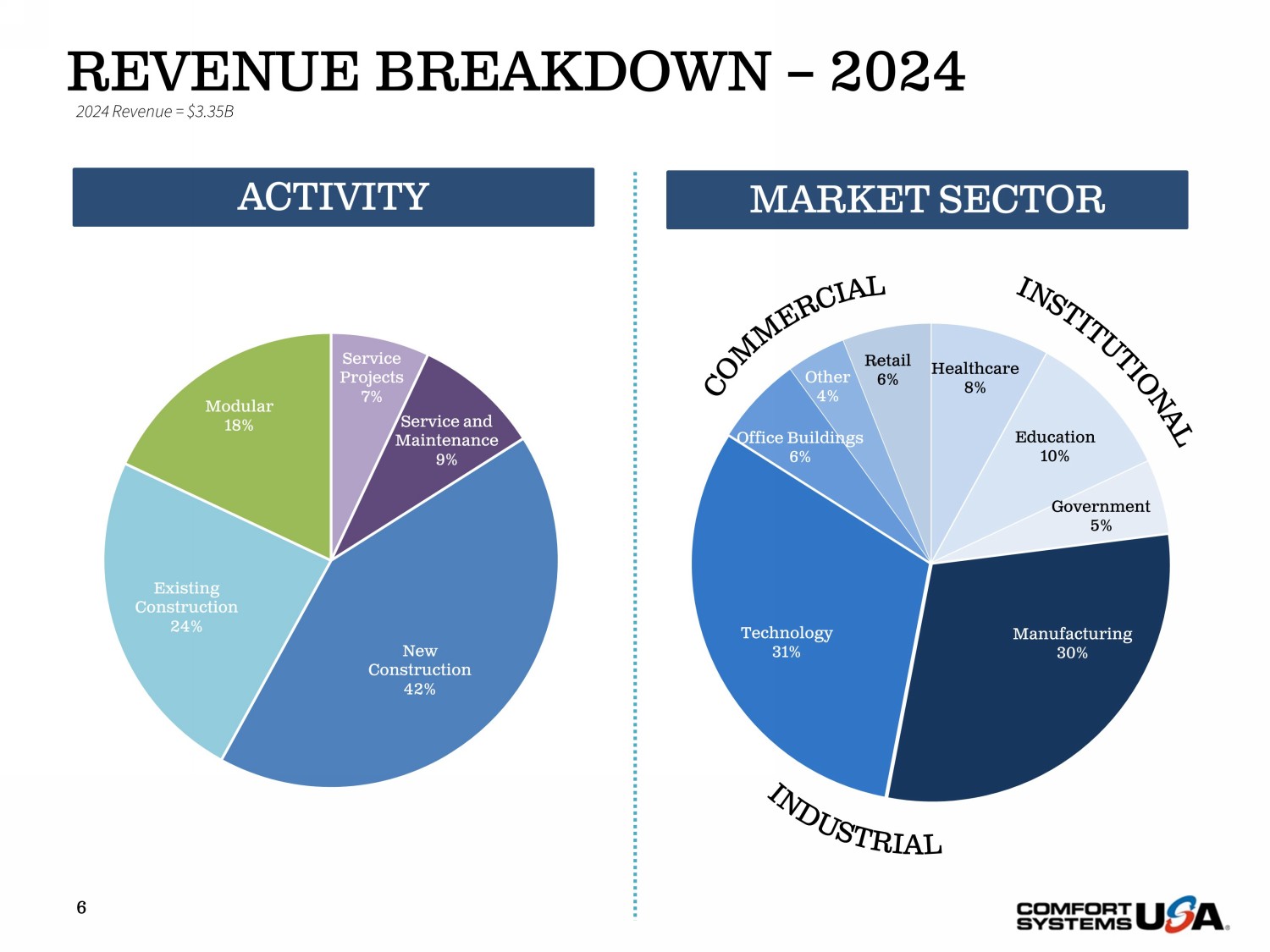 Service Projects 7% Service and Maintenance 9% New Construction 42% Existing Construction 24% Modular 18% REVENUE BREAKDOWN – 2024 6 ACTIVITY 2024 Revenue = $3.35B Healthcare 8% Education 10% Government 5% Manufacturing 30% Technology 31% Office Buildings 6% Other 4% Retail 6% MARKET SECTOR