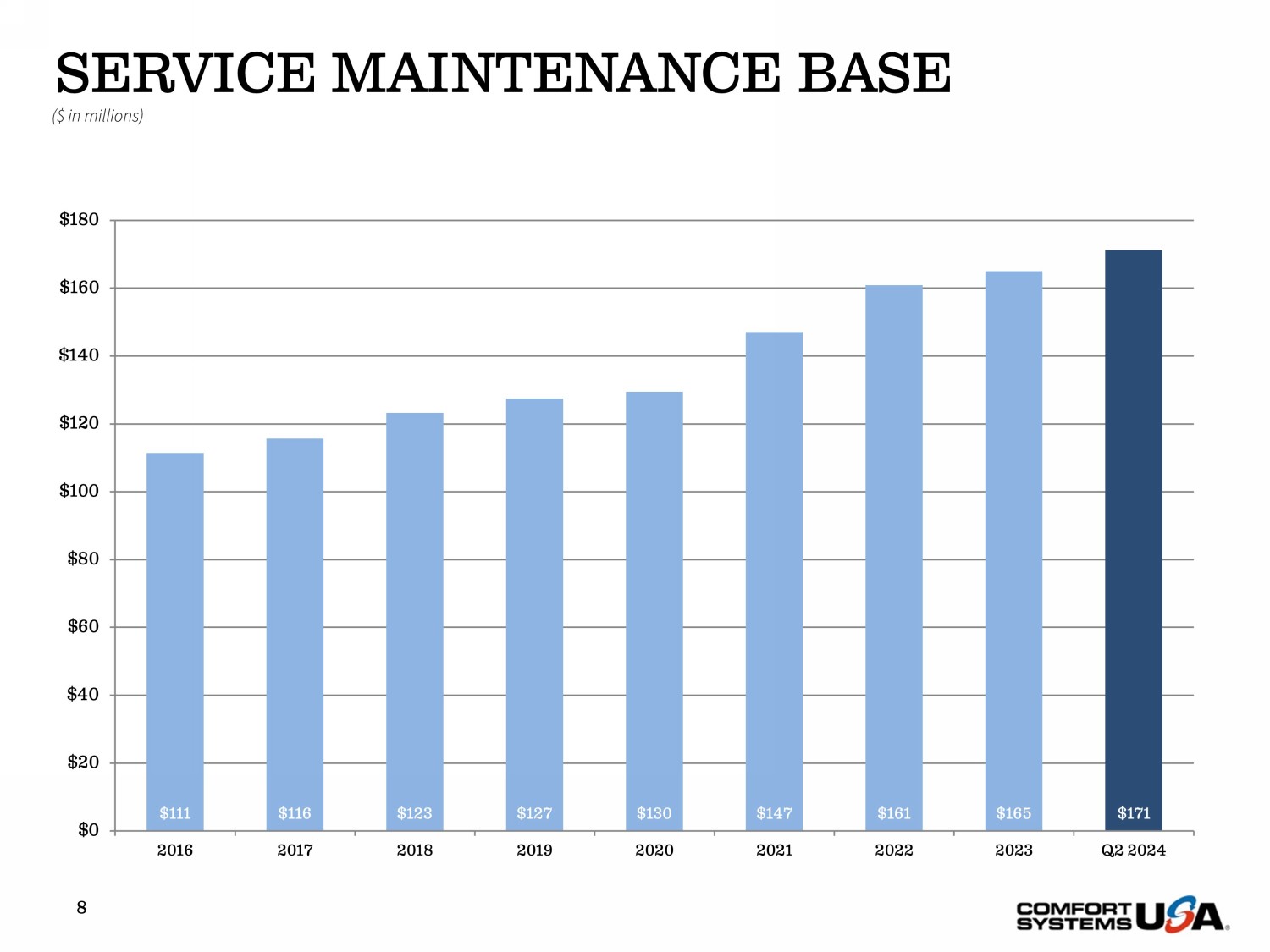 SERVICE MAINTENANCE BASE 8 $111 $116 $123 $127 $130 $147 $161 $165 $171 $0 $20 $40 $60 $80 $100 $120 $140 $160 $180 2016 2017 2018 2019 2020 2021 2022 2023 Q2 2024 ($ in millions)