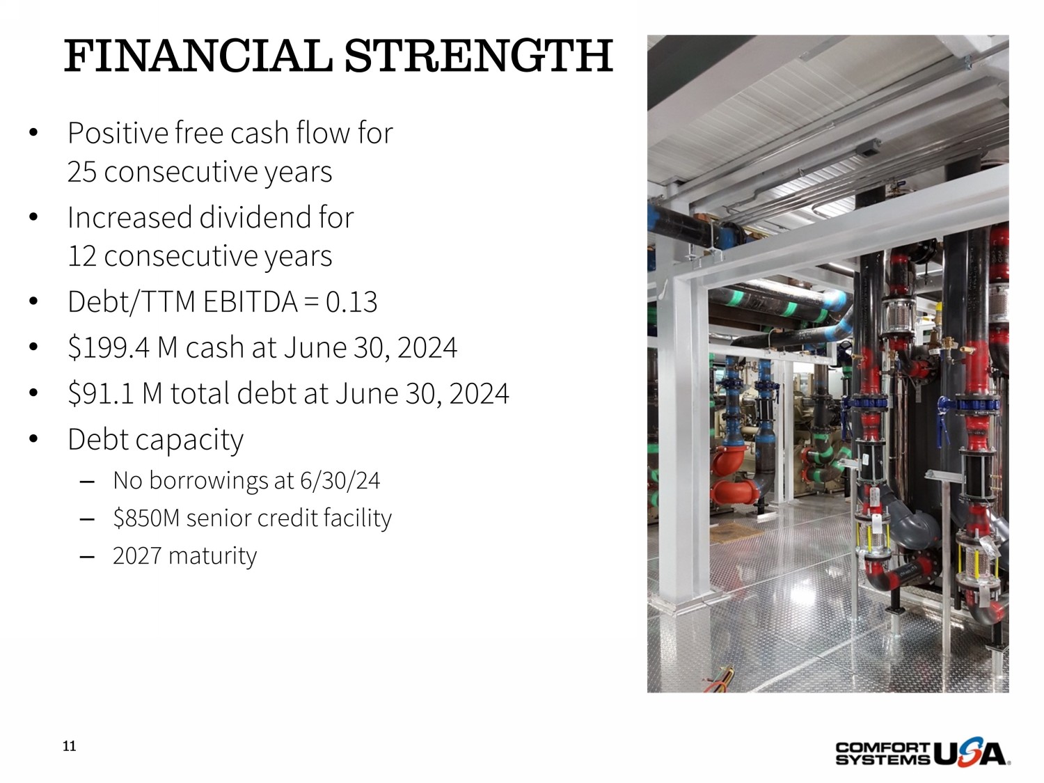ACCELERATED CASH 10 $723.7 $427.0 $- $100 $200 $300 $400 $500 $600 $700 $800 TTM 6/30/2024 Operating Cash Flow TTM 6/30/2024 Net Income ($ Millions) - TTM operating cash flow far exceeds TTM net income - At 6/30/24, we have a very substantial amount of unearned customer cash - Pre - bookings and equipment advances will normalize creating cash flow headwind when project costs are incurred
