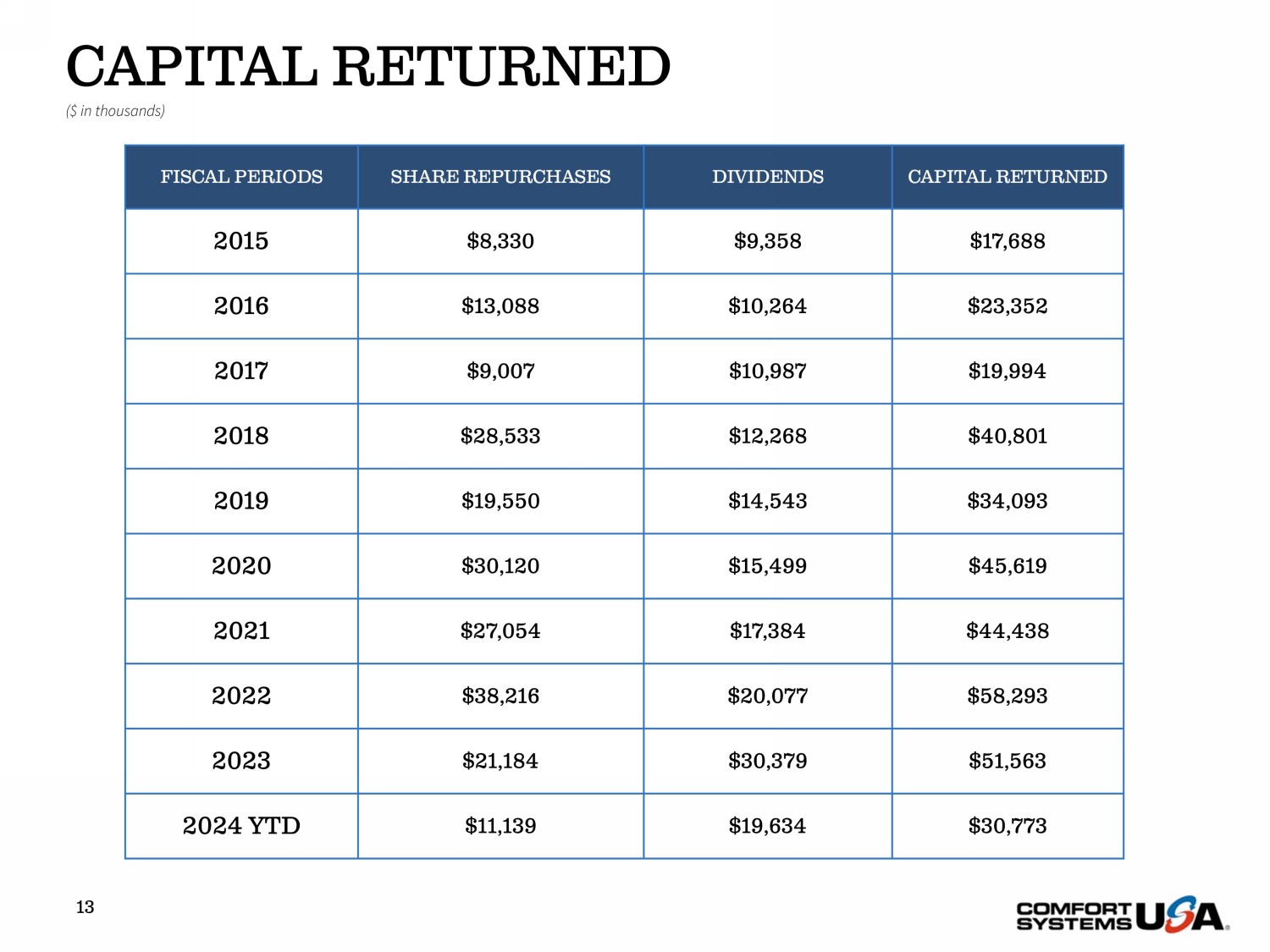 12 CAPITAL ALLOCATION ($ in thousands) $82,524 75% $15,839 14% $11,774 11% AVERAGE 2007 - 2023 Acquisitions Share Repurchases Dividends