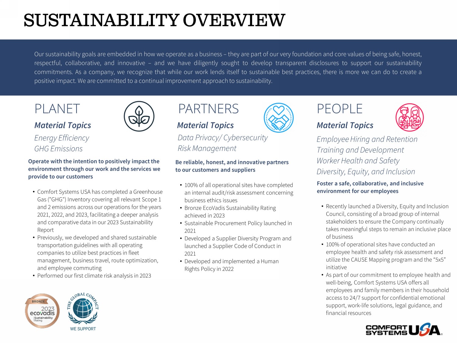 Foster a safe, collaborative, and inclusive environment for our employees • Recently launched a Diversity, Equity and Inclusion Council, consisting of a broad group of internal stakeholders to ensure the Company continually takes meaningful steps to remain an inclusive place of business • 100% of operational sites have conducted an employee health and safety risk assessment and utilize the CAUSE Mapping program and the “5x5” initiative • As part of our commitment to employee health and well - being, Comfort Systems USA offers all employees and family members in their household access to 24/7 support for confidential emotional support, work - life solutions, legal guidance, and financial resources Our sustainability goals are embedded in how we operate as a business – they are part of our very foundation and core values of being safe, honest, respectful, collaborative, and innovative – and we have diligently sought to develop transparent disclosures to support our sustainability commitments . As a company, we recognize that while our work lends itself to sustainable best practices, there is more we can do to create a positive impact . We are committed to a continual improvement approach to sustainability . PEOPL E PARTNER S PLANE T Be reliable, honest, and innovative partners to our customers and suppliers • 100% of all operational sites have completed an internal audit/risk assessment concerning business ethics issues • Bronze EcoVadis Sustainability Rating achieved in 2023 • Sustainable Procurement Policy launched in 2021 • Developed a Supplier Diversity Program and launched a Supplier Code of Conduct in 2021 • Developed and implemented a Human Rights Policy in 2022 Operate with the intention to positively impact the environment through our work and the services we provide to our customers • Comfort Systems USA has completed a Greenhouse Gas ("GHG") Inventory covering all relevant Scope 1 and 2 emissions across our operations for the years 2021, 2022, and 2023, facilitating a deeper analysis and comparative data in our 2023 Sustainability Report • Previously, we developed and shared sustainable transportation guidelines with all operating companies to utilize best practices in fleet management, business travel, route optimization, and employee commuting • Performed our first climate risk analysis in 2023 Energy Efficiency GHG Emissions Data Privacy/ Cybersecurity Risk Management Employee Hiring and Retention Training and Development Worker Health and Safety Diversity, Equity, and Inclusion Material Topics Material Topics Material Topics SUSTAINABILITY OVERVIEW 15