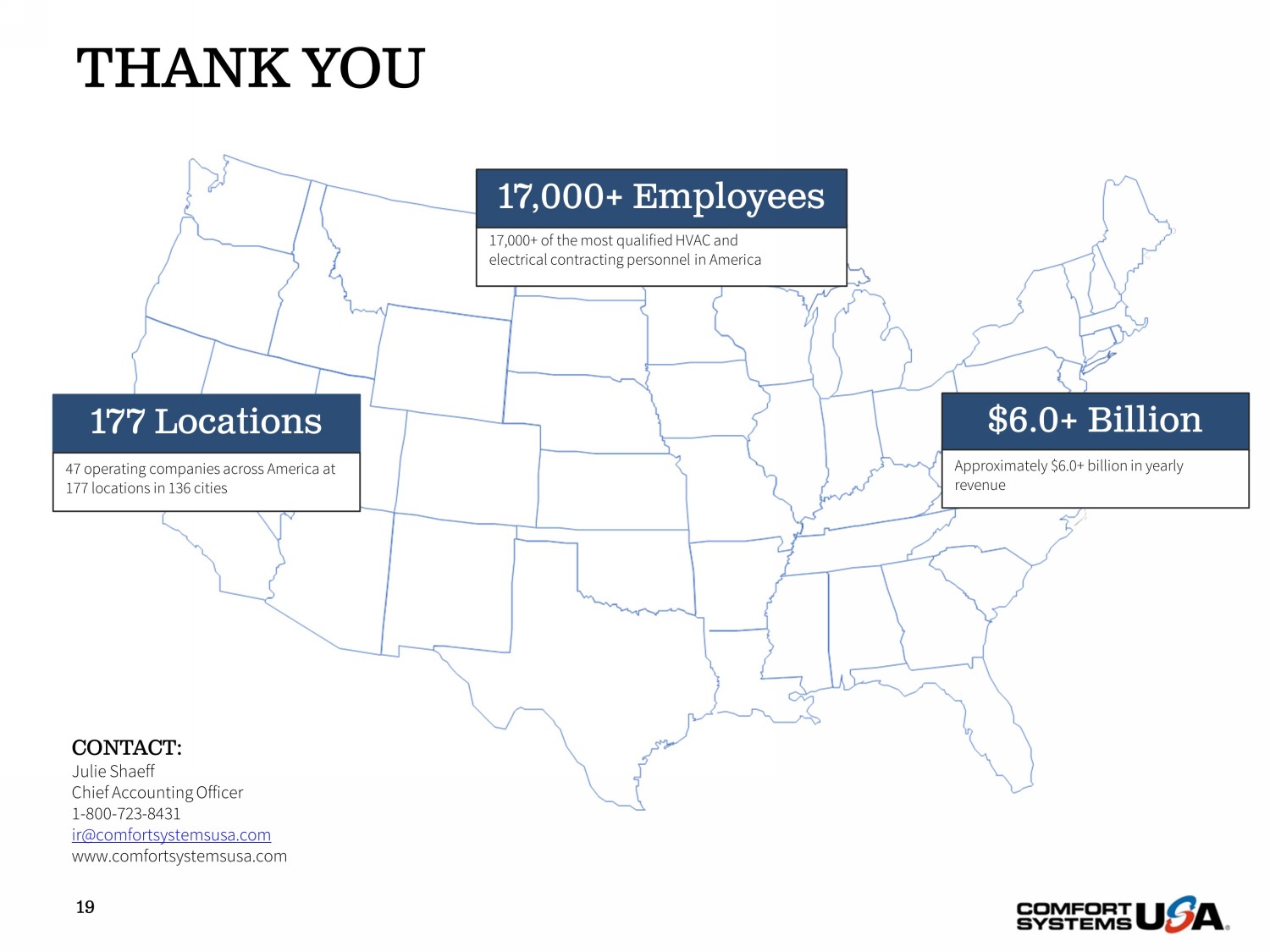 THANK YOU 19 177 Locations 47 operating companies across America at 177 locations in 136 cities 17,000+ of the most qualified HVAC and electrical contracting personnel in America 17,000+ Employees $6.0+ Billion Approximately $6.0+ billion in yearly revenue CONTACT: Julie Shaeff Chief Accounting Officer 1 - 800 - 723 - 8431 ir@comfortsystemsusa.com www.comfortsystemsusa.com