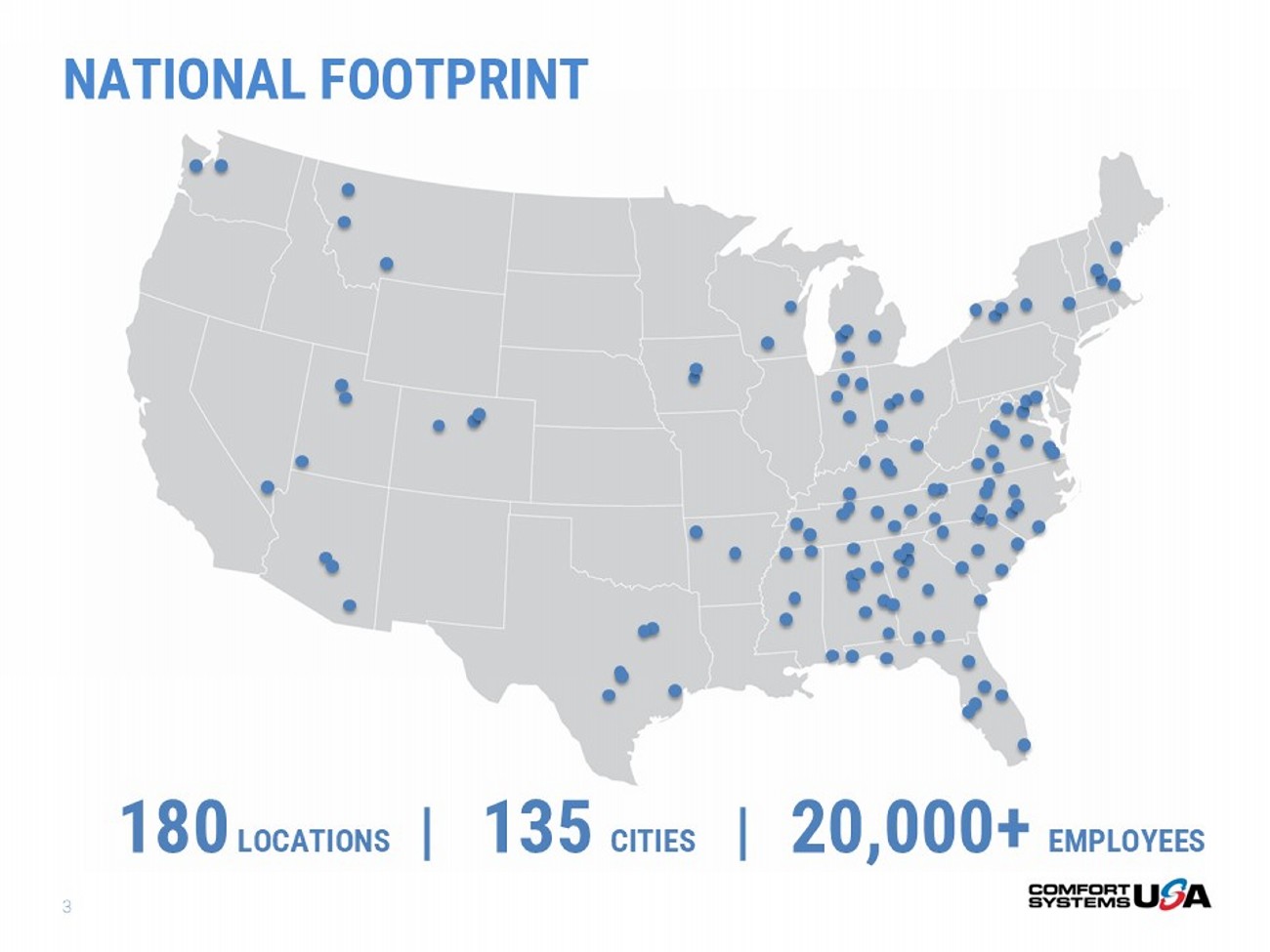 2 • Leading national mechanical, electrical, and plumbing (“MEP”) installation and service provider • $7.0+ billion yearly revenue • 63% industrial • 20,000+ employees • History of profitable growth and cash flow • Leading mechanical, electrical, and modular construction and service portfolio COMFORT SYSTEMS USA