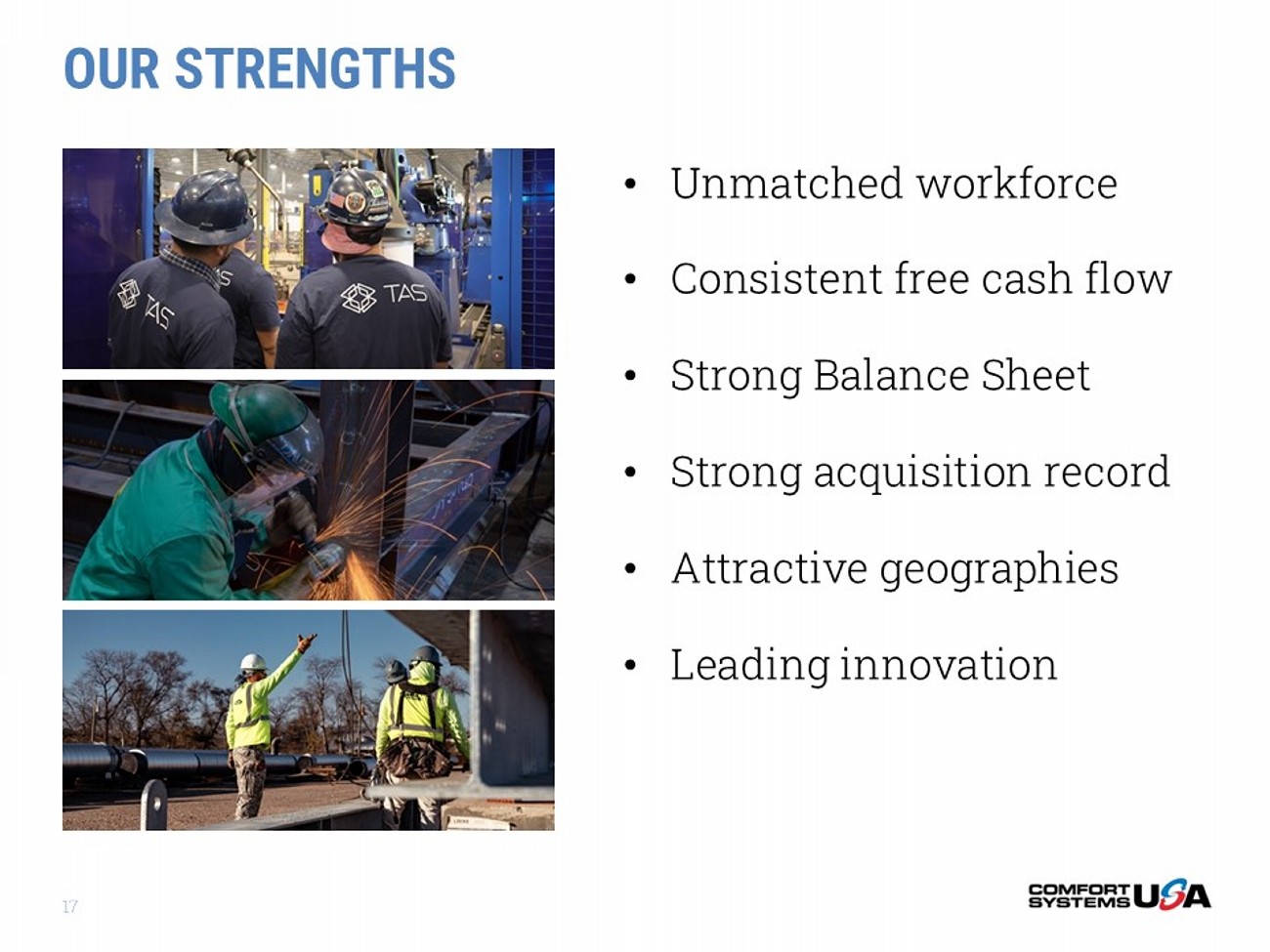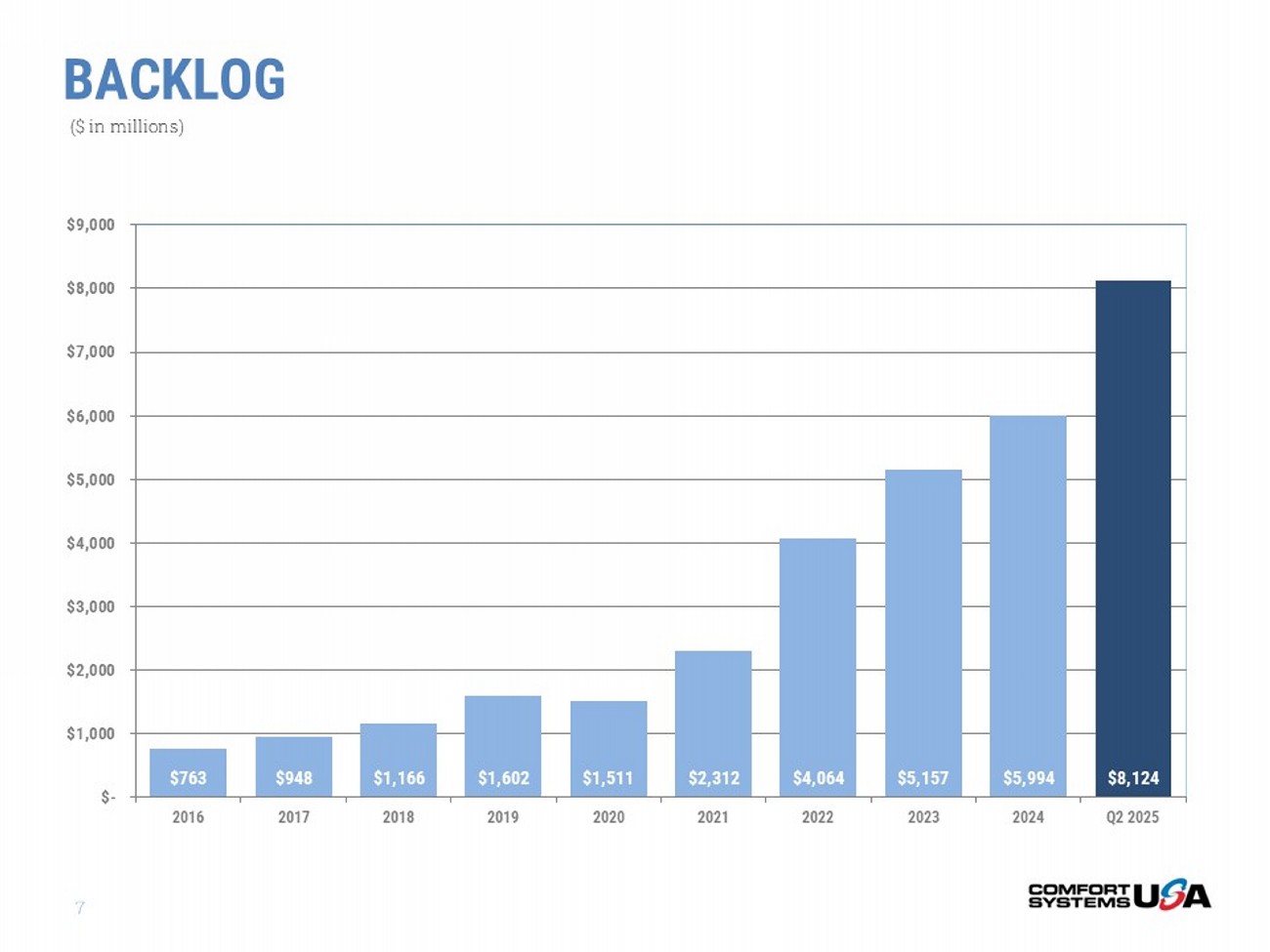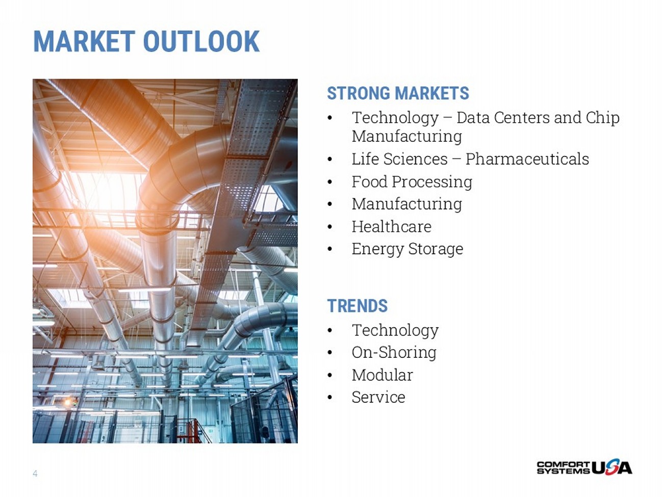 SAFE HARBOR Certain statements and information in this presentation may constitute forward - looking statements within the meaning of applicab le securities laws and regulations. The words “believe,” “expect,” “anticipate,” “plan,” “intend,” “foresee,” “should,” “would,” “could,” or other similar expres sio ns are intended to identify forward - looking statements, which are generally not historic in nature. These forward - looking statements are based on the current expectations a nd beliefs of Comfort Systems USA, Inc. and its subsidiaries (collectively, the “Company”) concerning future developments and their effect on the Company. While th e Company’s management believes that these forward - looking statements are reasonable as and when made, there can be no assurance that future developments affect ing the Company will be those that it anticipates, and the Company’s actual results of operations, financial condition and liquidity, and the development o f t he industry in which the Company operates, may differ materially from those made in or suggested by the forward - looking statements contained in this presentation . In addition, even if our results of operations, financial condition and liquidity, and the development of the industry in which we operate, are consistent with t he forward - looking statements contained in this presentation, those results or developments may not be indicative of our results or developments in subsequent period s. All comments concerning the Company’s expectations for future revenue and operating results are based on the Company’s forecasts for its existing operati ons and do not include the potential impact of any future acquisitions. The Company’s forward - looking statements involve significant risks and uncertainties (some of which are beyond the Company’s control) and assumptions that could cause actual future results to differ materially from the Company’s historical experience an d its present expectations or projections. Important factors that could cause actual results to differ materially from those in the forward - looking statements include, but are not limited to: the use of incorrect estimates for bidding a fixed - price contract; undertaking contractual commitments that exceed the Company’s labor reso urces; failing to perform contractual obligations efficiently enough to maintain profitability; national or regional weakness in construction activity and economic conditions; rising inflation and fluctuations in interest rates; shortages of labor and specialty building materials or material increases to the cost the reo f; the Company’s business being negatively affected by health crises or outbreaks of disease, such as epidemics or pandemics (and related impacts, such as supply chain dis ruptions); financial difficulties affecting projects, vendors, customers, or subcontractors; the Company’s backlog failing to translate into actual revenue or pro fits; failure of third party subcontractors and suppliers to complete work as anticipated; difficulty in obtaining, or increased costs associated with, bonding and insu ran ce; impairment to goodwill; errors in the Company’s cost - to - cost input method of accounting; the result of competition in the Company’s markets; the Company’s decentraliz ed management structure; material failure to comply with varying state and local laws, regulations or requirements; debarment from bidding on or perfo rmi ng government contracts; retention of key management; seasonal fluctuations in the demand for mechanical and electrical systems; the imposition of past and futu re liability from environmental, safety, and health regulations including the inherent risk associated with self - insurance; adverse litigation results; an increase in ou r effective tax rate; a material information technology failure or a material cyber security breach; risks associated with acquisitions, such as challenges to ou r ability to integrate those companies into our internal control environment; our ability to manage growth and geographically - dispersed operations; our ability to obta in financing on acceptable terms; extreme weather conditions (such as storms, droughts, extreme heat or cold, wildfires and floods), including as a result of c lim ate change, and any resulting regulations or restrictions related thereto; and other risks detailed in our reports filed with the Securities and Exchange Com mission (the “SEC”). For additional information regarding known material factors that could cause the Company’s results to differ from its project ed results, please see its filings with the SEC, including its Annual Report on Form 10 - K, Quarterly Reports on Form 10 - Q, and Current Reports on Form 8 - K. Readers are cautioned not to place undue reliance on forward - looking statements, which speak only as of the date hereof. The Company undertakes no obligation to publicly update or revise any forward - looking statements after the date they are made, whether because of new information, future events, or otherwise. NON - GAAP MEASURES Certain measures in this presentation are not measures calculated in accordance with generally accepted accounting principles (“ GAAP”). They should not be considered a replacement for GAAP results. Non - GAAP financial measures appearing in these slides are identified in the footnote. See the Appendices for a reconciliation of these non - GAAP measures to the most comparable GAAP financial measures.