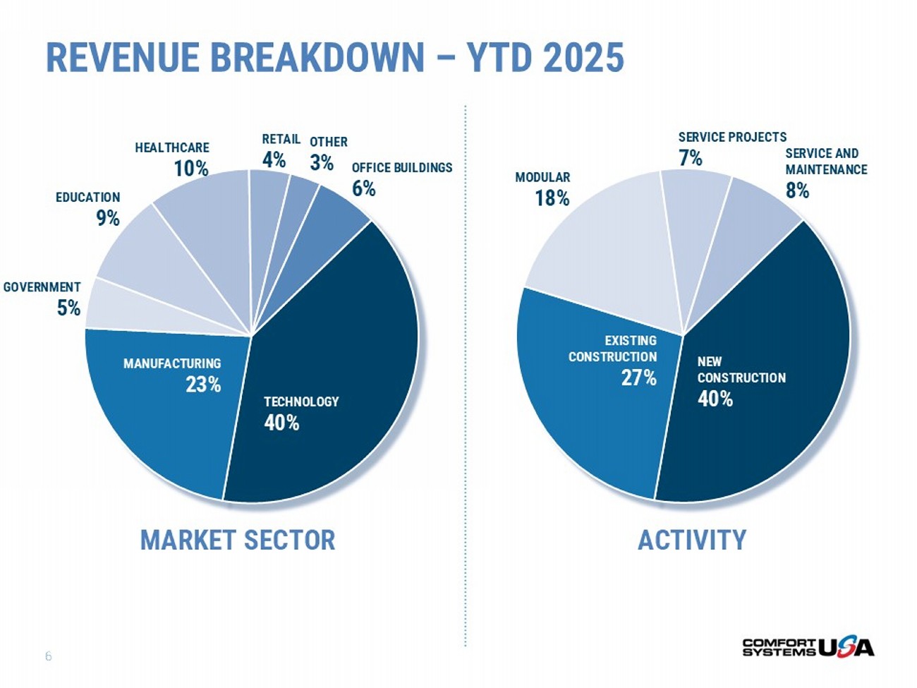 5 REVENUE GROSS PROFIT YTD 2025 Gross Profit = $913.3M YTD 2025 Revenue = $4,004.6M SEGMENT BREAKDOWN – YTD 2025 MECHANICAL 76% ELECTRICAL 24% MECHANICAL 74% ELECTRICAL 26%