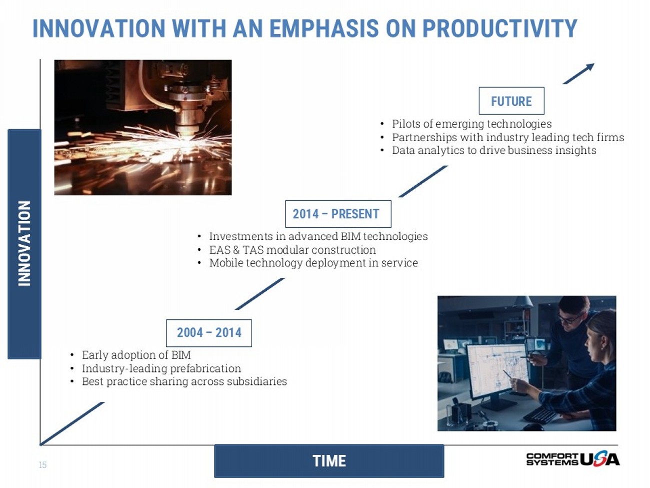 Foster a safe, collaborative, and inclusive environment for our employees • Recently launched a Talent Advisory Group, consisting of a broad group of internal stakeholders to ensure the Company continually takes meaningful steps to remain an inclusive place of business. • 100% of operational sites have conducted an employee health and safety risk assessment and utilize the CAUSE Mapping program and the “5x5” initiative. • As part of our commitment to employee health and well - being, Comfort Systems USA offers all employees and family members in their household access to 24/7 support for confidential emotional support, work - life solutions, legal guidance, financial resources, and suicide prevention. Our sustainability goals are embedded in how we operate as a business – they are part of our very foundation and core values of being safe, honest, respectful, collaborative, and innovative – and we have diligently sought to develop transparent disclosures to su pport our sustainability commitments. As a company, we recognize that while our work lends itself to sustainable best practices, th ere is more we can do to create a positive impact. We are committed to a continual improvement approach to sustainability. PEOPLE PARTNERS PLANET Be reliable, honest, and innovative partners to our customers and suppliers • 100% of all operational sites have completed an internal audit/risk assessment concerning business ethics issues. • Bronze EcoVadis Sustainability Rating achieved in 2024. • Best in - class cybersecurity program. • We report under the GRI, SASB, and IFRS Sustainability Disclosure Standards and are a signatory to the UN Global Compact. • Developed a Supplier Diversity Program and launched a Supplier Code of Conduct in 2021. • Developed and implemented a Human Rights Policy in 2022. Operate with the intention to positively impact the environment through our work and the services we provide to our customers • Comfort Systems USA has completed a Greenhouse Gas ("GHG") Inventory covering all relevant Scope 1 and 2 emissions across our operations since 2021, facilitating a deeper analysis and comparative data in our 2024 Sustainability Report. • In 2024, we conducted a Scope 3 emissions readiness assessment. • In April 2025, we announced a target to reduce Scope 1 and 2 emissions on an intensity basis by 35% by 2035, using a 2023 baseline. • To meet our reduction goals, we’re conducting energy efficiency audits at opcos and have kicked off an electric vehicle pilot program. Energy Efficiency GHG Emissions Data Privacy/ Cybersecurity Risk Management Employee Hiring and Retention Training and Development Worker Health and Safety Diversity, Equity, and Inclusion Material Topics Material Topics Material Topics SUSTAINABILITY OVERVIEW 14