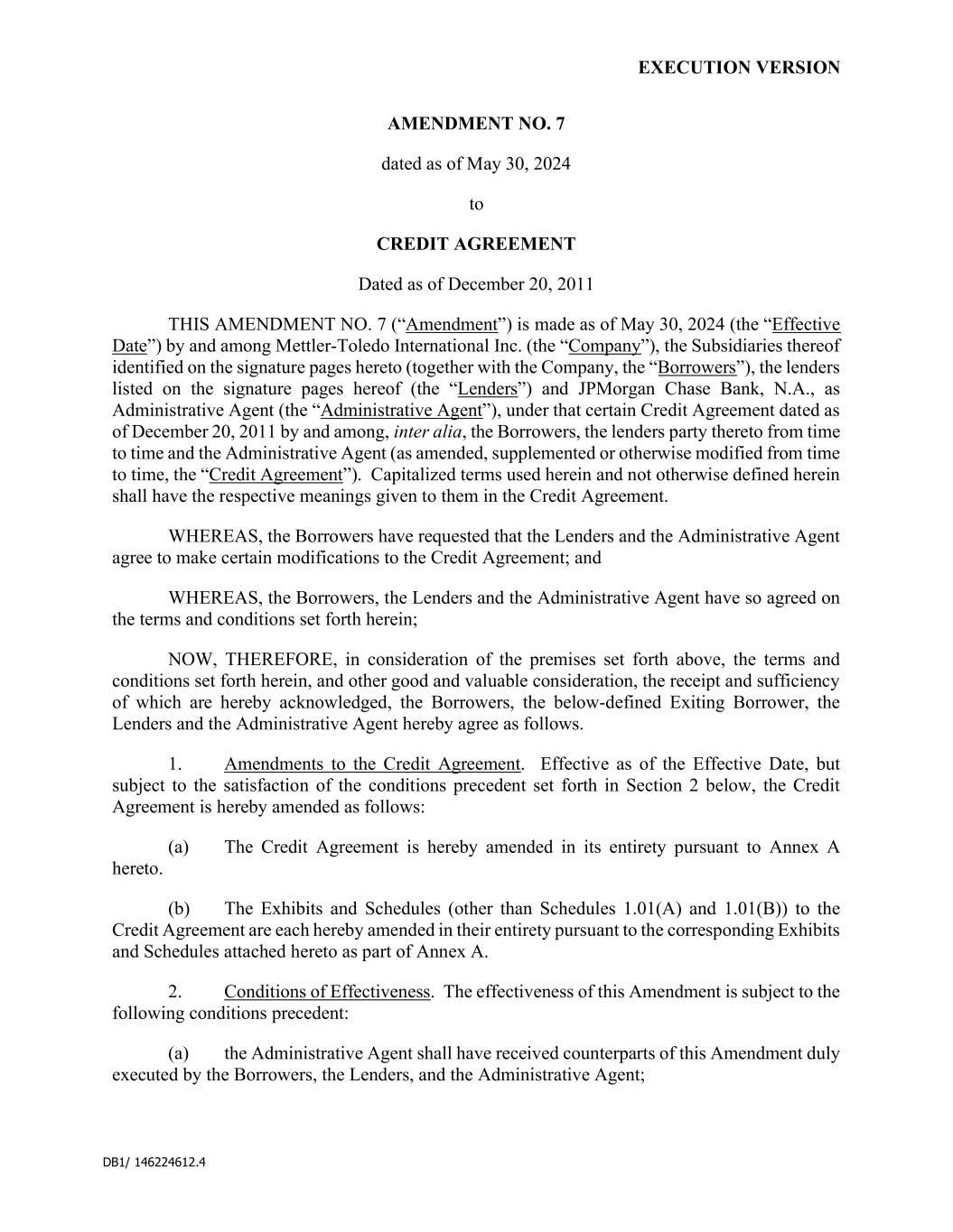EXECUTION VERSION DB1/ 146224612.4 AMENDMENT NO. 7 dated as of May 30, 2024 to CREDIT AGREEMENT Dated as of December 20, 2011 THIS AMENDMENT NO. 7 (“Amendment”) is made as of May 30, 2024 (the “Effective Date”) by and among Mettler-Toledo International Inc. (the “Company”), the Subsidiaries thereof identified on the signature pages hereto (together with the Company, the “Borrowers”), the lenders listed on the signature pages hereof (the “Lenders”) and JPMorgan Chase Bank, N.A., as Administrative Agent (the “Administrative Agent”), under that certain Credit Agreement dated as of December 20, 2011 by and among, inter alia, the Borrowers, the lenders party thereto from time to time and the Administrative Agent (as amended, supplemented or otherwise modified from time to time, the “Credit Agreement”). Capitalized terms used herein and not otherwise defined herein shall have the respective meanings given to them in the Credit Agreement. WHEREAS, the Borrowers have requested that the Lenders and the Administrative Agent agree to make certain modifications to the Credit Agreement; and WHEREAS, the Borrowers, the Lenders and the Administrative Agent have so agreed on the terms and conditions set forth herein; NOW, THEREFORE, in consideration of the premises set forth above, the terms and conditions set forth herein, and other good and valuable consideration, the receipt and sufficiency of which are hereby acknowledged, the Borrowers, the below-defined Exiting Borrower, the Lenders and the Administrative Agent hereby agree as follows. 1. Amendments to the Credit Agreement. Effective as of the Effective Date, but subject to the satisfaction of the conditions precedent set forth in Section 2 below, the Credit Agreement is hereby amended as follows: (a) The Credit Agreement is hereby amended in its entirety pursuant to Annex A hereto. (b) The Exhibits and Schedules (other than Schedules 1.01(A) and 1.01(B)) to the Credit Agreement are each hereby amended in their entirety pursuant to the corresponding Exhibits and Schedules attached hereto as part of Annex A. 2. Conditions of Effectiveness. The effectiveness of this Amendment is subject to the following conditions precedent: (a) the Administrative Agent shall have received counterparts of this Amendment duly executed by the Borrowers, the Lenders, and the Administrative Agent;