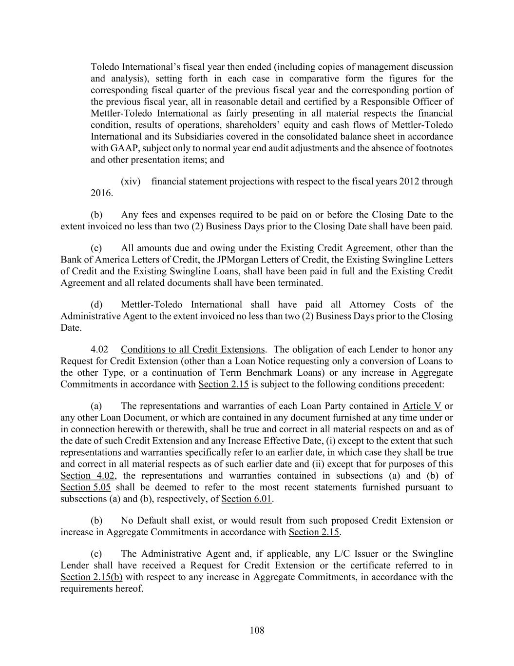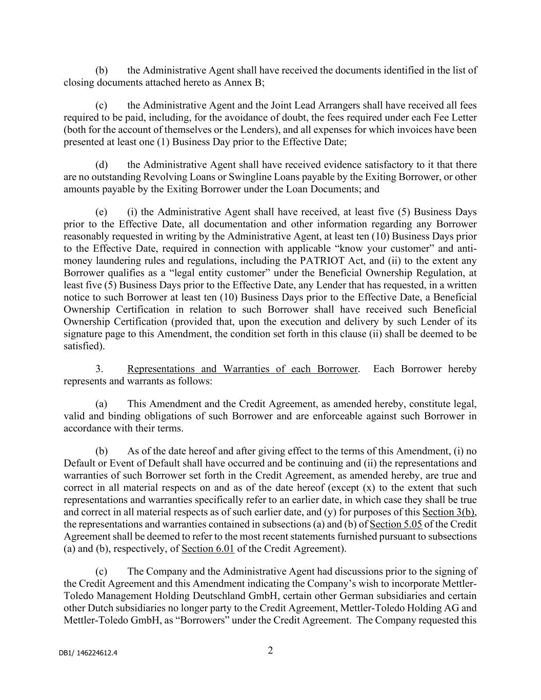 DB1/ 146224612.4 2 (b) the Administrative Agent shall have received the documents identified in the list of closing documents attached hereto as Annex B; (c) the Administrative Agent and the Joint Lead Arrangers shall have received all fees required to be paid, including, for the avoidance of doubt, the fees required under each Fee Letter (both for the account of themselves or the Lenders), and all expenses for which invoices have been presented at least one (1) Business Day prior to the Effective Date; (d) the Administrative Agent shall have received evidence satisfactory to it that there are no outstanding Revolving Loans or Swingline Loans payable by the Exiting Borrower, or other amounts payable by the Exiting Borrower under the Loan Documents; and (e) (i) the Administrative Agent shall have received, at least five (5) Business Days prior to the Effective Date, all documentation and other information regarding any Borrower reasonably requested in writing by the Administrative Agent, at least ten (10) Business Days prior to the Effective Date, required in connection with applicable “know your customer” and anti- money laundering rules and regulations, including the PATRIOT Act, and (ii) to the extent any Borrower qualifies as a “legal entity customer” under the Beneficial Ownership Regulation, at least five (5) Business Days prior to the Effective Date, any Lender that has requested, in a written notice to such Borrower at least ten (10) Business Days prior to the Effective Date, a Beneficial Ownership Certification in relation to such Borrower shall have received such Beneficial Ownership Certification (provided that, upon the execution and delivery by such Lender of its signature page to this Amendment, the condition set forth in this clause (ii) shall be deemed to be satisfied). 3. Representations and Warranties of each Borrower. Each Borrower hereby represents and warrants as follows: (a) This Amendment and the Credit Agreement, as amended hereby, constitute legal, valid and binding obligations of such Borrower and are enforceable against such Borrower in accordance with their terms. (b) As of the date hereof and after giving effect to the terms of this Amendment, (i) no Default or Event of Default shall have occurred and be continuing and (ii) the representations and warranties of such Borrower set forth in the Credit Agreement, as amended hereby, are true and correct in all material respects on and as of the date hereof (except (x) to the extent that such representations and warranties specifically refer to an earlier date, in which case they shall be true and correct in all material respects as of such earlier date, and (y) for purposes of this Section 3(b), the representations and warranties contained in subsections (a) and (b) of Section 5.05 of the Credit Agreement shall be deemed to refer to the most recent statements furnished pursuant to subsections (a) and (b), respectively, of Section 6.01 of the Credit Agreement). (c) The Company and the Administrative Agent had discussions prior to the signing of the Credit Agreement and this Amendment indicating the Company’s wish to incorporate Mettler- Toledo Management Holding Deutschland GmbH, certain other German subsidiaries and certain other Dutch subsidiaries no longer party to the Credit Agreement, Mettler-Toledo Holding AG and Mettler-Toledo GmbH, as “Borrowers” under the Credit Agreement. The Company requested this