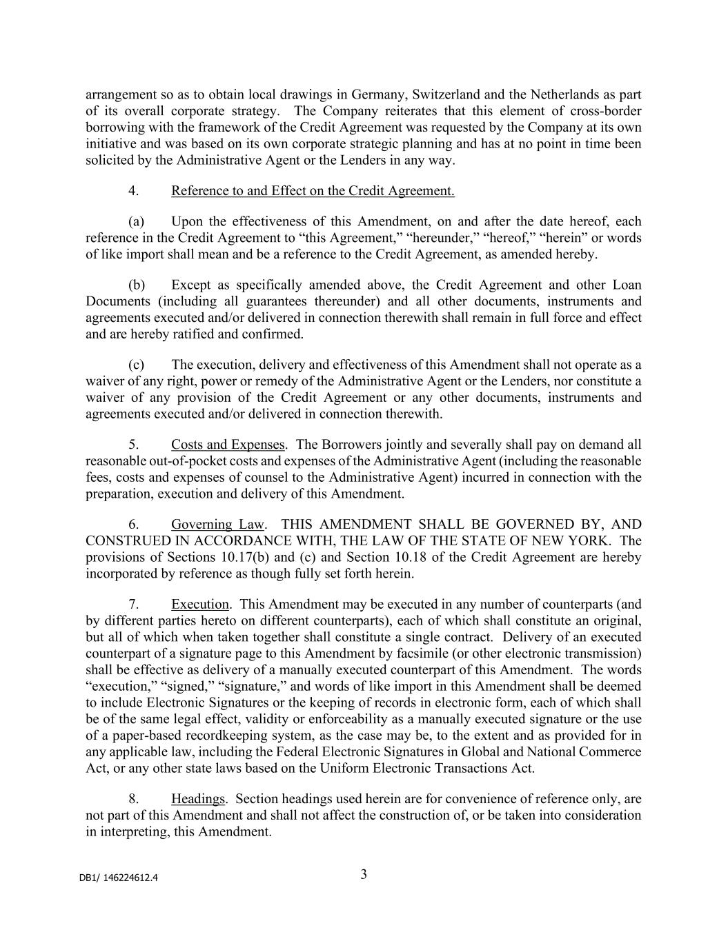 DB1/ 146224612.4 3 arrangement so as to obtain local drawings in Germany, Switzerland and the Netherlands as part of its overall corporate strategy. The Company reiterates that this element of cross-border borrowing with the framework of the Credit Agreement was requested by the Company at its own initiative and was based on its own corporate strategic planning and has at no point in time been solicited by the Administrative Agent or the Lenders in any way. 4. Reference to and Effect on the Credit Agreement. (a) Upon the effectiveness of this Amendment, on and after the date hereof, each reference in the Credit Agreement to “this Agreement,” “hereunder,” “hereof,” “herein” or words of like import shall mean and be a reference to the Credit Agreement, as amended hereby. (b) Except as specifically amended above, the Credit Agreement and other Loan Documents (including all guarantees thereunder) and all other documents, instruments and agreements executed and/or delivered in connection therewith shall remain in full force and effect and are hereby ratified and confirmed. (c) The execution, delivery and effectiveness of this Amendment shall not operate as a waiver of any right, power or remedy of the Administrative Agent or the Lenders, nor constitute a waiver of any provision of the Credit Agreement or any other documents, instruments and agreements executed and/or delivered in connection therewith. 5. Costs and Expenses. The Borrowers jointly and severally shall pay on demand all reasonable out-of-pocket costs and expenses of the Administrative Agent (including the reasonable fees, costs and expenses of counsel to the Administrative Agent) incurred in connection with the preparation, execution and delivery of this Amendment. 6. Governing Law. THIS AMENDMENT SHALL BE GOVERNED BY, AND CONSTRUED IN ACCORDANCE WITH, THE LAW OF THE STATE OF NEW YORK. The provisions of Sections 10.17(b) and (c) and Section 10.18 of the Credit Agreement are hereby incorporated by reference as though fully set forth herein. 7. Execution. This Amendment may be executed in any number of counterparts (and by different parties hereto on different counterparts), each of which shall constitute an original, but all of which when taken together shall constitute a single contract. Delivery of an executed counterpart of a signature page to this Amendment by facsimile (or other electronic transmission) shall be effective as delivery of a manually executed counterpart of this Amendment. The words “execution,” “signed,” “signature,” and words of like import in this Amendment shall be deemed to include Electronic Signatures or the keeping of records in electronic form, each of which shall be of the same legal effect, validity or enforceability as a manually executed signature or the use of a paper-based recordkeeping system, as the case may be, to the extent and as provided for in any applicable law, including the Federal Electronic Signatures in Global and National Commerce Act, or any other state laws based on the Uniform Electronic Transactions Act. 8. Headings. Section headings used herein are for convenience of reference only, are not part of this Amendment and shall not affect the construction of, or be taken into consideration in interpreting, this Amendment.