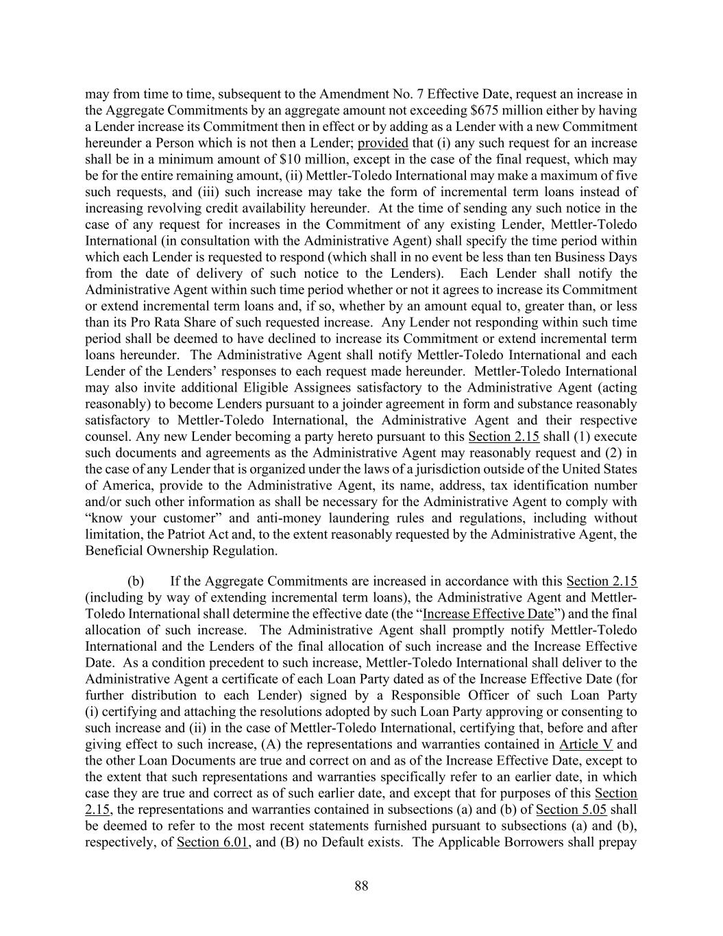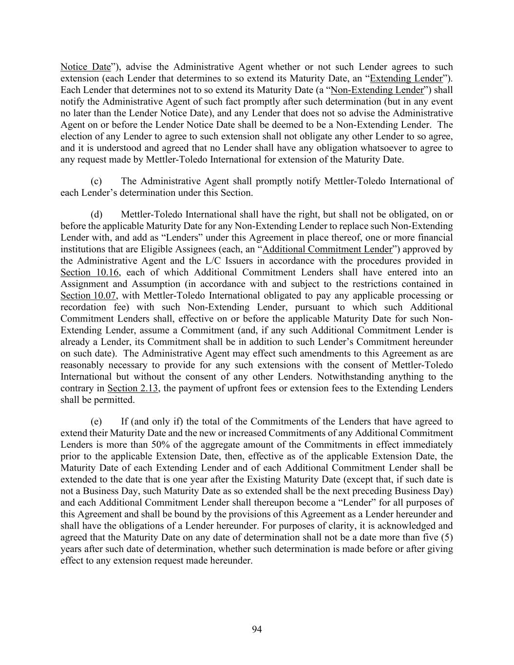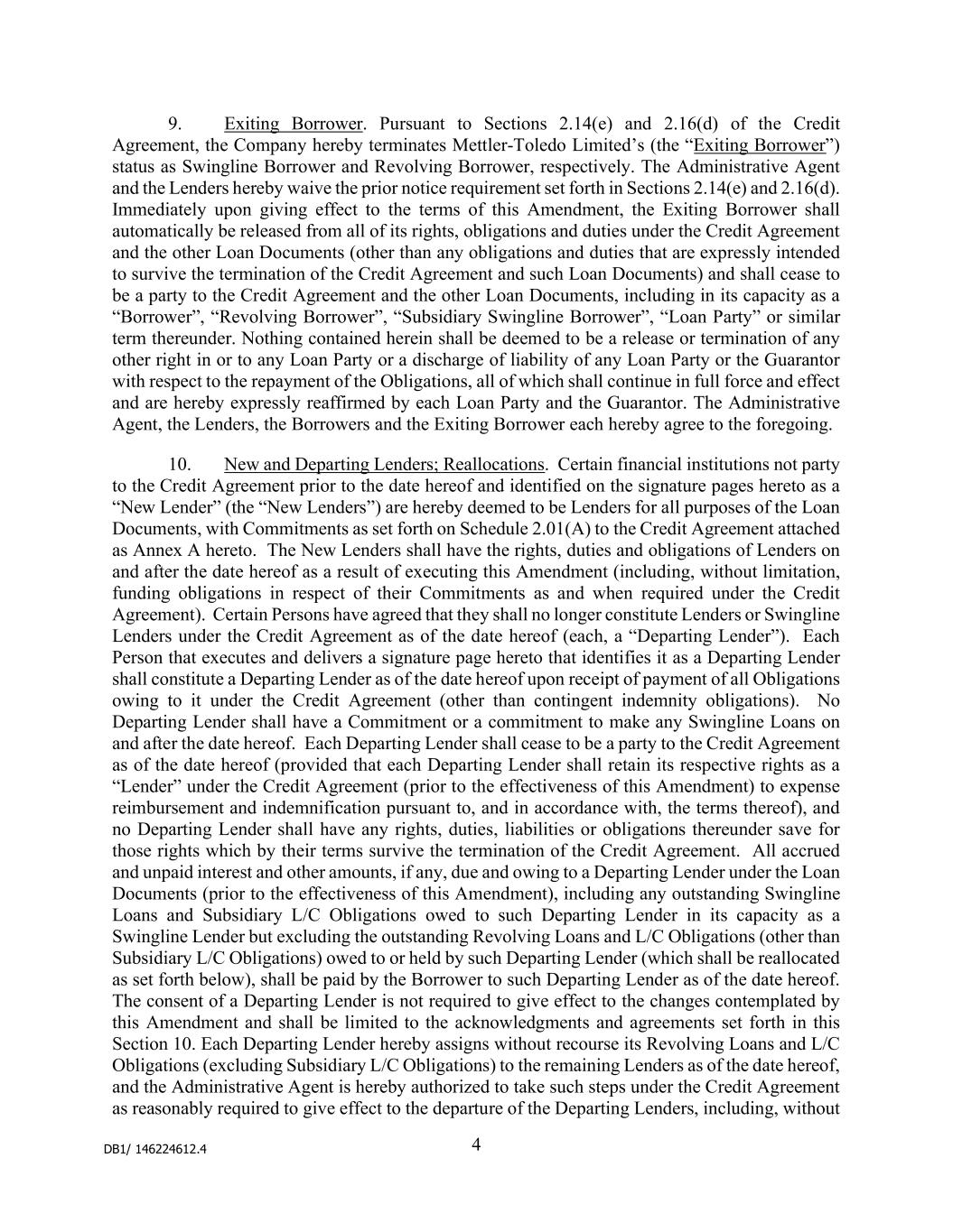DB1/ 146224612.4 4 9. Exiting Borrower. Pursuant to Sections 2.14(e) and 2.16(d) of the Credit Agreement, the Company hereby terminates Mettler-Toledo Limited’s (the “Exiting Borrower”) status as Swingline Borrower and Revolving Borrower, respectively. The Administrative Agent and the Lenders hereby waive the prior notice requirement set forth in Sections 2.14(e) and 2.16(d). Immediately upon giving effect to the terms of this Amendment, the Exiting Borrower shall automatically be released from all of its rights, obligations and duties under the Credit Agreement and the other Loan Documents (other than any obligations and duties that are expressly intended to survive the termination of the Credit Agreement and such Loan Documents) and shall cease to be a party to the Credit Agreement and the other Loan Documents, including in its capacity as a “Borrower”, “Revolving Borrower”, “Subsidiary Swingline Borrower”, “Loan Party” or similar term thereunder. Nothing contained herein shall be deemed to be a release or termination of any other right in or to any Loan Party or a discharge of liability of any Loan Party or the Guarantor with respect to the repayment of the Obligations, all of which shall continue in full force and effect and are hereby expressly reaffirmed by each Loan Party and the Guarantor. The Administrative Agent, the Lenders, the Borrowers and the Exiting Borrower each hereby agree to the foregoing. 10. New and Departing Lenders; Reallocations. Certain financial institutions not party to the Credit Agreement prior to the date hereof and identified on the signature pages hereto as a “New Lender” (the “New Lenders”) are hereby deemed to be Lenders for all purposes of the Loan Documents, with Commitments as set forth on Schedule 2.01(A) to the Credit Agreement attached as Annex A hereto. The New Lenders shall have the rights, duties and obligations of Lenders on and after the date hereof as a result of executing this Amendment (including, without limitation, funding obligations in respect of their Commitments as and when required under the Credit Agreement). Certain Persons have agreed that they shall no longer constitute Lenders or Swingline Lenders under the Credit Agreement as of the date hereof (each, a “Departing Lender”). Each Person that executes and delivers a signature page hereto that identifies it as a Departing Lender shall constitute a Departing Lender as of the date hereof upon receipt of payment of all Obligations owing to it under the Credit Agreement (other than contingent indemnity obligations). No Departing Lender shall have a Commitment or a commitment to make any Swingline Loans on and after the date hereof. Each Departing Lender shall cease to be a party to the Credit Agreement as of the date hereof (provided that each Departing Lender shall retain its respective rights as a “Lender” under the Credit Agreement (prior to the effectiveness of this Amendment) to expense reimbursement and indemnification pursuant to, and in accordance with, the terms thereof), and no Departing Lender shall have any rights, duties, liabilities or obligations thereunder save for those rights which by their terms survive the termination of the Credit Agreement. All accrued and unpaid interest and other amounts, if any, due and owing to a Departing Lender under the Loan Documents (prior to the effectiveness of this Amendment), including any outstanding Swingline Loans and Subsidiary L/C Obligations owed to such Departing Lender in its capacity as a Swingline Lender but excluding the outstanding Revolving Loans and L/C Obligations (other than Subsidiary L/C Obligations) owed to or held by such Departing Lender (which shall be reallocated as set forth below), shall be paid by the Borrower to such Departing Lender as of the date hereof. The consent of a Departing Lender is not required to give effect to the changes contemplated by this Amendment and shall be limited to the acknowledgments and agreements set forth in this Section 10. Each Departing Lender hereby assigns without recourse its Revolving Loans and L/C Obligations (excluding Subsidiary L/C Obligations) to the remaining Lenders as of the date hereof, and the Administrative Agent is hereby authorized to take such steps under the Credit Agreement as reasonably required to give effect to the departure of the Departing Lenders, including, without