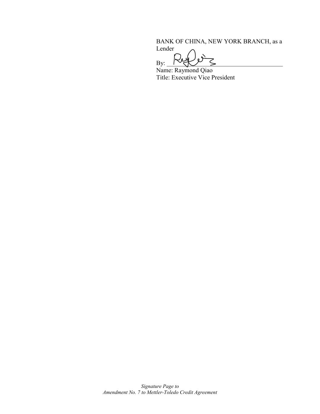 Signature Page to Amendment No. 7 to Mettler-Toledo Credit Agreement BANK OF CHINA, NEW YORK BRANCH, as a Lender By: _____________________________________ Name: Raymond Qiao Title: Executive Vice President