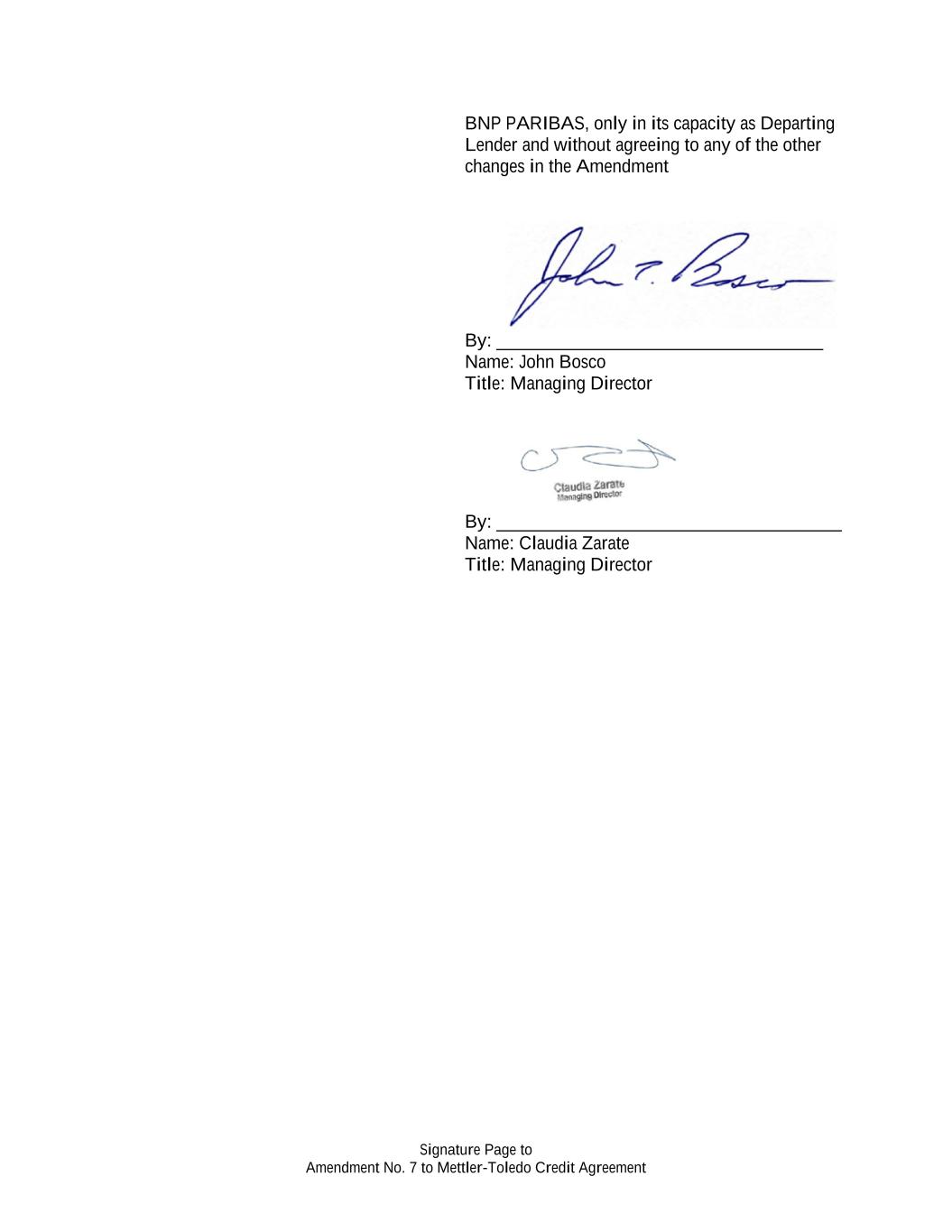 Signature Page to Amendment No. 7 to Mettler-Toledo Credit Agreement BNP PARIBAS, only in its capacity as Departing Lender and without agreeing to any of the other changes in the Amendment By: ___________________________________ Name: John Bosco Title: Managing Director By: _____________________________________ Name: Claudia Zarate Title: Managing Director