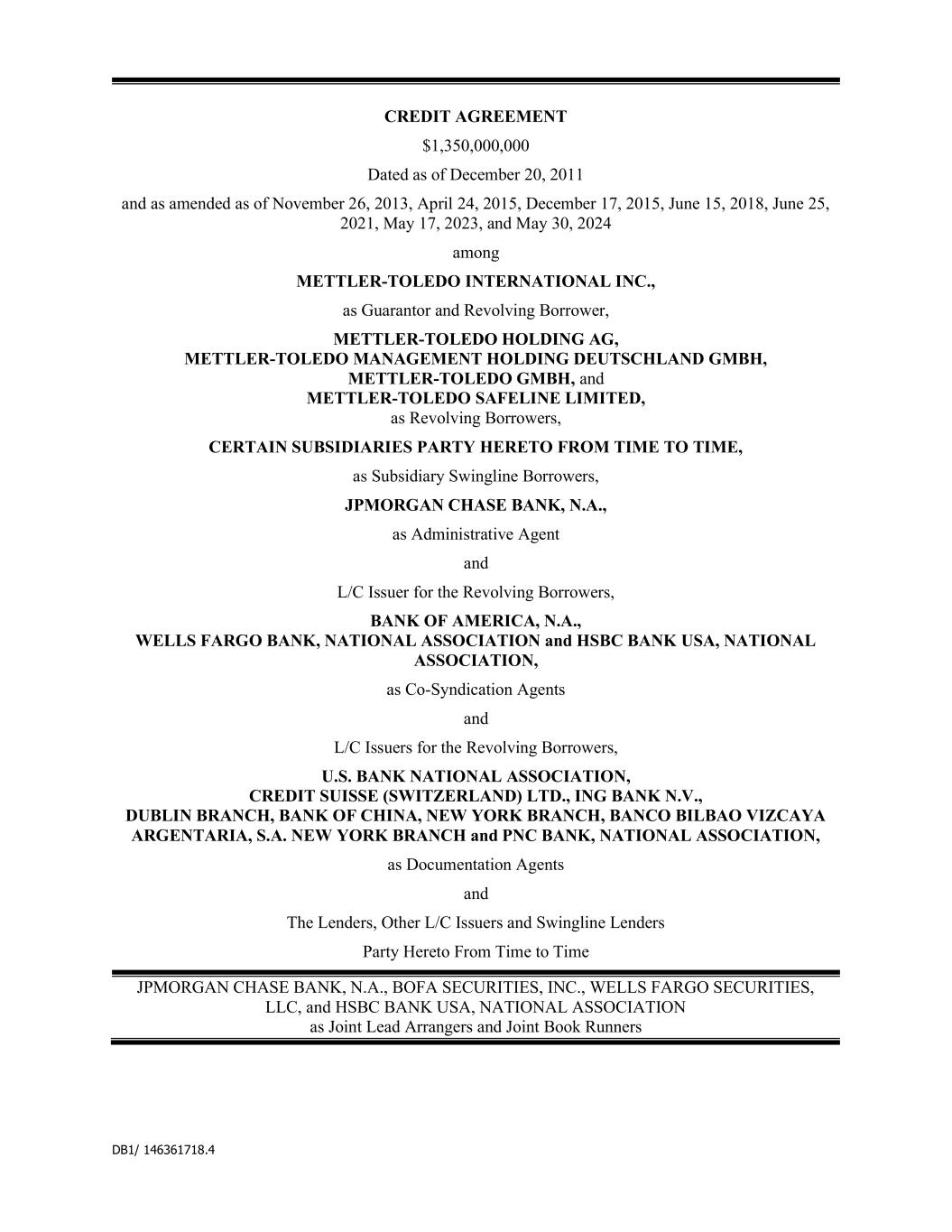 DB1/ 146361718.4 CREDIT AGREEMENT $1,350,000,000 Dated as of December 20, 2011 and as amended as of November 26, 2013, April 24, 2015, December 17, 2015, June 15, 2018, June 25, 2021, May 17, 2023, and May 30, 2024 among METTLER-TOLEDO INTERNATIONAL INC., as Guarantor and Revolving Borrower, METTLER-TOLEDO HOLDING AG, METTLER-TOLEDO MANAGEMENT HOLDING DEUTSCHLAND GMBH, METTLER-TOLEDO GMBH, and METTLER-TOLEDO SAFELINE LIMITED, as Revolving Borrowers, CERTAIN SUBSIDIARIES PARTY HERETO FROM TIME TO TIME, as Subsidiary Swingline Borrowers, JPMORGAN CHASE BANK, N.A., as Administrative Agent and L/C Issuer for the Revolving Borrowers, BANK OF AMERICA, N.A., WELLS FARGO BANK, NATIONAL ASSOCIATION and HSBC BANK USA, NATIONAL ASSOCIATION, as Co-Syndication Agents and L/C Issuers for the Revolving Borrowers, U.S. BANK NATIONAL ASSOCIATION, CREDIT SUISSE (SWITZERLAND) LTD., ING BANK N.V., DUBLIN BRANCH, BANK OF CHINA, NEW YORK BRANCH, BANCO BILBAO VIZCAYA ARGENTARIA, S.A. NEW YORK BRANCH and PNC BANK, NATIONAL ASSOCIATION, as Documentation Agents and The Lenders, Other L/C Issuers and Swingline Lenders Party Hereto From Time to Time JPMORGAN CHASE BANK, N.A., BOFA SECURITIES, INC., WELLS FARGO SECURITIES, LLC, and HSBC BANK USA, NATIONAL ASSOCIATION as Joint Lead Arrangers and Joint Book Runners