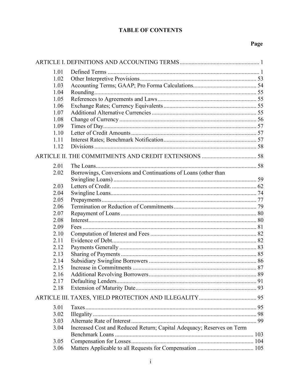 TABLE OF CONTENTS Page i ARTICLE I. DEFINITIONS AND ACCOUNTING TERMS ...................................................... 1 1.01 Defined Terms ....................................................................................................... 1 1.02 Other Interpretive Provisions ............................................................................... 53 1.03 Accounting Terms; GAAP; Pro Forma Calculations........................................... 54 1.04 Rounding .............................................................................................................. 55 1.05 References to Agreements and Laws ................................................................... 55 1.06 Exchange Rates; Currency Equivalents ............................................................... 55 1.07 Additional Alternative Currencies ....................................................................... 55 1.08 Change of Currency ............................................................................................. 56 1.09 Times of Day........................................................................................................ 57 1.10 Letter of Credit Amounts ..................................................................................... 57 1.11 Interest Rates; Benchmark Notification ............................................................... 57 1.12 Divisions .............................................................................................................. 58 ARTICLE II. THE COMMITMENTS AND CREDIT EXTENSIONS ..................................... 58 2.01 The Loans............................................................................................................. 58 2.02 Borrowings, Conversions and Continuations of Loans (other than Swingline Loans) ................................................................................................. 59 2.03 Letters of Credit. .................................................................................................. 62 2.04 Swingline Loans................................................................................................... 74 2.05 Prepayments ......................................................................................................... 77 2.06 Termination or Reduction of Commitments ........................................................ 79 2.07 Repayment of Loans ............................................................................................ 80 2.08 Interest.................................................................................................................. 80 2.09 Fees ...................................................................................................................... 81 2.10 Computation of Interest and Fees ........................................................................ 82 2.11 Evidence of Debt.................................................................................................. 82 2.12 Payments Generally ............................................................................................. 83 2.13 Sharing of Payments ............................................................................................ 85 2.14 Subsidiary Swingline Borrowers ......................................................................... 86 2.15 Increase in Commitments .................................................................................... 87 2.16 Additional Revolving Borrowers ......................................................................... 89 2.17 Defaulting Lenders............................................................................................... 91 2.18 Extension of Maturity Date .................................................................................. 93 ARTICLE III. TAXES, YIELD PROTECTION AND ILLEGALITY ....................................... 95 3.01 Taxes .................................................................................................................... 95 3.02 Illegality ............................................................................................................... 98 3.03 Alternate Rate of Interest ..................................................................................... 99 3.04 Increased Cost and Reduced Return; Capital Adequacy; Reserves on Term Benchmark Loans .............................................................................................. 103 3.05 Compensation for Losses ................................................................................... 104 3.06 Matters Applicable to all Requests for Compensation ...................................... 105