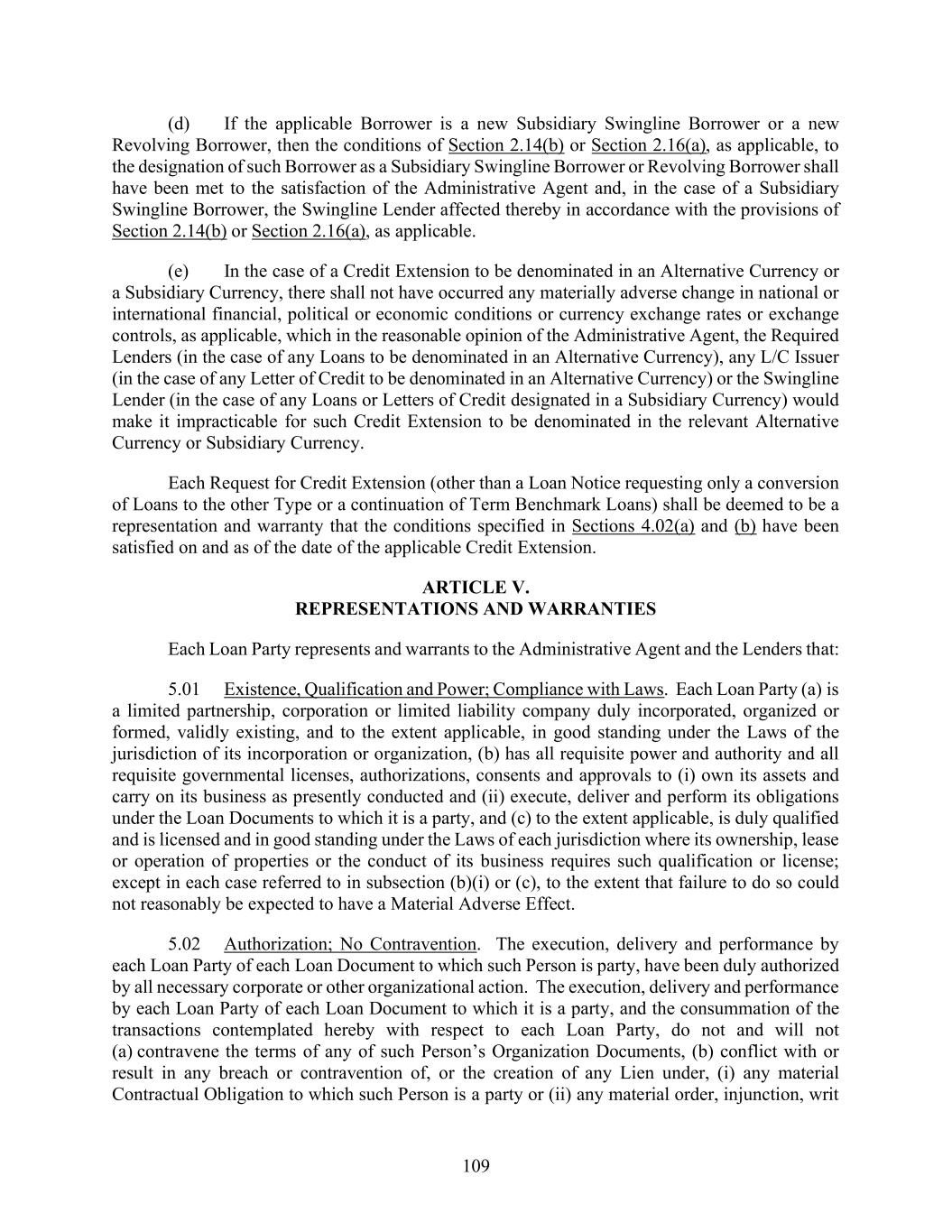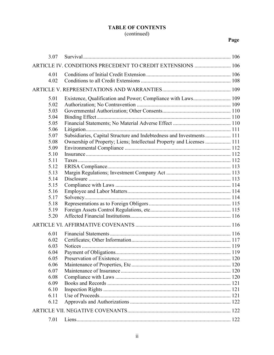 TABLE OF CONTENTS (continued) Page ii 3.07 Survival .............................................................................................................. 106 ARTICLE IV. CONDITIONS PRECEDENT TO CREDIT EXTENSIONS ........................... 106 4.01 Conditions of Initial Credit Extension ............................................................... 106 4.02 Conditions to all Credit Extensions ................................................................... 108 ARTICLE V. REPRESENTATIONS AND WARRANTIES ................................................... 109 5.01 Existence, Qualification and Power; Compliance with Laws ............................ 109 5.02 Authorization; No Contravention ...................................................................... 109 5.03 Governmental Authorization; Other Consents................................................... 110 5.04 Binding Effect .................................................................................................... 110 5.05 Financial Statements; No Material Adverse Effect ........................................... 110 5.06 Litigation ............................................................................................................ 111 5.07 Subsidiaries, Capital Structure and Indebtedness and Investments ................... 111 5.08 Ownership of Property; Liens; Intellectual Property and Licenses ................... 111 5.09 Environmental Compliance ............................................................................... 112 5.10 Insurance ............................................................................................................ 112 5.11 Taxes .................................................................................................................. 112 5.12 ERISA Compliance ............................................................................................ 113 5.13 Margin Regulations; Investment Company Act ................................................ 113 5.14 Disclosure .......................................................................................................... 113 5.15 Compliance with Laws ...................................................................................... 114 5.16 Employee and Labor Matters ............................................................................. 114 5.17 Solvency ............................................................................................................. 114 5.18 Representations as to Foreign Obligors ............................................................. 115 5.19 Foreign Assets Control Regulations, etc ............................................................ 115 5.20 Affected Financial Institutions ........................................................................... 116 ARTICLE VI. AFFIRMATIVE COVENANTS ....................................................................... 116 6.01 Financial Statements .......................................................................................... 116 6.02 Certificates; Other Information .......................................................................... 117 6.03 Notices ............................................................................................................... 119 6.04 Payment of Obligations...................................................................................... 119 6.05 Preservation of Existence ................................................................................... 120 6.06 Maintenance of Properties, Etc .......................................................................... 120 6.07 Maintenance of Insurance .................................................................................. 120 6.08 Compliance with Laws ...................................................................................... 120 6.09 Books and Records ............................................................................................ 121 6.10 Inspection Rights ............................................................................................... 121 6.11 Use of Proceeds.................................................................................................. 121 6.12 Approvals and Authorizations ........................................................................... 122 ARTICLE VII. NEGATIVE COVENANTS ............................................................................. 122 7.01 Liens ................................................................................................................... 122
