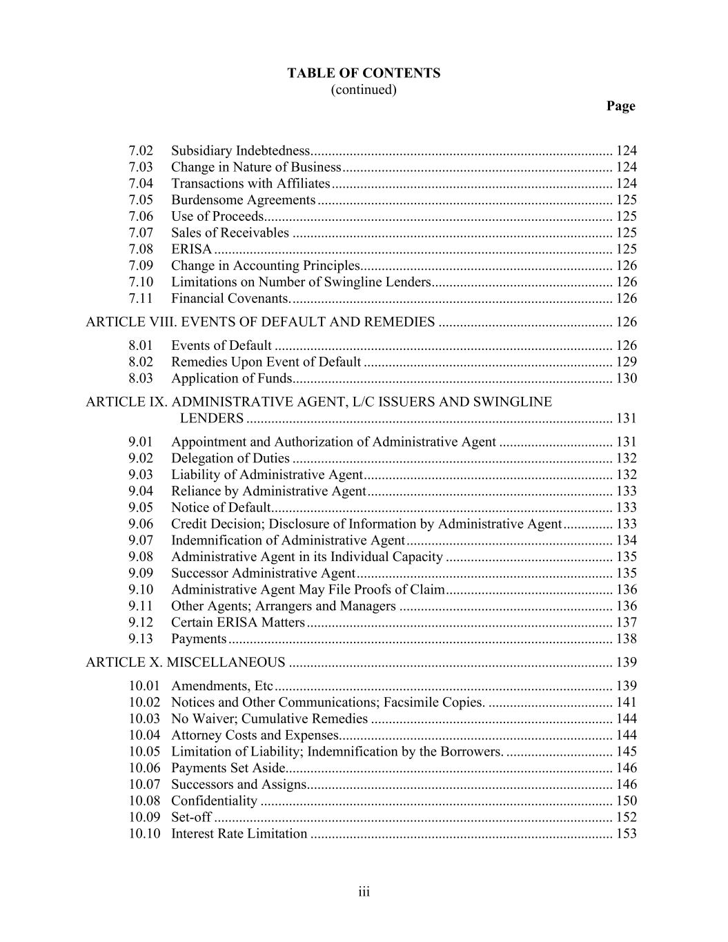 TABLE OF CONTENTS (continued) Page iii 7.02 Subsidiary Indebtedness..................................................................................... 124 7.03 Change in Nature of Business ............................................................................ 124 7.04 Transactions with Affiliates ............................................................................... 124 7.05 Burdensome Agreements ................................................................................... 125 7.06 Use of Proceeds.................................................................................................. 125 7.07 Sales of Receivables .......................................................................................... 125 7.08 ERISA ................................................................................................................ 125 7.09 Change in Accounting Principles....................................................................... 126 7.10 Limitations on Number of Swingline Lenders................................................... 126 7.11 Financial Covenants. .......................................................................................... 126 ARTICLE VIII. EVENTS OF DEFAULT AND REMEDIES ................................................. 126 8.01 Events of Default ............................................................................................... 126 8.02 Remedies Upon Event of Default ...................................................................... 129 8.03 Application of Funds.......................................................................................... 130 ARTICLE IX. ADMINISTRATIVE AGENT, L/C ISSUERS AND SWINGLINE LENDERS ....................................................................................................... 131 9.01 Appointment and Authorization of Administrative Agent ................................ 131 9.02 Delegation of Duties .......................................................................................... 132 9.03 Liability of Administrative Agent ...................................................................... 132 9.04 Reliance by Administrative Agent ..................................................................... 133 9.05 Notice of Default................................................................................................ 133 9.06 Credit Decision; Disclosure of Information by Administrative Agent .............. 133 9.07 Indemnification of Administrative Agent .......................................................... 134 9.08 Administrative Agent in its Individual Capacity ............................................... 135 9.09 Successor Administrative Agent ........................................................................ 135 9.10 Administrative Agent May File Proofs of Claim ............................................... 136 9.11 Other Agents; Arrangers and Managers ............................................................ 136 9.12 Certain ERISA Matters ...................................................................................... 137 9.13 Payments ............................................................................................................ 138 ARTICLE X. MISCELLANEOUS ........................................................................................... 139 10.01 Amendments, Etc ............................................................................................... 139 10.02 Notices and Other Communications; Facsimile Copies. ................................... 141 10.03 No Waiver; Cumulative Remedies .................................................................... 144 10.04 Attorney Costs and Expenses............................................................................. 144 10.05 Limitation of Liability; Indemnification by the Borrowers. .............................. 145 10.06 Payments Set Aside............................................................................................ 146 10.07 Successors and Assigns...................................................................................... 146 10.08 Confidentiality ................................................................................................... 150 10.09 Set-off ................................................................................................................ 152 10.10 Interest Rate Limitation ..................................................................................... 153