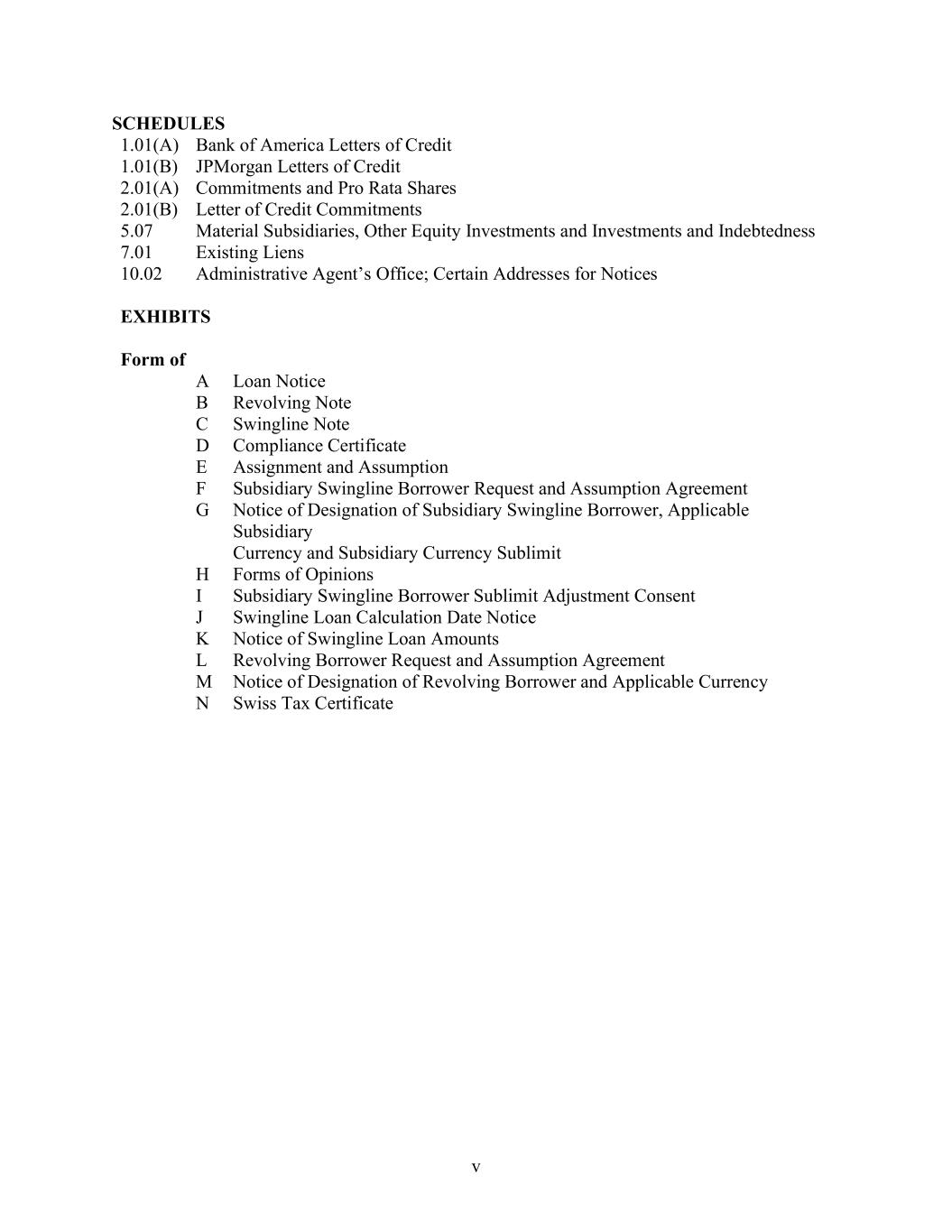 v SCHEDULES 1.01(A) 1.01(B) Bank of America Letters of Credit JPMorgan Letters of Credit 2.01(A) Commitments and Pro Rata Shares 2.01(B) Letter of Credit Commitments 5.07 Material Subsidiaries, Other Equity Investments and Investments and Indebtedness 7.01 Existing Liens 10.02 Administrative Agent’s Office; Certain Addresses for Notices EXHIBITS Form of A Loan Notice B Revolving Note C Swingline Note D Compliance Certificate E Assignment and Assumption F Subsidiary Swingline Borrower Request and Assumption Agreement G Notice of Designation of Subsidiary Swingline Borrower, Applicable Subsidiary Currency and Subsidiary Currency Sublimit H Forms of Opinions I Subsidiary Swingline Borrower Sublimit Adjustment Consent J Swingline Loan Calculation Date Notice K Notice of Swingline Loan Amounts L Revolving Borrower Request and Assumption Agreement M Notice of Designation of Revolving Borrower and Applicable Currency N Swiss Tax Certificate