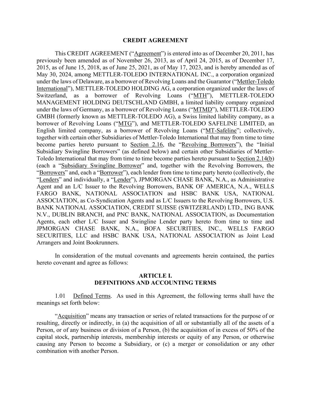 CREDIT AGREEMENT This CREDIT AGREEMENT (“Agreement”) is entered into as of December 20, 2011, has previously been amended as of November 26, 2013, as of April 24, 2015, as of December 17, 2015, as of June 15, 2018, as of June 25, 2021, as of May 17, 2023, and is hereby amended as of May 30, 2024, among METTLER-TOLEDO INTERNATIONAL INC., a corporation organized under the laws of Delaware, as a borrower of Revolving Loans and the Guarantor (“Mettler-Toledo International”), METTLER-TOLEDO HOLDING AG, a corporation organized under the laws of Switzerland, as a borrower of Revolving Loans (“MTH”), METTLER-TOLEDO MANAGEMENT HOLDING DEUTSCHLAND GMBH, a limited liability company organized under the laws of Germany, as a borrower of Revolving Loans (“MTMD”), METTLER-TOLEDO GMBH (formerly known as METTLER-TOLEDO AG), a Swiss limited liability company, as a borrower of Revolving Loans (“MTG”), and METTLER-TOLEDO SAFELINE LIMITED, an English limited company, as a borrower of Revolving Loans (“MT-Safeline”; collectively, together with certain other Subsidiaries of Mettler-Toledo International that may from time to time become parties hereto pursuant to Section 2.16, the “Revolving Borrowers”), the “Initial Subsidiary Swingline Borrowers” (as defined below) and certain other Subsidiaries of Mettler- Toledo International that may from time to time become parties hereto pursuant to Section 2.14(b) (each a “Subsidiary Swingline Borrower” and, together with the Revolving Borrowers, the “Borrowers” and, each a “Borrower”), each lender from time to time party hereto (collectively, the “Lenders” and individually, a “Lender”), JPMORGAN CHASE BANK, N.A., as Administrative Agent and an L/C Issuer to the Revolving Borrowers, BANK OF AMERICA, N.A., WELLS FARGO BANK, NATIONAL ASSOCIATION and HSBC BANK USA, NATIONAL ASSOCIATION, as Co-Syndication Agents and as L/C Issuers to the Revolving Borrowers, U.S. BANK NATIONAL ASSOCIATION, CREDIT SUISSE (SWITZERLAND) LTD., ING BANK N.V., DUBLIN BRANCH, and PNC BANK, NATIONAL ASSOCIATION, as Documentation Agents, each other L/C Issuer and Swingline Lender party hereto from time to time and JPMORGAN CHASE BANK, N.A., BOFA SECURITIES, INC., WELLS FARGO SECURITIES, LLC and HSBC BANK USA, NATIONAL ASSOCIATION as Joint Lead Arrangers and Joint Bookrunners. In consideration of the mutual covenants and agreements herein contained, the parties hereto covenant and agree as follows: ARTICLE I. DEFINITIONS AND ACCOUNTING TERMS 1.01 Defined Terms. As used in this Agreement, the following terms shall have the meanings set forth below: “Acquisition” means any transaction or series of related transactions for the purpose of or resulting, directly or indirectly, in (a) the acquisition of all or substantially all of the assets of a Person, or of any business or division of a Person, (b) the acquisition of in excess of 50% of the capital stock, partnership interests, membership interests or equity of any Person, or otherwise causing any Person to become a Subsidiary, or (c) a merger or consolidation or any other combination with another Person.