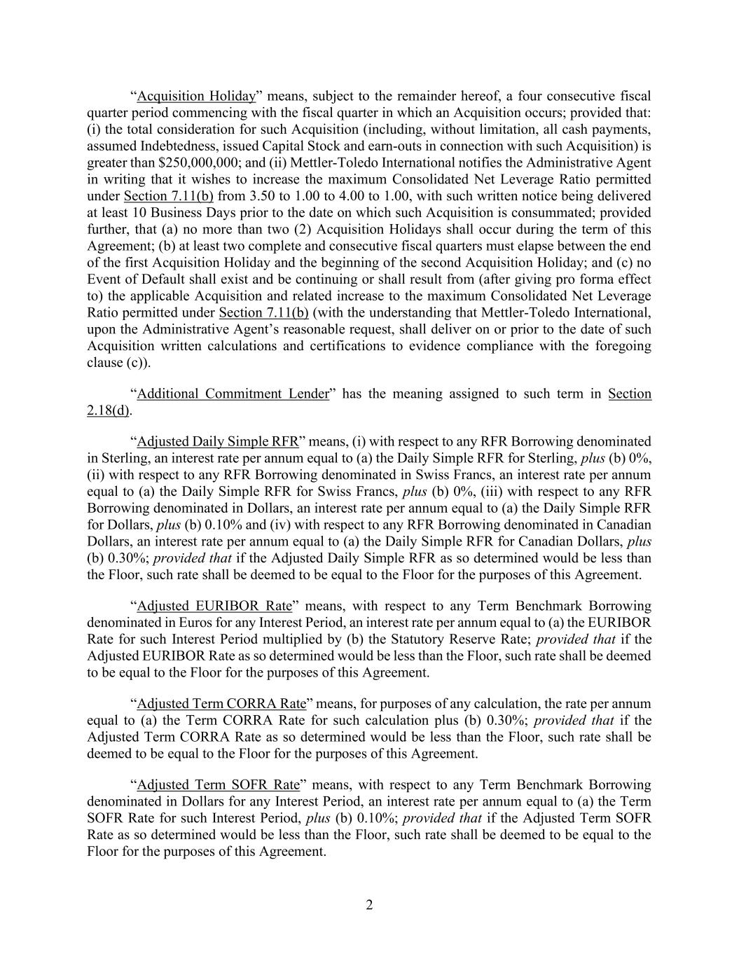 2 “Acquisition Holiday” means, subject to the remainder hereof, a four consecutive fiscal quarter period commencing with the fiscal quarter in which an Acquisition occurs; provided that: (i) the total consideration for such Acquisition (including, without limitation, all cash payments, assumed Indebtedness, issued Capital Stock and earn-outs in connection with such Acquisition) is greater than $250,000,000; and (ii) Mettler-Toledo International notifies the Administrative Agent in writing that it wishes to increase the maximum Consolidated Net Leverage Ratio permitted under Section 7.11(b) from 3.50 to 1.00 to 4.00 to 1.00, with such written notice being delivered at least 10 Business Days prior to the date on which such Acquisition is consummated; provided further, that (a) no more than two (2) Acquisition Holidays shall occur during the term of this Agreement; (b) at least two complete and consecutive fiscal quarters must elapse between the end of the first Acquisition Holiday and the beginning of the second Acquisition Holiday; and (c) no Event of Default shall exist and be continuing or shall result from (after giving pro forma effect to) the applicable Acquisition and related increase to the maximum Consolidated Net Leverage Ratio permitted under Section 7.11(b) (with the understanding that Mettler-Toledo International, upon the Administrative Agent’s reasonable request, shall deliver on or prior to the date of such Acquisition written calculations and certifications to evidence compliance with the foregoing clause (c)). “Additional Commitment Lender” has the meaning assigned to such term in Section 2.18(d). “Adjusted Daily Simple RFR” means, (i) with respect to any RFR Borrowing denominated in Sterling, an interest rate per annum equal to (a) the Daily Simple RFR for Sterling, plus (b) 0%, (ii) with respect to any RFR Borrowing denominated in Swiss Francs, an interest rate per annum equal to (a) the Daily Simple RFR for Swiss Francs, plus (b) 0%, (iii) with respect to any RFR Borrowing denominated in Dollars, an interest rate per annum equal to (a) the Daily Simple RFR for Dollars, plus (b) 0.10% and (iv) with respect to any RFR Borrowing denominated in Canadian Dollars, an interest rate per annum equal to (a) the Daily Simple RFR for Canadian Dollars, plus (b) 0.30%; provided that if the Adjusted Daily Simple RFR as so determined would be less than the Floor, such rate shall be deemed to be equal to the Floor for the purposes of this Agreement. “Adjusted EURIBOR Rate” means, with respect to any Term Benchmark Borrowing denominated in Euros for any Interest Period, an interest rate per annum equal to (a) the EURIBOR Rate for such Interest Period multiplied by (b) the Statutory Reserve Rate; provided that if the Adjusted EURIBOR Rate as so determined would be less than the Floor, such rate shall be deemed to be equal to the Floor for the purposes of this Agreement. “Adjusted Term CORRA Rate” means, for purposes of any calculation, the rate per annum equal to (a) the Term CORRA Rate for such calculation plus (b) 0.30%; provided that if the Adjusted Term CORRA Rate as so determined would be less than the Floor, such rate shall be deemed to be equal to the Floor for the purposes of this Agreement. “Adjusted Term SOFR Rate” means, with respect to any Term Benchmark Borrowing denominated in Dollars for any Interest Period, an interest rate per annum equal to (a) the Term SOFR Rate for such Interest Period, plus (b) 0.10%; provided that if the Adjusted Term SOFR Rate as so determined would be less than the Floor, such rate shall be deemed to be equal to the Floor for the purposes of this Agreement.