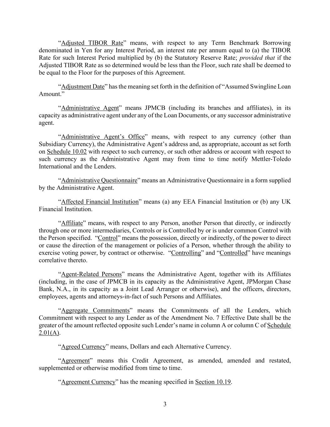 3 “Adjusted TIBOR Rate” means, with respect to any Term Benchmark Borrowing denominated in Yen for any Interest Period, an interest rate per annum equal to (a) the TIBOR Rate for such Interest Period multiplied by (b) the Statutory Reserve Rate; provided that if the Adjusted TIBOR Rate as so determined would be less than the Floor, such rate shall be deemed to be equal to the Floor for the purposes of this Agreement. “Adjustment Date” has the meaning set forth in the definition of “Assumed Swingline Loan Amount.” “Administrative Agent” means JPMCB (including its branches and affiliates), in its capacity as administrative agent under any of the Loan Documents, or any successor administrative agent. “Administrative Agent’s Office” means, with respect to any currency (other than Subsidiary Currency), the Administrative Agent’s address and, as appropriate, account as set forth on Schedule 10.02 with respect to such currency, or such other address or account with respect to such currency as the Administrative Agent may from time to time notify Mettler-Toledo International and the Lenders. “Administrative Questionnaire” means an Administrative Questionnaire in a form supplied by the Administrative Agent. “Affected Financial Institution” means (a) any EEA Financial Institution or (b) any UK Financial Institution. “Affiliate” means, with respect to any Person, another Person that directly, or indirectly through one or more intermediaries, Controls or is Controlled by or is under common Control with the Person specified. “Control” means the possession, directly or indirectly, of the power to direct or cause the direction of the management or policies of a Person, whether through the ability to exercise voting power, by contract or otherwise. “Controlling” and “Controlled” have meanings correlative thereto. “Agent-Related Persons” means the Administrative Agent, together with its Affiliates (including, in the case of JPMCB in its capacity as the Administrative Agent, JPMorgan Chase Bank, N.A., in its capacity as a Joint Lead Arranger or otherwise), and the officers, directors, employees, agents and attorneys-in-fact of such Persons and Affiliates. “Aggregate Commitments” means the Commitments of all the Lenders, which Commitment with respect to any Lender as of the Amendment No. 7 Effective Date shall be the greater of the amount reflected opposite such Lender’s name in column A or column C of Schedule 2.01(A). “Agreed Currency” means, Dollars and each Alternative Currency. “Agreement” means this Credit Agreement, as amended, amended and restated, supplemented or otherwise modified from time to time. “Agreement Currency” has the meaning specified in Section 10.19.