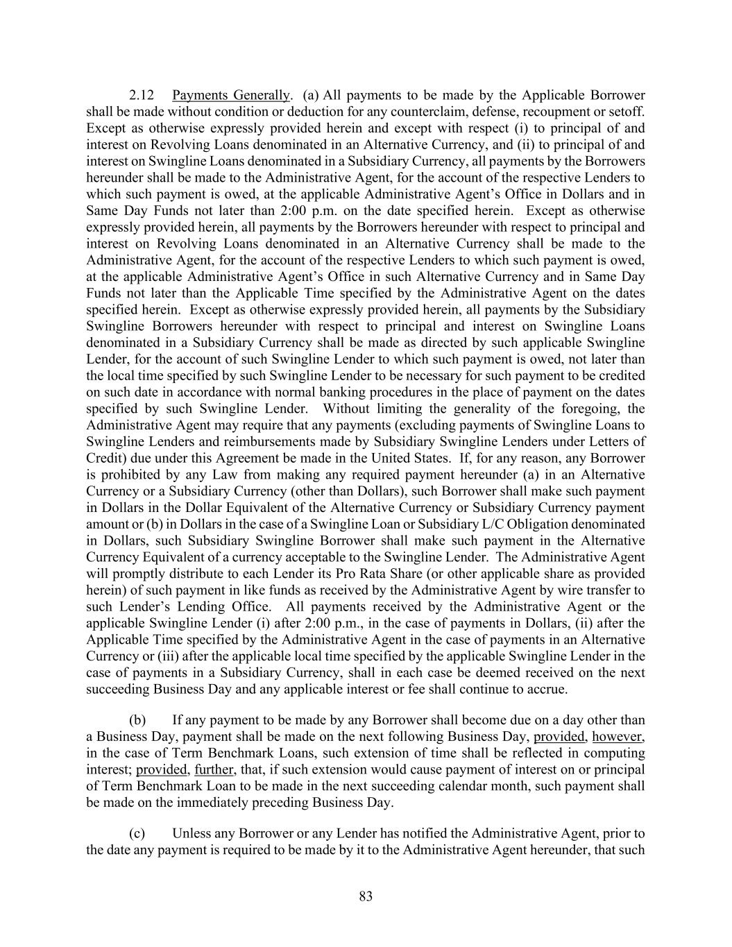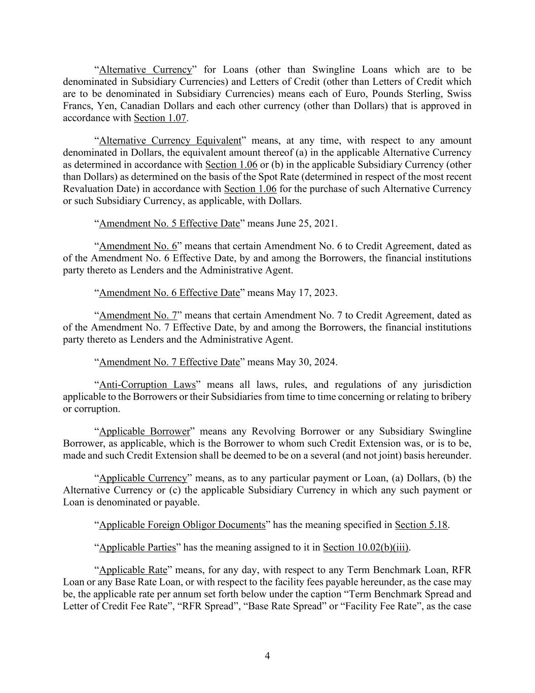 4 “Alternative Currency” for Loans (other than Swingline Loans which are to be denominated in Subsidiary Currencies) and Letters of Credit (other than Letters of Credit which are to be denominated in Subsidiary Currencies) means each of Euro, Pounds Sterling, Swiss Francs, Yen, Canadian Dollars and each other currency (other than Dollars) that is approved in accordance with Section 1.07. “Alternative Currency Equivalent” means, at any time, with respect to any amount denominated in Dollars, the equivalent amount thereof (a) in the applicable Alternative Currency as determined in accordance with Section 1.06 or (b) in the applicable Subsidiary Currency (other than Dollars) as determined on the basis of the Spot Rate (determined in respect of the most recent Revaluation Date) in accordance with Section 1.06 for the purchase of such Alternative Currency or such Subsidiary Currency, as applicable, with Dollars. “Amendment No. 5 Effective Date” means June 25, 2021. “Amendment No. 6” means that certain Amendment No. 6 to Credit Agreement, dated as of the Amendment No. 6 Effective Date, by and among the Borrowers, the financial institutions party thereto as Lenders and the Administrative Agent. “Amendment No. 6 Effective Date” means May 17, 2023. “Amendment No. 7” means that certain Amendment No. 7 to Credit Agreement, dated as of the Amendment No. 7 Effective Date, by and among the Borrowers, the financial institutions party thereto as Lenders and the Administrative Agent. “Amendment No. 7 Effective Date” means May 30, 2024. “Anti-Corruption Laws” means all laws, rules, and regulations of any jurisdiction applicable to the Borrowers or their Subsidiaries from time to time concerning or relating to bribery or corruption. “Applicable Borrower” means any Revolving Borrower or any Subsidiary Swingline Borrower, as applicable, which is the Borrower to whom such Credit Extension was, or is to be, made and such Credit Extension shall be deemed to be on a several (and not joint) basis hereunder. “Applicable Currency” means, as to any particular payment or Loan, (a) Dollars, (b) the Alternative Currency or (c) the applicable Subsidiary Currency in which any such payment or Loan is denominated or payable. “Applicable Foreign Obligor Documents” has the meaning specified in Section 5.18. “Applicable Parties” has the meaning assigned to it in Section 10.02(b)(iii). “Applicable Rate” means, for any day, with respect to any Term Benchmark Loan, RFR Loan or any Base Rate Loan, or with respect to the facility fees payable hereunder, as the case may be, the applicable rate per annum set forth below under the caption “Term Benchmark Spread and Letter of Credit Fee Rate”, “RFR Spread”, “Base Rate Spread” or “Facility Fee Rate”, as the case