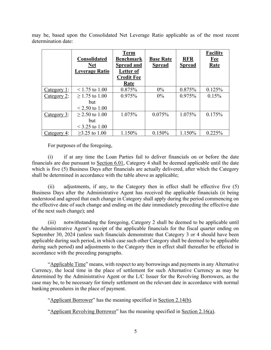 5 may be, based upon the Consolidated Net Leverage Ratio applicable as of the most recent determination date: Consolidated Net Leverage Ratio Term Benchmark Spread and Letter of Credit Fee Rate Base Rate Spread RFR Spread Facility Fee Rate Category 1: < 1.75 to 1.00 0.875% 0% 0.875% 0.125% Category 2: ≥ 1.75 to 1.00 but < 2.50 to 1.00 0.975% 0% 0.975% 0.15% Category 3: ≥ 2.50 to 1.00 but < 3.25 to 1.00 1.075% 0.075% 1.075% 0.175% Category 4: ≥3.25 to 1.00 1.150% 0.150% 1.150% 0.225% For purposes of the foregoing, (i) if at any time the Loan Parties fail to deliver financials on or before the date financials are due pursuant to Section 6.01, Category 4 shall be deemed applicable until the date which is five (5) Business Days after financials are actually delivered, after which the Category shall be determined in accordance with the table above as applicable; (ii) adjustments, if any, to the Category then in effect shall be effective five (5) Business Days after the Administrative Agent has received the applicable financials (it being understood and agreed that each change in Category shall apply during the period commencing on the effective date of such change and ending on the date immediately preceding the effective date of the next such change); and (iii) notwithstanding the foregoing, Category 2 shall be deemed to be applicable until the Administrative Agent’s receipt of the applicable financials for the fiscal quarter ending on September 30, 2024 (unless such financials demonstrate that Category 3 or 4 should have been applicable during such period, in which case such other Category shall be deemed to be applicable during such period) and adjustments to the Category then in effect shall thereafter be effected in accordance with the preceding paragraphs. “Applicable Time” means, with respect to any borrowings and payments in any Alternative Currency, the local time in the place of settlement for such Alternative Currency as may be determined by the Administrative Agent or the L/C Issuer for the Revolving Borrowers, as the case may be, to be necessary for timely settlement on the relevant date in accordance with normal banking procedures in the place of payment. “Applicant Borrower” has the meaning specified in Section 2.14(b). “Applicant Revolving Borrower” has the meaning specified in Section 2.16(a).