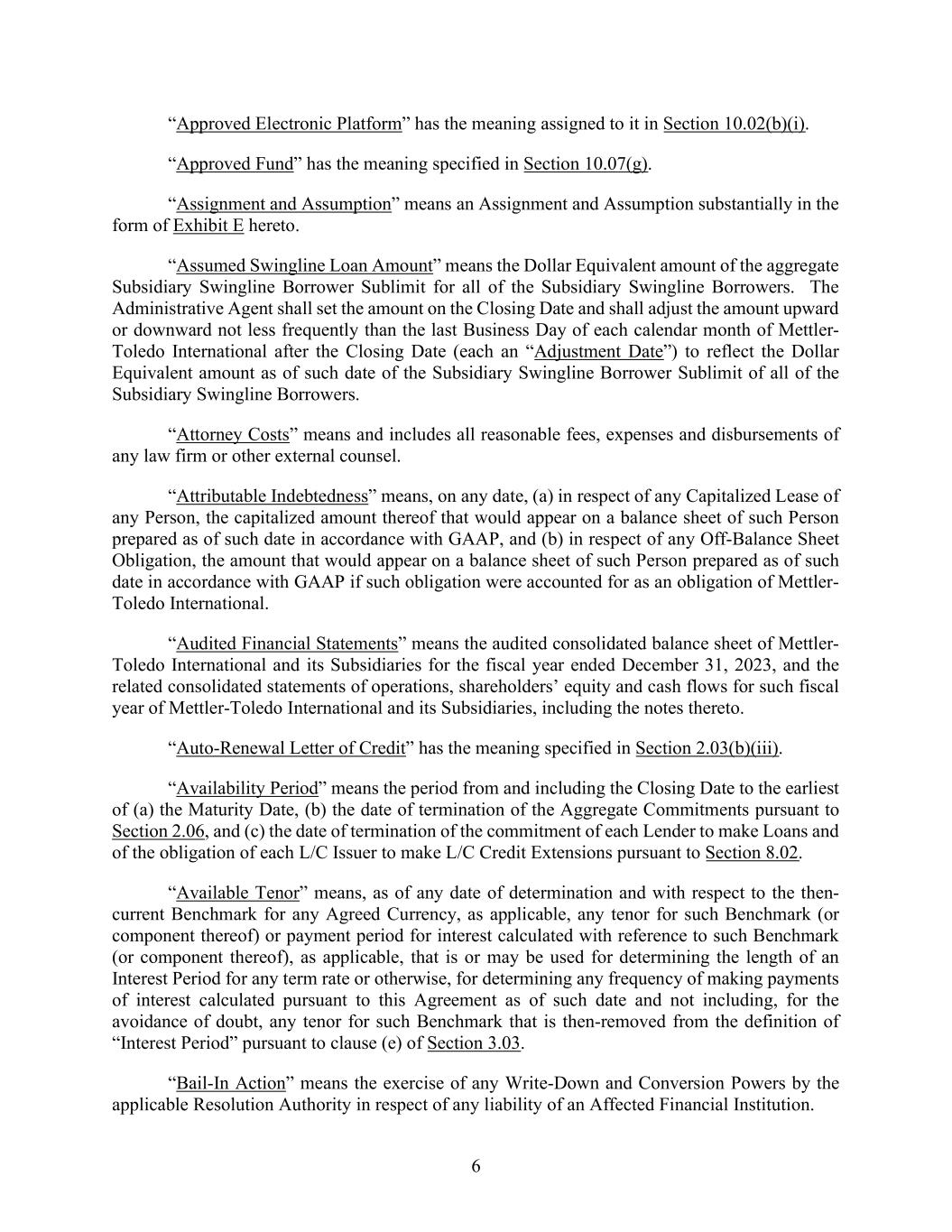 6 “Approved Electronic Platform” has the meaning assigned to it in Section 10.02(b)(i). “Approved Fund” has the meaning specified in Section 10.07(g). “Assignment and Assumption” means an Assignment and Assumption substantially in the form of Exhibit E hereto. “Assumed Swingline Loan Amount” means the Dollar Equivalent amount of the aggregate Subsidiary Swingline Borrower Sublimit for all of the Subsidiary Swingline Borrowers. The Administrative Agent shall set the amount on the Closing Date and shall adjust the amount upward or downward not less frequently than the last Business Day of each calendar month of Mettler- Toledo International after the Closing Date (each an “Adjustment Date”) to reflect the Dollar Equivalent amount as of such date of the Subsidiary Swingline Borrower Sublimit of all of the Subsidiary Swingline Borrowers. “Attorney Costs” means and includes all reasonable fees, expenses and disbursements of any law firm or other external counsel. “Attributable Indebtedness” means, on any date, (a) in respect of any Capitalized Lease of any Person, the capitalized amount thereof that would appear on a balance sheet of such Person prepared as of such date in accordance with GAAP, and (b) in respect of any Off-Balance Sheet Obligation, the amount that would appear on a balance sheet of such Person prepared as of such date in accordance with GAAP if such obligation were accounted for as an obligation of Mettler- Toledo International. “Audited Financial Statements” means the audited consolidated balance sheet of Mettler- Toledo International and its Subsidiaries for the fiscal year ended December 31, 2023, and the related consolidated statements of operations, shareholders’ equity and cash flows for such fiscal year of Mettler-Toledo International and its Subsidiaries, including the notes thereto. “Auto-Renewal Letter of Credit” has the meaning specified in Section 2.03(b)(iii). “Availability Period” means the period from and including the Closing Date to the earliest of (a) the Maturity Date, (b) the date of termination of the Aggregate Commitments pursuant to Section 2.06, and (c) the date of termination of the commitment of each Lender to make Loans and of the obligation of each L/C Issuer to make L/C Credit Extensions pursuant to Section 8.02. “Available Tenor” means, as of any date of determination and with respect to the then- current Benchmark for any Agreed Currency, as applicable, any tenor for such Benchmark (or component thereof) or payment period for interest calculated with reference to such Benchmark (or component thereof), as applicable, that is or may be used for determining the length of an Interest Period for any term rate or otherwise, for determining any frequency of making payments of interest calculated pursuant to this Agreement as of such date and not including, for the avoidance of doubt, any tenor for such Benchmark that is then-removed from the definition of “Interest Period” pursuant to clause (e) of Section 3.03. “Bail-In Action” means the exercise of any Write-Down and Conversion Powers by the applicable Resolution Authority in respect of any liability of an Affected Financial Institution.