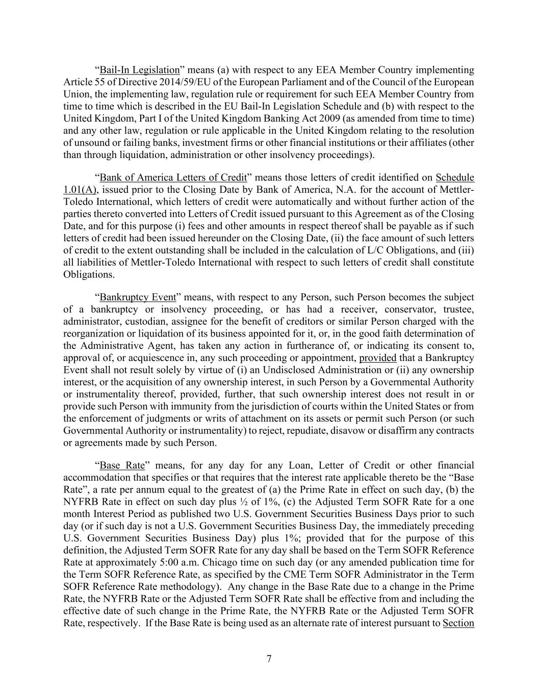 7 “Bail-In Legislation” means (a) with respect to any EEA Member Country implementing Article 55 of Directive 2014/59/EU of the European Parliament and of the Council of the European Union, the implementing law, regulation rule or requirement for such EEA Member Country from time to time which is described in the EU Bail-In Legislation Schedule and (b) with respect to the United Kingdom, Part I of the United Kingdom Banking Act 2009 (as amended from time to time) and any other law, regulation or rule applicable in the United Kingdom relating to the resolution of unsound or failing banks, investment firms or other financial institutions or their affiliates (other than through liquidation, administration or other insolvency proceedings). “Bank of America Letters of Credit” means those letters of credit identified on Schedule 1.01(A), issued prior to the Closing Date by Bank of America, N.A. for the account of Mettler- Toledo International, which letters of credit were automatically and without further action of the parties thereto converted into Letters of Credit issued pursuant to this Agreement as of the Closing Date, and for this purpose (i) fees and other amounts in respect thereof shall be payable as if such letters of credit had been issued hereunder on the Closing Date, (ii) the face amount of such letters of credit to the extent outstanding shall be included in the calculation of L/C Obligations, and (iii) all liabilities of Mettler-Toledo International with respect to such letters of credit shall constitute Obligations. “Bankruptcy Event” means, with respect to any Person, such Person becomes the subject of a bankruptcy or insolvency proceeding, or has had a receiver, conservator, trustee, administrator, custodian, assignee for the benefit of creditors or similar Person charged with the reorganization or liquidation of its business appointed for it, or, in the good faith determination of the Administrative Agent, has taken any action in furtherance of, or indicating its consent to, approval of, or acquiescence in, any such proceeding or appointment, provided that a Bankruptcy Event shall not result solely by virtue of (i) an Undisclosed Administration or (ii) any ownership interest, or the acquisition of any ownership interest, in such Person by a Governmental Authority or instrumentality thereof, provided, further, that such ownership interest does not result in or provide such Person with immunity from the jurisdiction of courts within the United States or from the enforcement of judgments or writs of attachment on its assets or permit such Person (or such Governmental Authority or instrumentality) to reject, repudiate, disavow or disaffirm any contracts or agreements made by such Person. “Base Rate” means, for any day for any Loan, Letter of Credit or other financial accommodation that specifies or that requires that the interest rate applicable thereto be the “Base Rate”, a rate per annum equal to the greatest of (a) the Prime Rate in effect on such day, (b) the NYFRB Rate in effect on such day plus ½ of 1%, (c) the Adjusted Term SOFR Rate for a one month Interest Period as published two U.S. Government Securities Business Days prior to such day (or if such day is not a U.S. Government Securities Business Day, the immediately preceding U.S. Government Securities Business Day) plus 1%; provided that for the purpose of this definition, the Adjusted Term SOFR Rate for any day shall be based on the Term SOFR Reference Rate at approximately 5:00 a.m. Chicago time on such day (or any amended publication time for the Term SOFR Reference Rate, as specified by the CME Term SOFR Administrator in the Term SOFR Reference Rate methodology). Any change in the Base Rate due to a change in the Prime Rate, the NYFRB Rate or the Adjusted Term SOFR Rate shall be effective from and including the effective date of such change in the Prime Rate, the NYFRB Rate or the Adjusted Term SOFR Rate, respectively. If the Base Rate is being used as an alternate rate of interest pursuant to Section