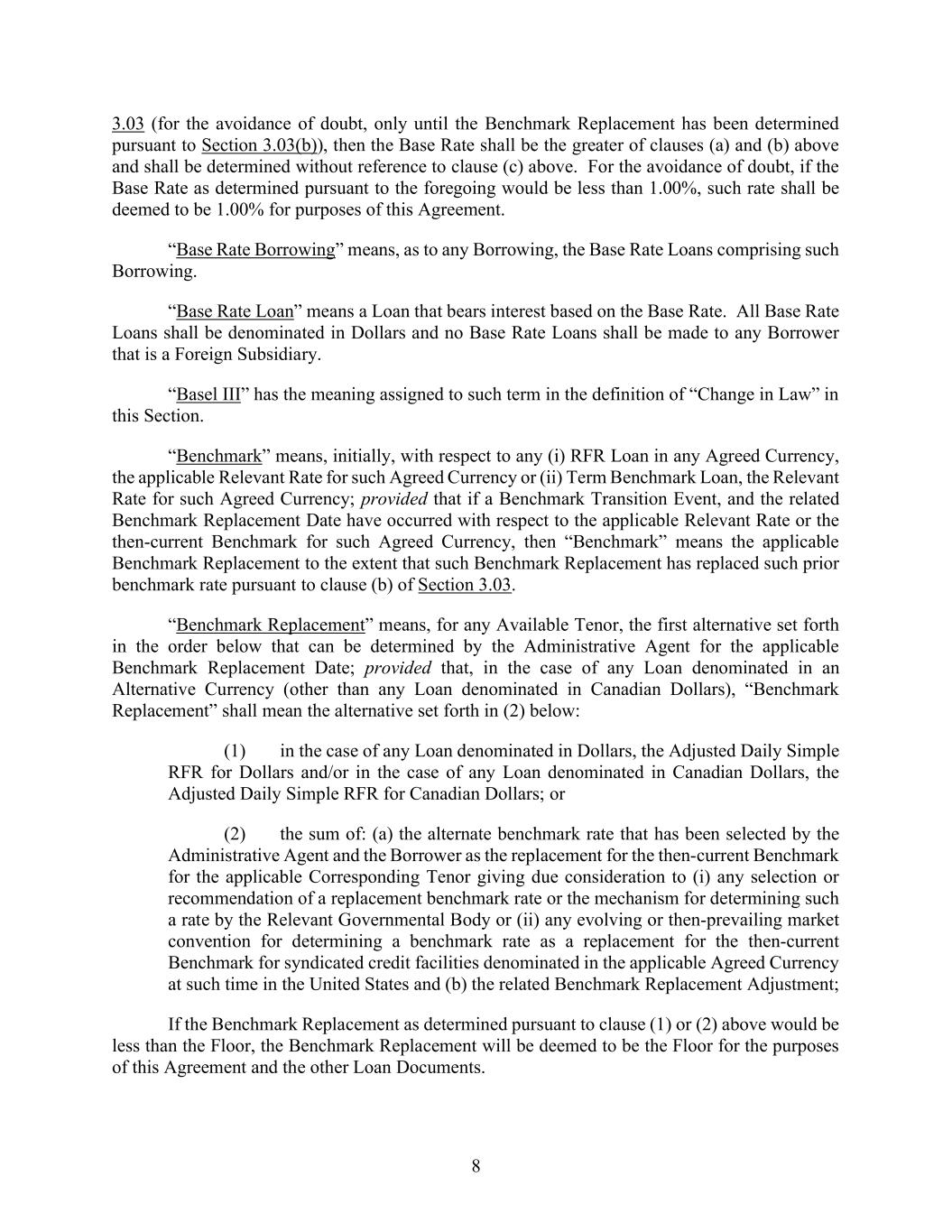 8 3.03 (for the avoidance of doubt, only until the Benchmark Replacement has been determined pursuant to Section 3.03(b)), then the Base Rate shall be the greater of clauses (a) and (b) above and shall be determined without reference to clause (c) above. For the avoidance of doubt, if the Base Rate as determined pursuant to the foregoing would be less than 1.00%, such rate shall be deemed to be 1.00% for purposes of this Agreement. “Base Rate Borrowing” means, as to any Borrowing, the Base Rate Loans comprising such Borrowing. “Base Rate Loan” means a Loan that bears interest based on the Base Rate. All Base Rate Loans shall be denominated in Dollars and no Base Rate Loans shall be made to any Borrower that is a Foreign Subsidiary. “Basel III” has the meaning assigned to such term in the definition of “Change in Law” in this Section. “Benchmark” means, initially, with respect to any (i) RFR Loan in any Agreed Currency, the applicable Relevant Rate for such Agreed Currency or (ii) Term Benchmark Loan, the Relevant Rate for such Agreed Currency; provided that if a Benchmark Transition Event, and the related Benchmark Replacement Date have occurred with respect to the applicable Relevant Rate or the then-current Benchmark for such Agreed Currency, then “Benchmark” means the applicable Benchmark Replacement to the extent that such Benchmark Replacement has replaced such prior benchmark rate pursuant to clause (b) of Section 3.03. “Benchmark Replacement” means, for any Available Tenor, the first alternative set forth in the order below that can be determined by the Administrative Agent for the applicable Benchmark Replacement Date; provided that, in the case of any Loan denominated in an Alternative Currency (other than any Loan denominated in Canadian Dollars), “Benchmark Replacement” shall mean the alternative set forth in (2) below: (1) in the case of any Loan denominated in Dollars, the Adjusted Daily Simple RFR for Dollars and/or in the case of any Loan denominated in Canadian Dollars, the Adjusted Daily Simple RFR for Canadian Dollars; or (2) the sum of: (a) the alternate benchmark rate that has been selected by the Administrative Agent and the Borrower as the replacement for the then-current Benchmark for the applicable Corresponding Tenor giving due consideration to (i) any selection or recommendation of a replacement benchmark rate or the mechanism for determining such a rate by the Relevant Governmental Body or (ii) any evolving or then-prevailing market convention for determining a benchmark rate as a replacement for the then-current Benchmark for syndicated credit facilities denominated in the applicable Agreed Currency at such time in the United States and (b) the related Benchmark Replacement Adjustment; If the Benchmark Replacement as determined pursuant to clause (1) or (2) above would be less than the Floor, the Benchmark Replacement will be deemed to be the Floor for the purposes of this Agreement and the other Loan Documents.