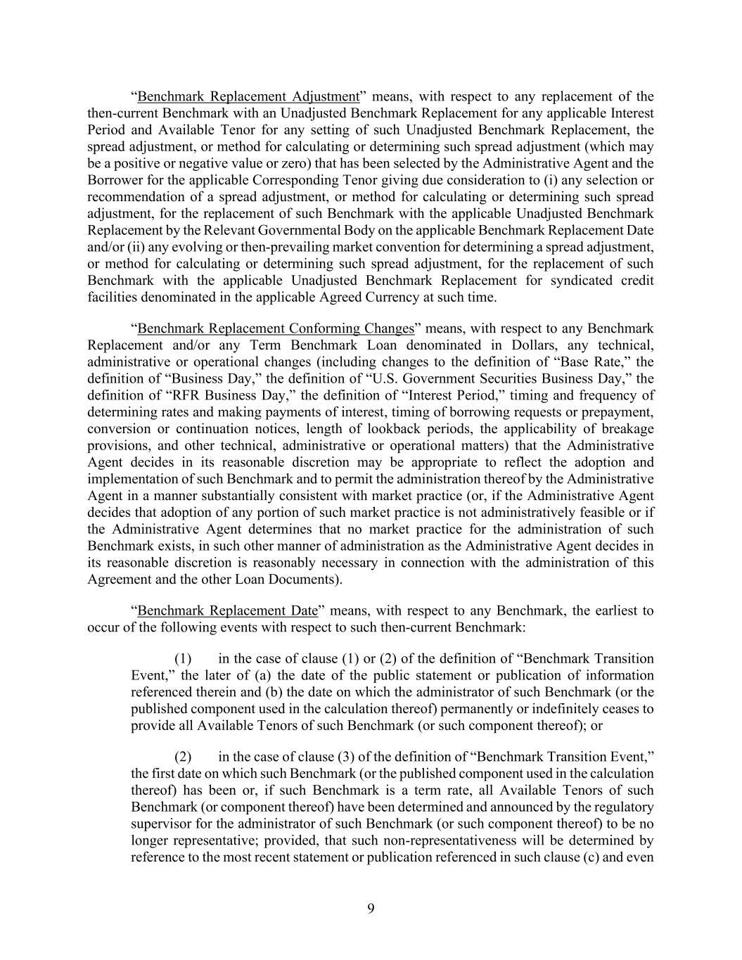 9 “Benchmark Replacement Adjustment” means, with respect to any replacement of the then-current Benchmark with an Unadjusted Benchmark Replacement for any applicable Interest Period and Available Tenor for any setting of such Unadjusted Benchmark Replacement, the spread adjustment, or method for calculating or determining such spread adjustment (which may be a positive or negative value or zero) that has been selected by the Administrative Agent and the Borrower for the applicable Corresponding Tenor giving due consideration to (i) any selection or recommendation of a spread adjustment, or method for calculating or determining such spread adjustment, for the replacement of such Benchmark with the applicable Unadjusted Benchmark Replacement by the Relevant Governmental Body on the applicable Benchmark Replacement Date and/or (ii) any evolving or then-prevailing market convention for determining a spread adjustment, or method for calculating or determining such spread adjustment, for the replacement of such Benchmark with the applicable Unadjusted Benchmark Replacement for syndicated credit facilities denominated in the applicable Agreed Currency at such time. “Benchmark Replacement Conforming Changes” means, with respect to any Benchmark Replacement and/or any Term Benchmark Loan denominated in Dollars, any technical, administrative or operational changes (including changes to the definition of “Base Rate,” the definition of “Business Day,” the definition of “U.S. Government Securities Business Day,” the definition of “RFR Business Day,” the definition of “Interest Period,” timing and frequency of determining rates and making payments of interest, timing of borrowing requests or prepayment, conversion or continuation notices, length of lookback periods, the applicability of breakage provisions, and other technical, administrative or operational matters) that the Administrative Agent decides in its reasonable discretion may be appropriate to reflect the adoption and implementation of such Benchmark and to permit the administration thereof by the Administrative Agent in a manner substantially consistent with market practice (or, if the Administrative Agent decides that adoption of any portion of such market practice is not administratively feasible or if the Administrative Agent determines that no market practice for the administration of such Benchmark exists, in such other manner of administration as the Administrative Agent decides in its reasonable discretion is reasonably necessary in connection with the administration of this Agreement and the other Loan Documents). “Benchmark Replacement Date” means, with respect to any Benchmark, the earliest to occur of the following events with respect to such then-current Benchmark: (1) in the case of clause (1) or (2) of the definition of “Benchmark Transition Event,” the later of (a) the date of the public statement or publication of information referenced therein and (b) the date on which the administrator of such Benchmark (or the published component used in the calculation thereof) permanently or indefinitely ceases to provide all Available Tenors of such Benchmark (or such component thereof); or (2) in the case of clause (3) of the definition of “Benchmark Transition Event,” the first date on which such Benchmark (or the published component used in the calculation thereof) has been or, if such Benchmark is a term rate, all Available Tenors of such Benchmark (or component thereof) have been determined and announced by the regulatory supervisor for the administrator of such Benchmark (or such component thereof) to be no longer representative; provided, that such non-representativeness will be determined by reference to the most recent statement or publication referenced in such clause (c) and even