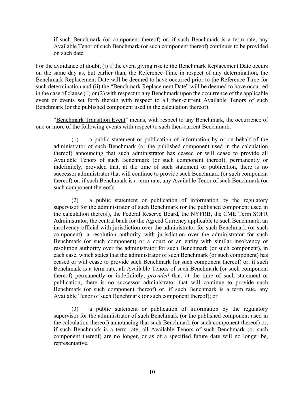 10 if such Benchmark (or component thereof) or, if such Benchmark is a term rate, any Available Tenor of such Benchmark (or such component thereof) continues to be provided on such date. For the avoidance of doubt, (i) if the event giving rise to the Benchmark Replacement Date occurs on the same day as, but earlier than, the Reference Time in respect of any determination, the Benchmark Replacement Date will be deemed to have occurred prior to the Reference Time for such determination and (ii) the “Benchmark Replacement Date” will be deemed to have occurred in the case of clause (1) or (2) with respect to any Benchmark upon the occurrence of the applicable event or events set forth therein with respect to all then-current Available Tenors of such Benchmark (or the published component used in the calculation thereof). “Benchmark Transition Event” means, with respect to any Benchmark, the occurrence of one or more of the following events with respect to such then-current Benchmark: (1) a public statement or publication of information by or on behalf of the administrator of such Benchmark (or the published component used in the calculation thereof) announcing that such administrator has ceased or will cease to provide all Available Tenors of such Benchmark (or such component thereof), permanently or indefinitely, provided that, at the time of such statement or publication, there is no successor administrator that will continue to provide such Benchmark (or such component thereof) or, if such Benchmark is a term rate, any Available Tenor of such Benchmark (or such component thereof); (2) a public statement or publication of information by the regulatory supervisor for the administrator of such Benchmark (or the published component used in the calculation thereof), the Federal Reserve Board, the NYFRB, the CME Term SOFR Administrator, the central bank for the Agreed Currency applicable to such Benchmark, an insolvency official with jurisdiction over the administrator for such Benchmark (or such component), a resolution authority with jurisdiction over the administrator for such Benchmark (or such component) or a court or an entity with similar insolvency or resolution authority over the administrator for such Benchmark (or such component), in each case, which states that the administrator of such Benchmark (or such component) has ceased or will cease to provide such Benchmark (or such component thereof) or, if such Benchmark is a term rate, all Available Tenors of such Benchmark (or such component thereof) permanently or indefinitely; provided that, at the time of such statement or publication, there is no successor administrator that will continue to provide such Benchmark (or such component thereof) or, if such Benchmark is a term rate, any Available Tenor of such Benchmark (or such component thereof); or (3) a public statement or publication of information by the regulatory supervisor for the administrator of such Benchmark (or the published component used in the calculation thereof) announcing that such Benchmark (or such component thereof) or, if such Benchmark is a term rate, all Available Tenors of such Benchmark (or such component thereof) are no longer, or as of a specified future date will no longer be, representative.