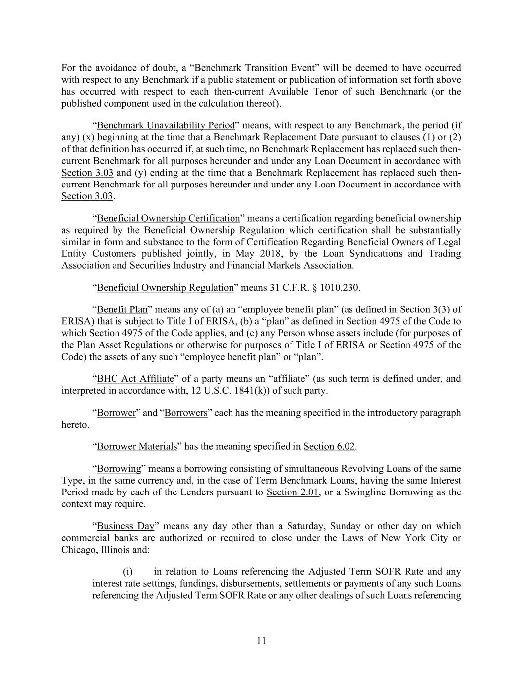 11 For the avoidance of doubt, a “Benchmark Transition Event” will be deemed to have occurred with respect to any Benchmark if a public statement or publication of information set forth above has occurred with respect to each then-current Available Tenor of such Benchmark (or the published component used in the calculation thereof). “Benchmark Unavailability Period” means, with respect to any Benchmark, the period (if any) (x) beginning at the time that a Benchmark Replacement Date pursuant to clauses (1) or (2) of that definition has occurred if, at such time, no Benchmark Replacement has replaced such then- current Benchmark for all purposes hereunder and under any Loan Document in accordance with Section 3.03 and (y) ending at the time that a Benchmark Replacement has replaced such then- current Benchmark for all purposes hereunder and under any Loan Document in accordance with Section 3.03. “Beneficial Ownership Certification” means a certification regarding beneficial ownership as required by the Beneficial Ownership Regulation which certification shall be substantially similar in form and substance to the form of Certification Regarding Beneficial Owners of Legal Entity Customers published jointly, in May 2018, by the Loan Syndications and Trading Association and Securities Industry and Financial Markets Association. “Beneficial Ownership Regulation” means 31 C.F.R. § 1010.230. “Benefit Plan” means any of (a) an “employee benefit plan” (as defined in Section 3(3) of ERISA) that is subject to Title I of ERISA, (b) a “plan” as defined in Section 4975 of the Code to which Section 4975 of the Code applies, and (c) any Person whose assets include (for purposes of the Plan Asset Regulations or otherwise for purposes of Title I of ERISA or Section 4975 of the Code) the assets of any such “employee benefit plan” or “plan”. “BHC Act Affiliate” of a party means an “affiliate” (as such term is defined under, and interpreted in accordance with, 12 U.S.C. 1841(k)) of such party. “Borrower” and “Borrowers” each has the meaning specified in the introductory paragraph hereto. “Borrower Materials” has the meaning specified in Section 6.02. “Borrowing” means a borrowing consisting of simultaneous Revolving Loans of the same Type, in the same currency and, in the case of Term Benchmark Loans, having the same Interest Period made by each of the Lenders pursuant to Section 2.01, or a Swingline Borrowing as the context may require. “Business Day” means any day other than a Saturday, Sunday or other day on which commercial banks are authorized or required to close under the Laws of New York City or Chicago, Illinois and: (i) in relation to Loans referencing the Adjusted Term SOFR Rate and any interest rate settings, fundings, disbursements, settlements or payments of any such Loans referencing the Adjusted Term SOFR Rate or any other dealings of such Loans referencing