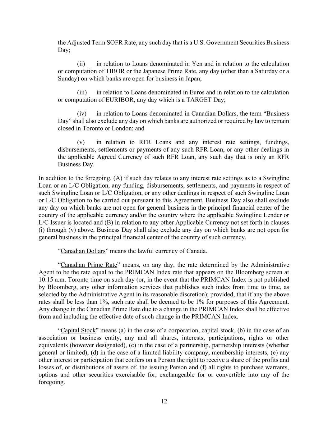 12 the Adjusted Term SOFR Rate, any such day that is a U.S. Government Securities Business Day; (ii) in relation to Loans denominated in Yen and in relation to the calculation or computation of TIBOR or the Japanese Prime Rate, any day (other than a Saturday or a Sunday) on which banks are open for business in Japan; (iii) in relation to Loans denominated in Euros and in relation to the calculation or computation of EURIBOR, any day which is a TARGET Day; (iv) in relation to Loans denominated in Canadian Dollars, the term “Business Day” shall also exclude any day on which banks are authorized or required by law to remain closed in Toronto or London; and (v) in relation to RFR Loans and any interest rate settings, fundings, disbursements, settlements or payments of any such RFR Loan, or any other dealings in the applicable Agreed Currency of such RFR Loan, any such day that is only an RFR Business Day. In addition to the foregoing, (A) if such day relates to any interest rate settings as to a Swingline Loan or an L/C Obligation, any funding, disbursements, settlements, and payments in respect of such Swingline Loan or L/C Obligation, or any other dealings in respect of such Swingline Loan or L/C Obligation to be carried out pursuant to this Agreement, Business Day also shall exclude any day on which banks are not open for general business in the principal financial center of the country of the applicable currency and/or the country where the applicable Swingline Lender or L/C Issuer is located and (B) in relation to any other Applicable Currency not set forth in clauses (i) through (v) above, Business Day shall also exclude any day on which banks are not open for general business in the principal financial center of the country of such currency. “Canadian Dollars” means the lawful currency of Canada. “Canadian Prime Rate” means, on any day, the rate determined by the Administrative Agent to be the rate equal to the PRIMCAN Index rate that appears on the Bloomberg screen at 10:15 a.m. Toronto time on such day (or, in the event that the PRIMCAN Index is not published by Bloomberg, any other information services that publishes such index from time to time, as selected by the Administrative Agent in its reasonable discretion); provided, that if any the above rates shall be less than 1%, such rate shall be deemed to be 1% for purposes of this Agreement. Any change in the Canadian Prime Rate due to a change in the PRIMCAN Index shall be effective from and including the effective date of such change in the PRIMCAN Index. “Capital Stock” means (a) in the case of a corporation, capital stock, (b) in the case of an association or business entity, any and all shares, interests, participations, rights or other equivalents (however designated), (c) in the case of a partnership, partnership interests (whether general or limited), (d) in the case of a limited liability company, membership interests, (e) any other interest or participation that confers on a Person the right to receive a share of the profits and losses of, or distributions of assets of, the issuing Person and (f) all rights to purchase warrants, options and other securities exercisable for, exchangeable for or convertible into any of the foregoing.